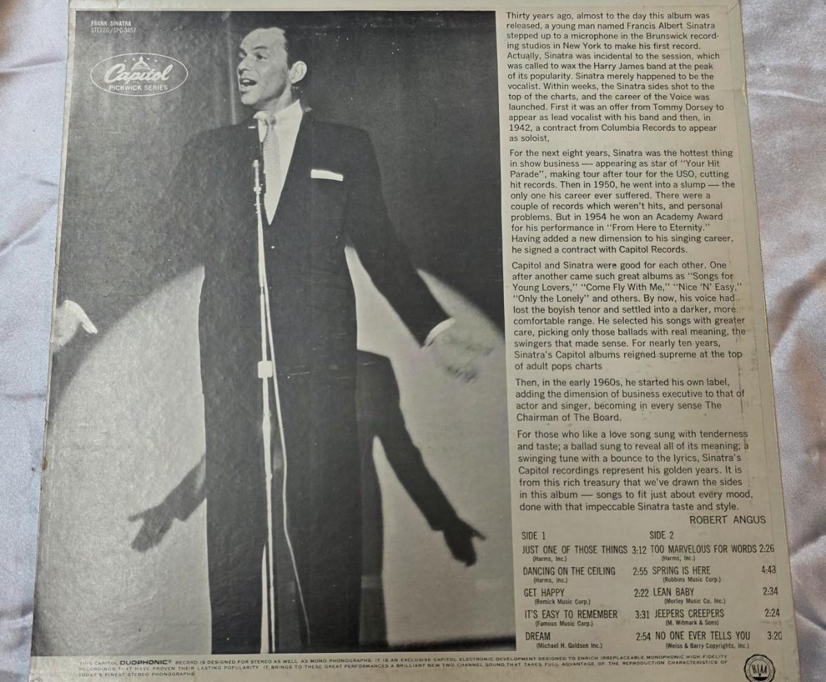 Issued as part of the Capitol Pickwick Series, this stereo pressing features a carefully curated tracklist including beloved selections such as “Dancing on the Ceiling,” “Get Happy,” “It’s Easy to Remember,” and the title track “Just One of Those Things.” The album highlights Sinatra’s ability to balance swing and sentiment, making it a rewarding listen from start to finish for fans of classic vocal jazz and traditional pop.