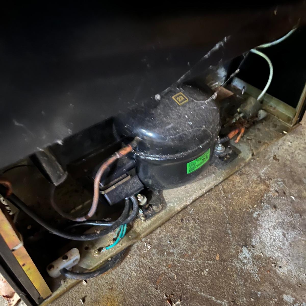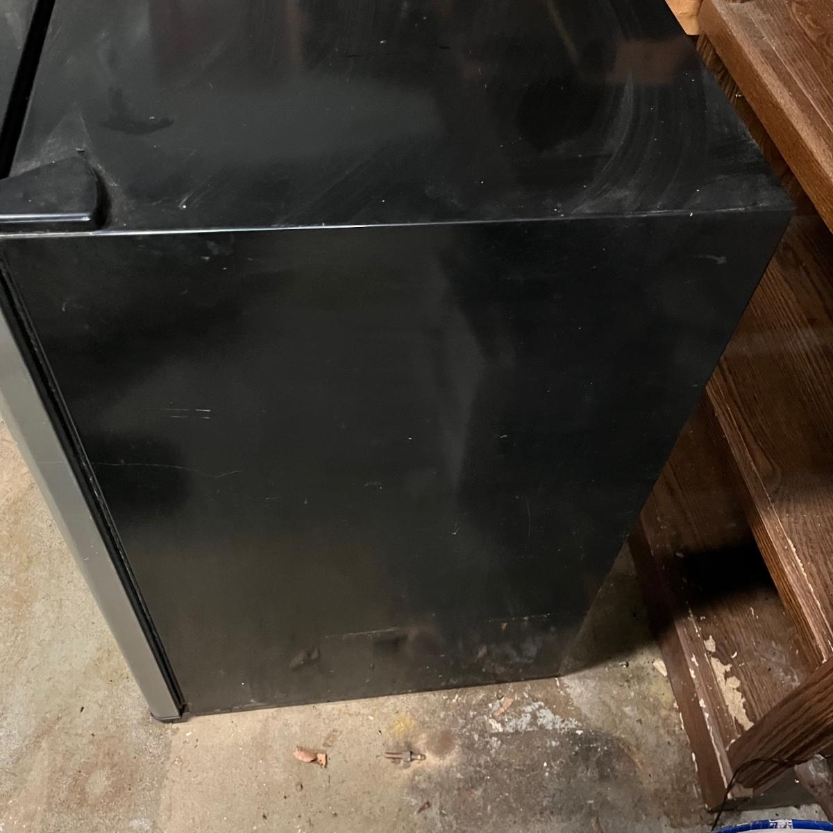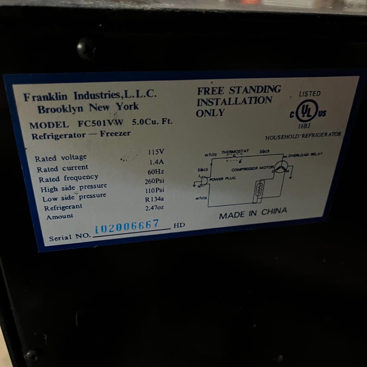Lot includes a Franklin Chef 5.0 cubic feet refrigerator with freezer. Freezer door has small crack and has nail for hinge pin, see pictures. Refrigerator worked when tested.