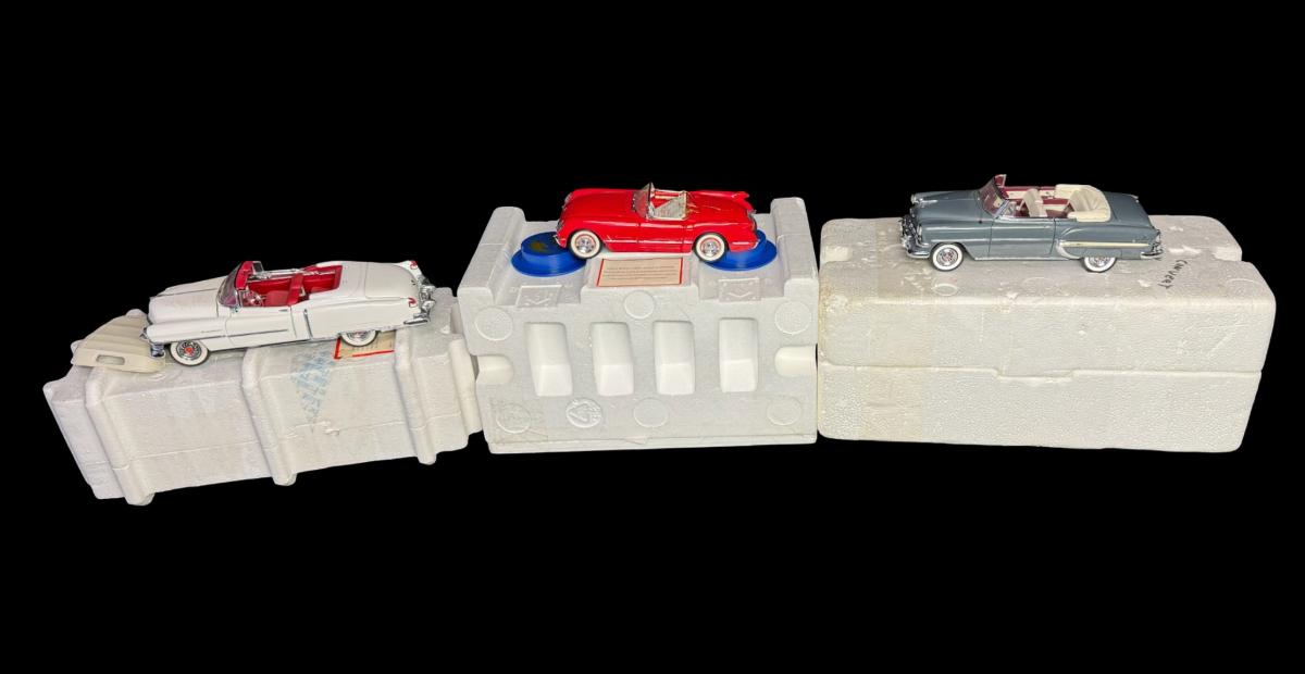 Includes a 1957 Corvette, and two 1953 Cadillac El Dorados. Total of three pieces. All have the original styrofoam packing. Two have the outer boxes (one of the El Dorados does not).