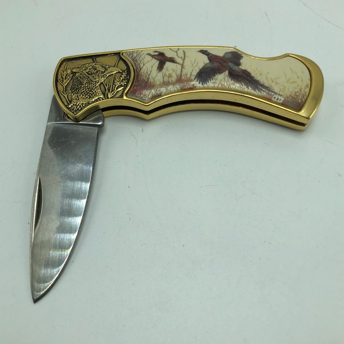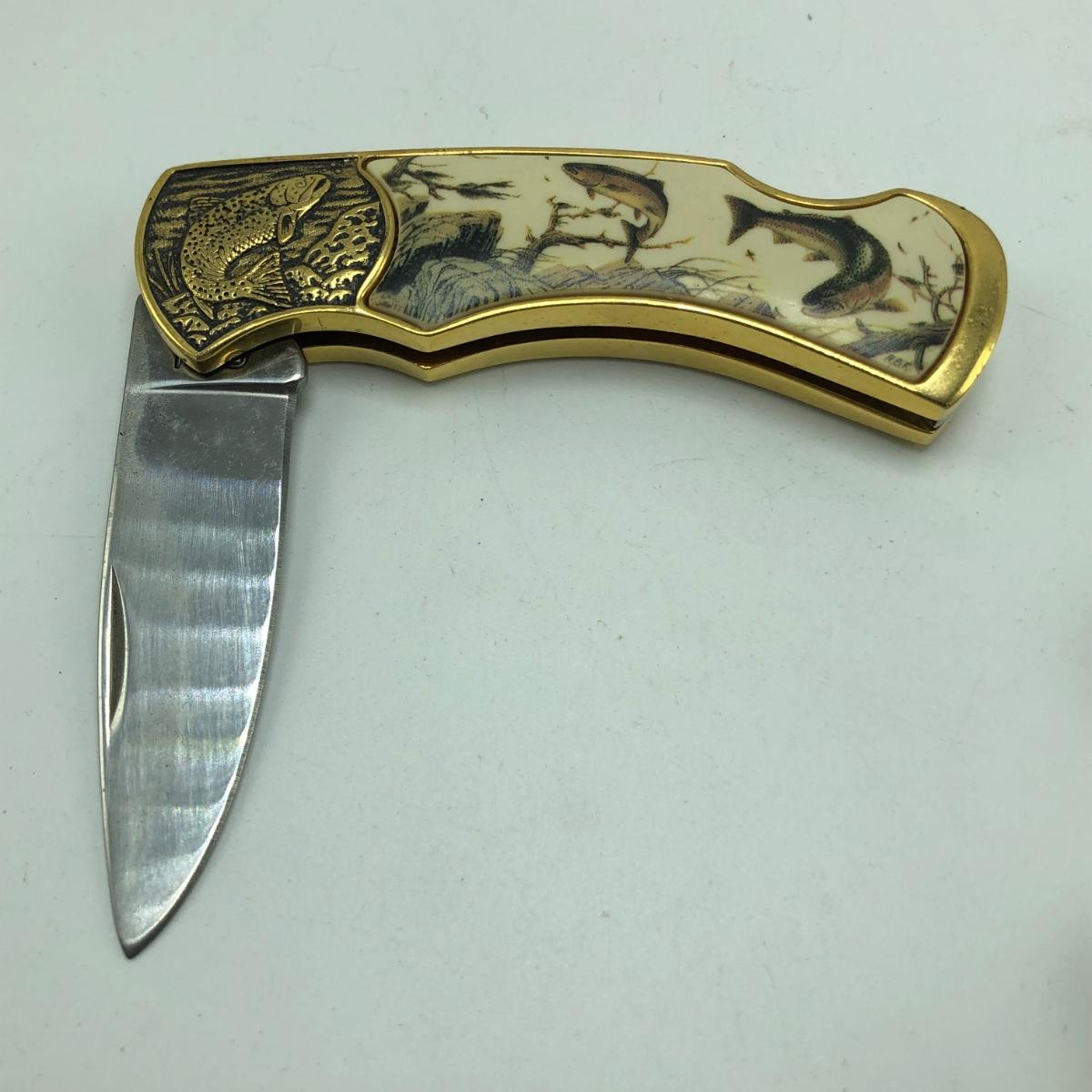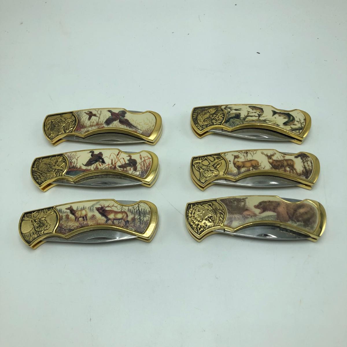 Lot contains six Franklin Mint collector pocketknives with an animal, bird or fish design, see pictures. Knives measure 6.75” long when open.