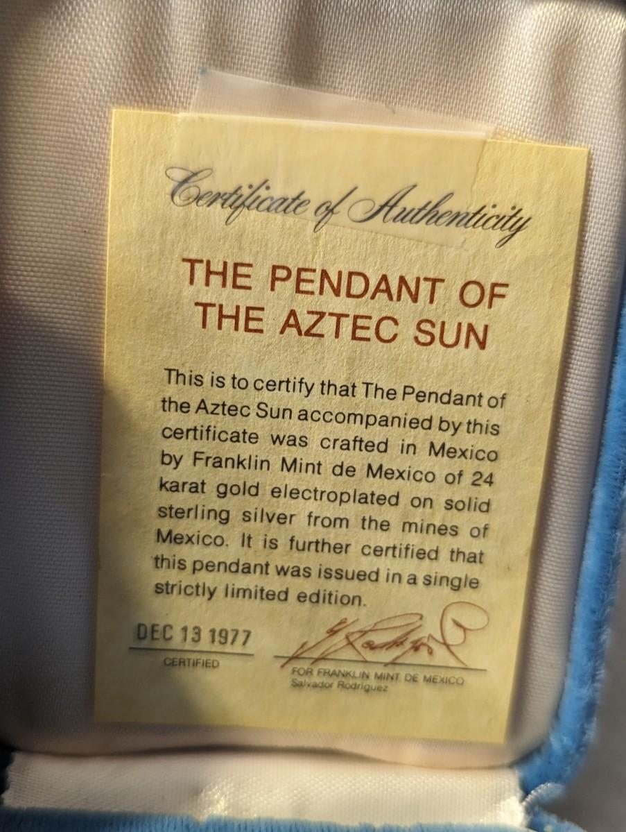 Franklin Mint Pendant Of The Aztec Sun Certification