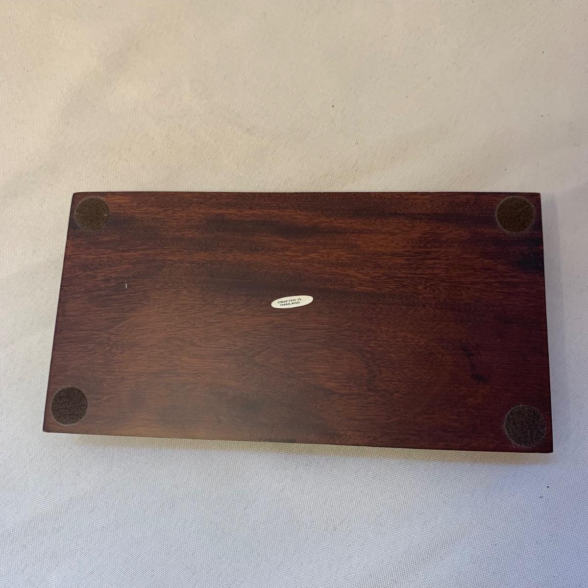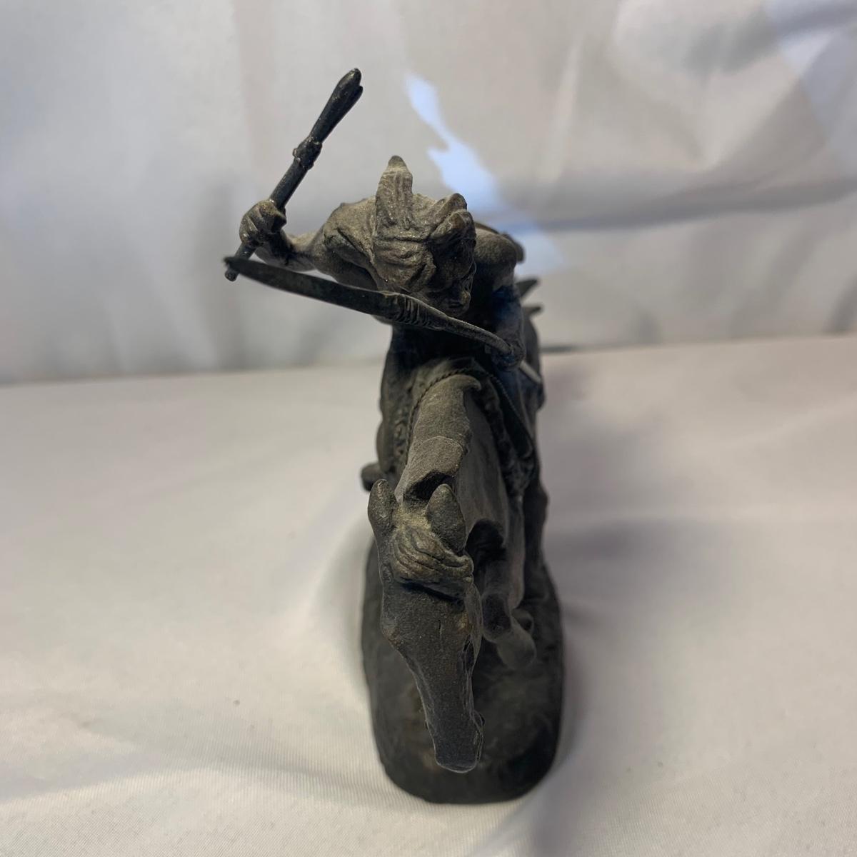 This Franklin Mint “The Cheyenne” statue appears to be made of bronze. It sits atop a wooden stand. Including the stand, it measures 6.5” x 3” x 6.75”H.