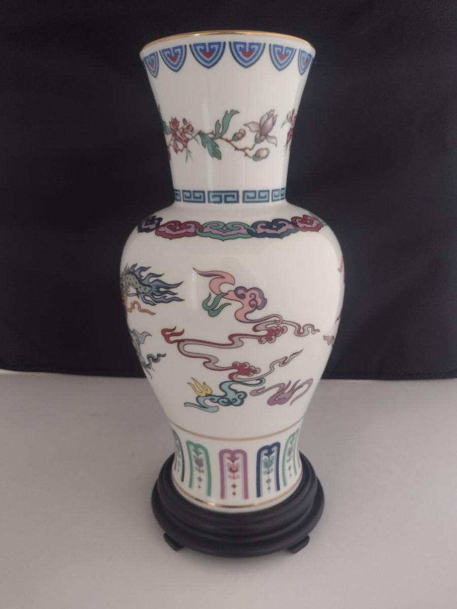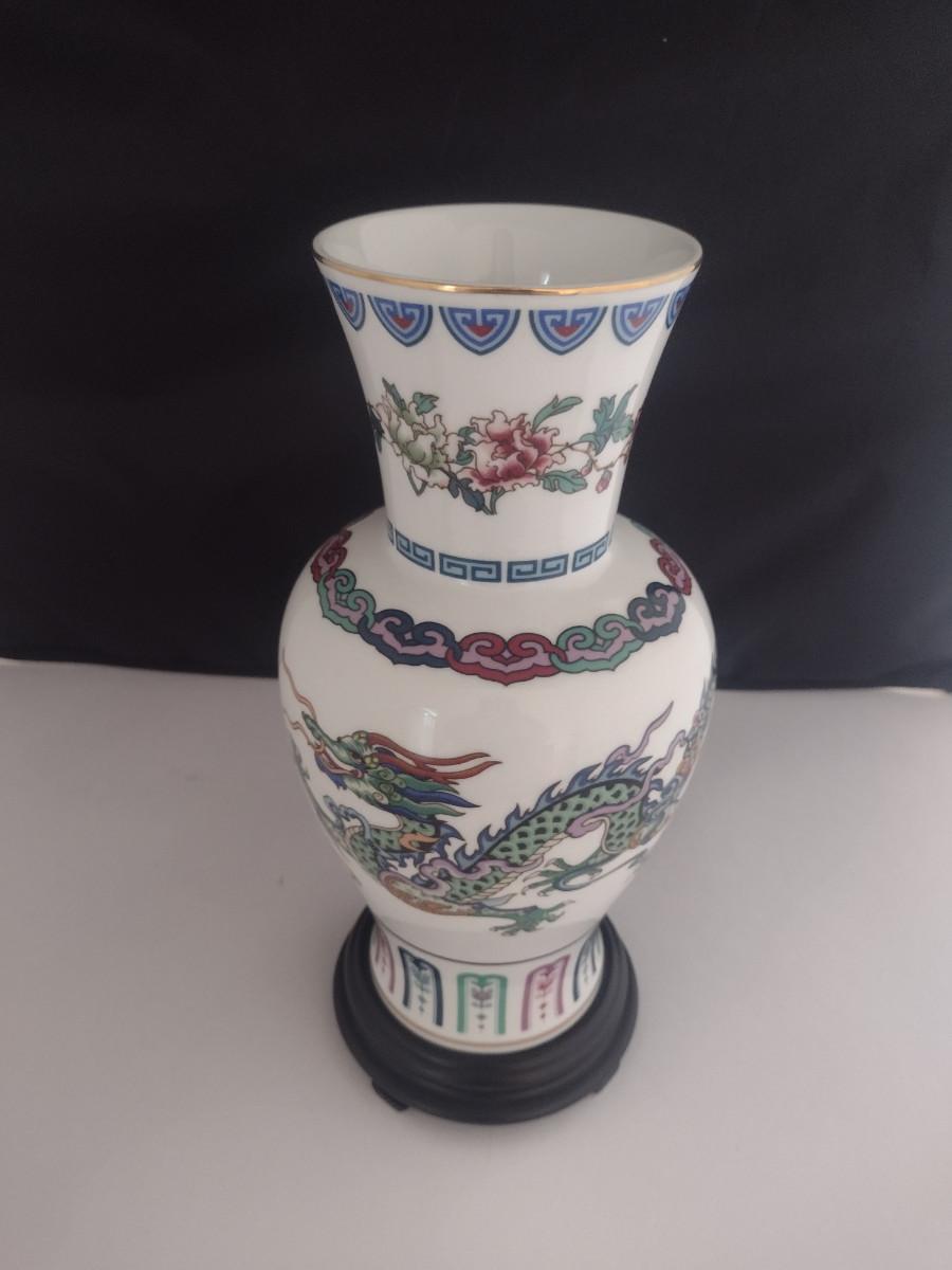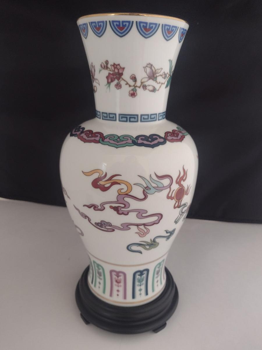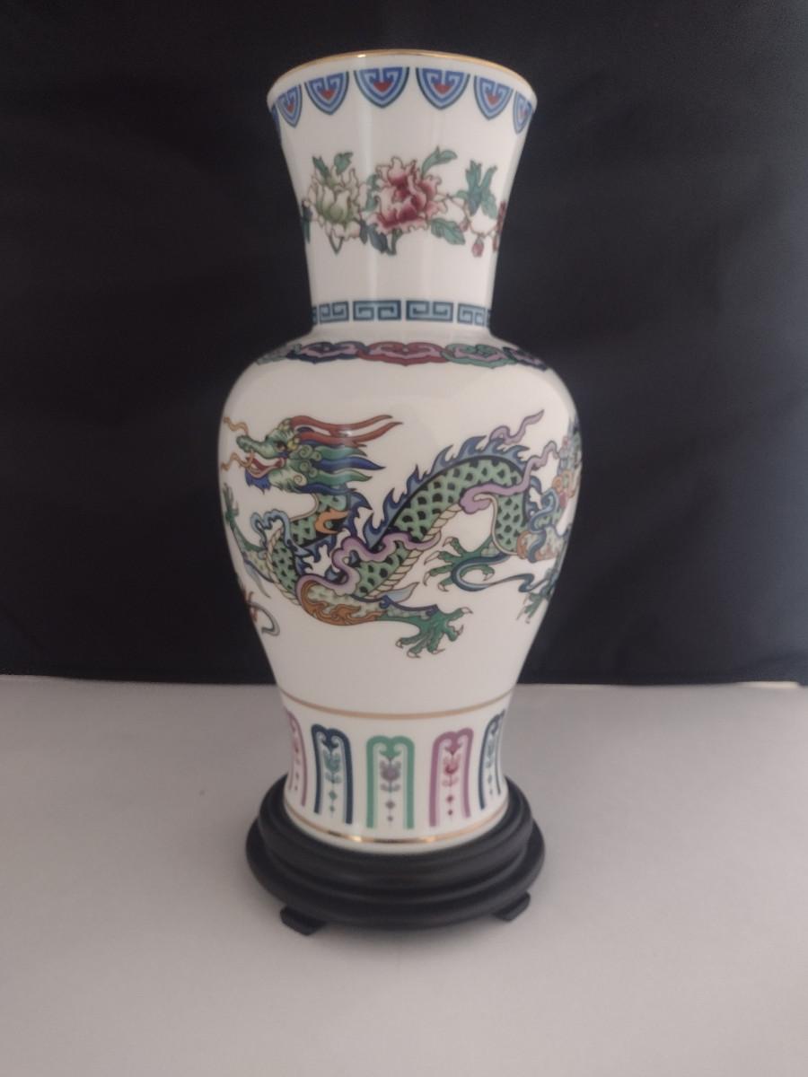 Franklin Mint 'The Dance of the Celestial Dragon' Porcelain Vase with Wooden Stand- Approx 10 1/4" Tall