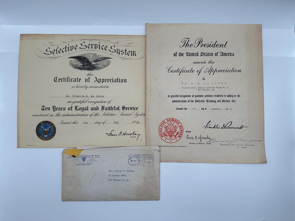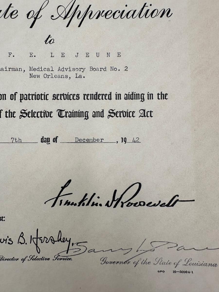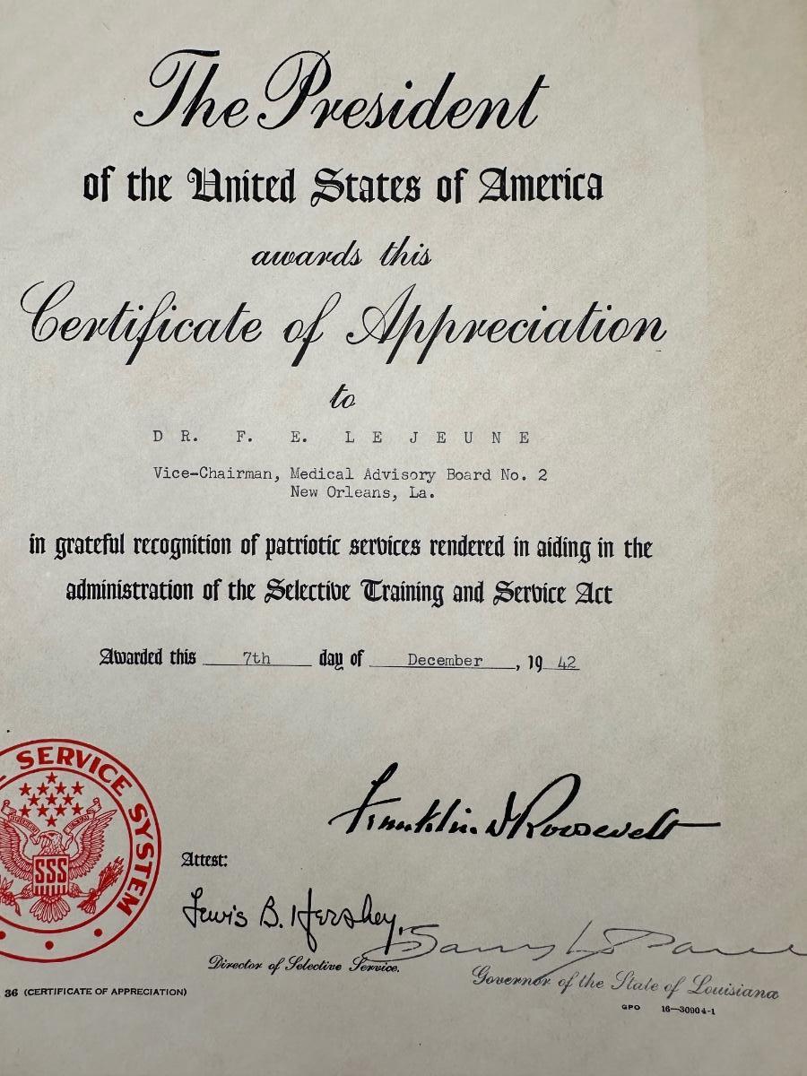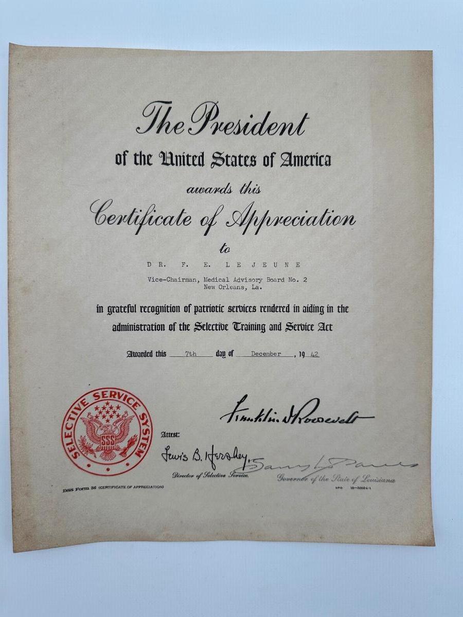 Franklin Roosevelt Certificate of Appreciation for F.E. Le Jeune