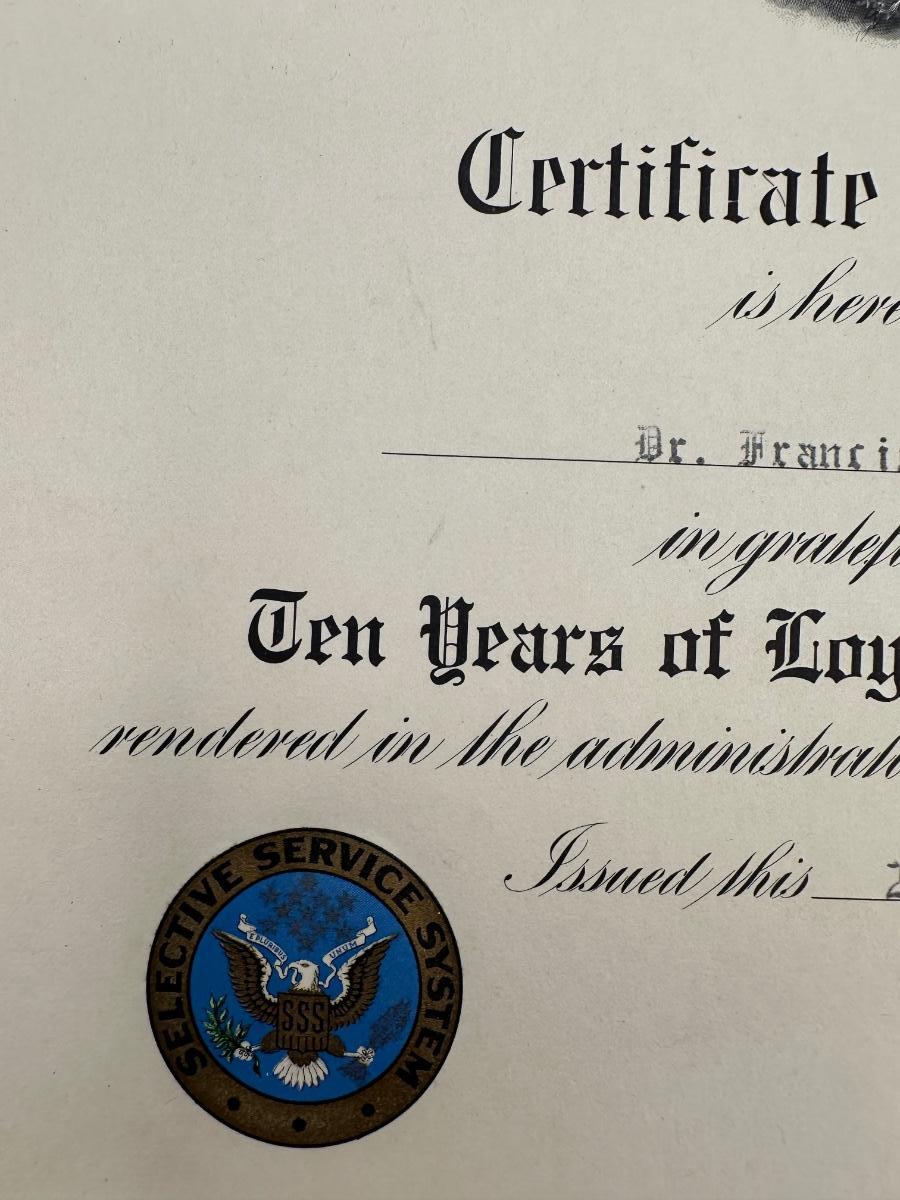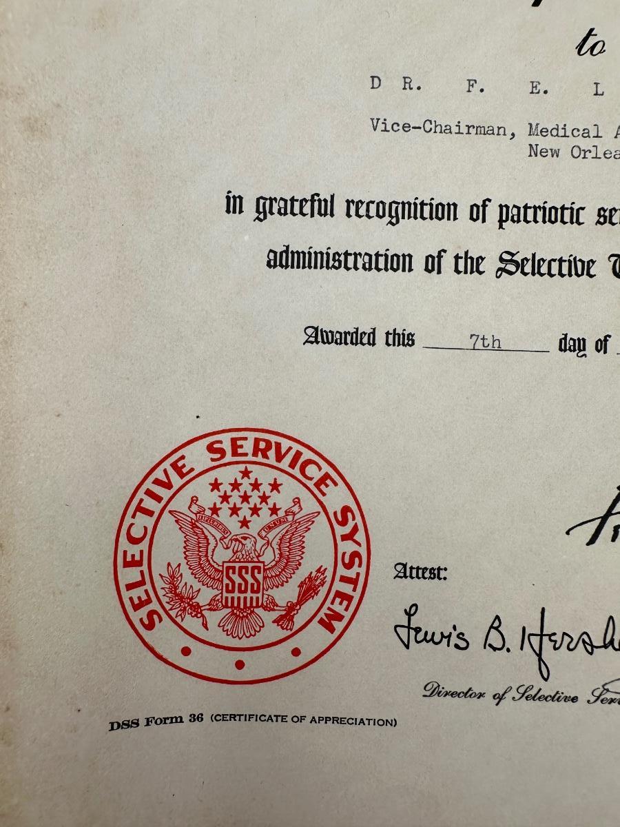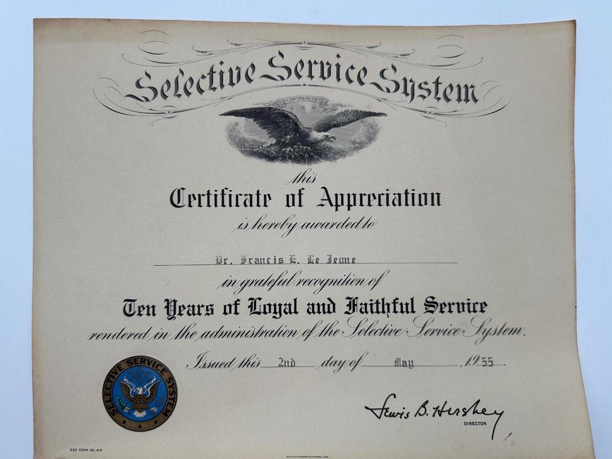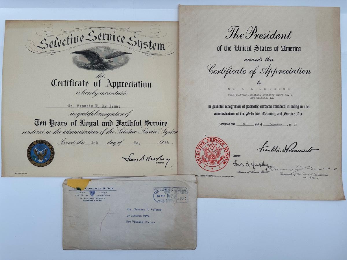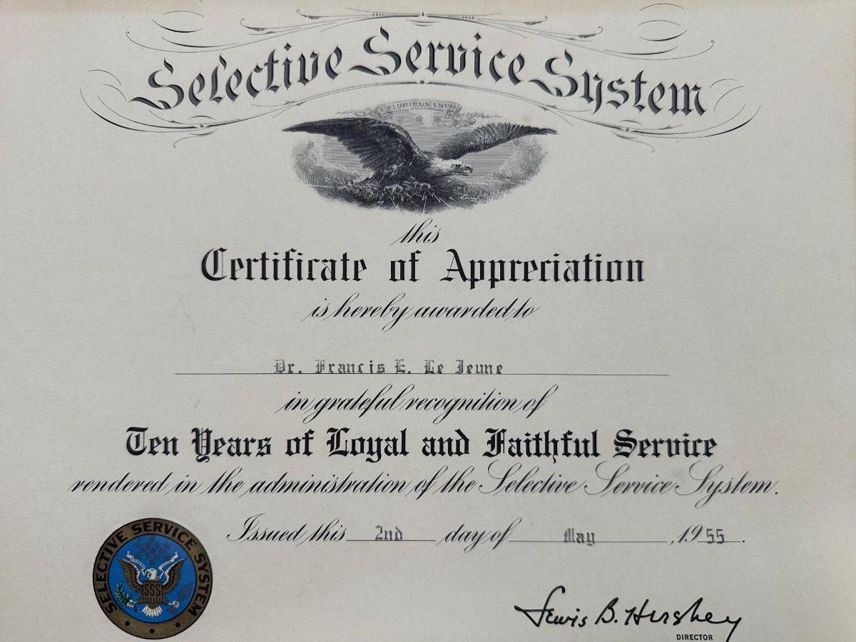 Franklin Roosevelt Certificate of Appreciation for F.E. Le Jeune