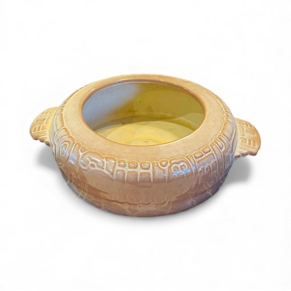 This Frankoma 7V Mayan Cooking Pot is a true masterpiece of vintage pottery, expertly crafted in Frankoma’s signature Prairie Gold glaze. Drawing inspiration from ancient Mayan designs, the pot features a beautifully textured surface with geometric patterns and a bold, distinctive shape. The warm, golden hue of the glaze adds a rustic, earthy elegance that makes this piece stand out in any collection.