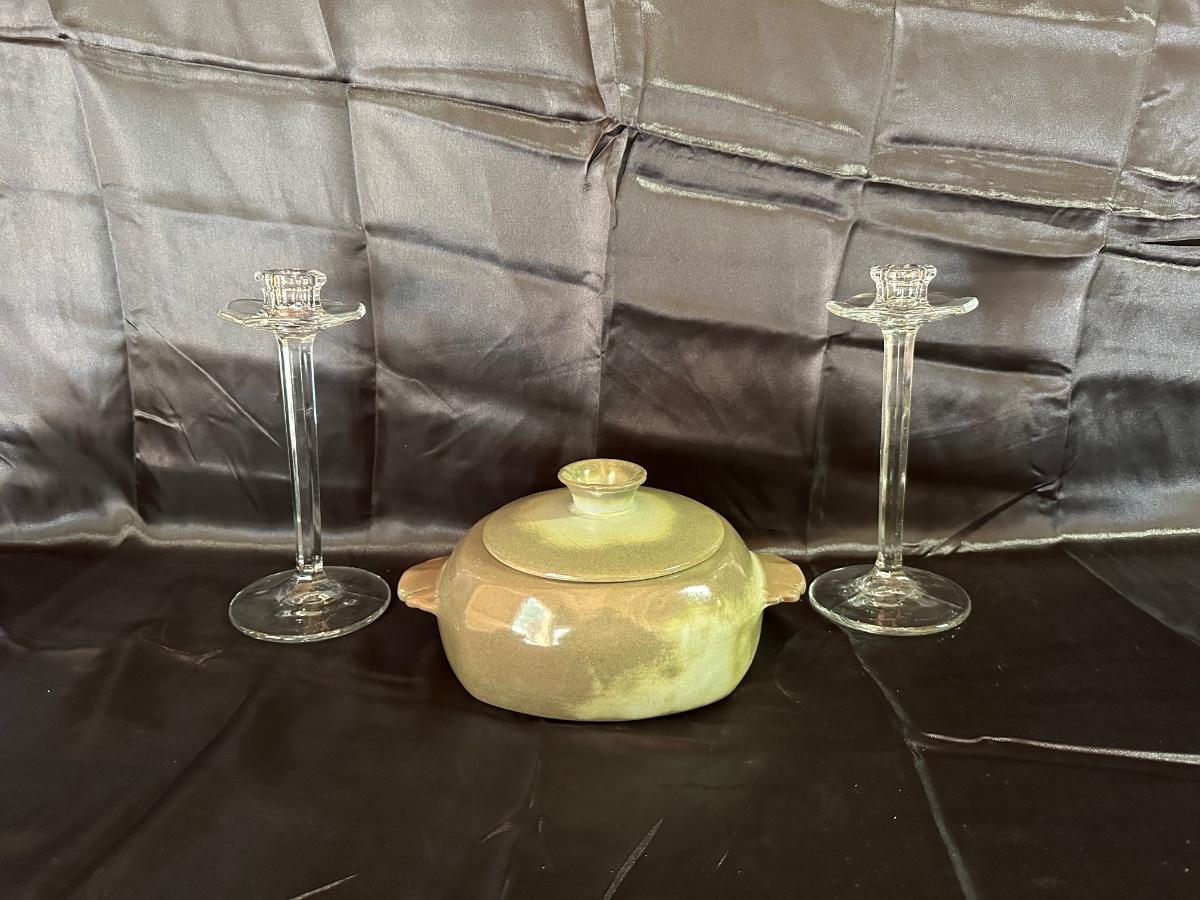 FRANKOMA CASSEROLE DISH AND A PAIR OF CANDLESTICKS