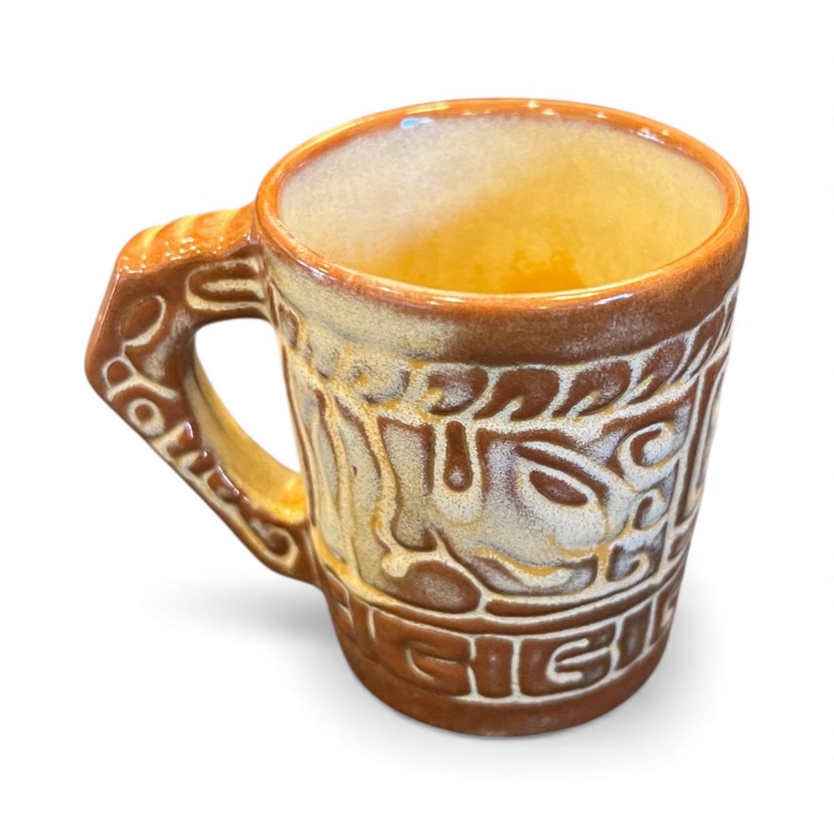 Striking vintage Frankoma cup featuring the bold Mayan pattern and warm Prairie Gold glaze. A standout piece for pottery collectors or anyone who loves unique, Southwestern-inspired designs.