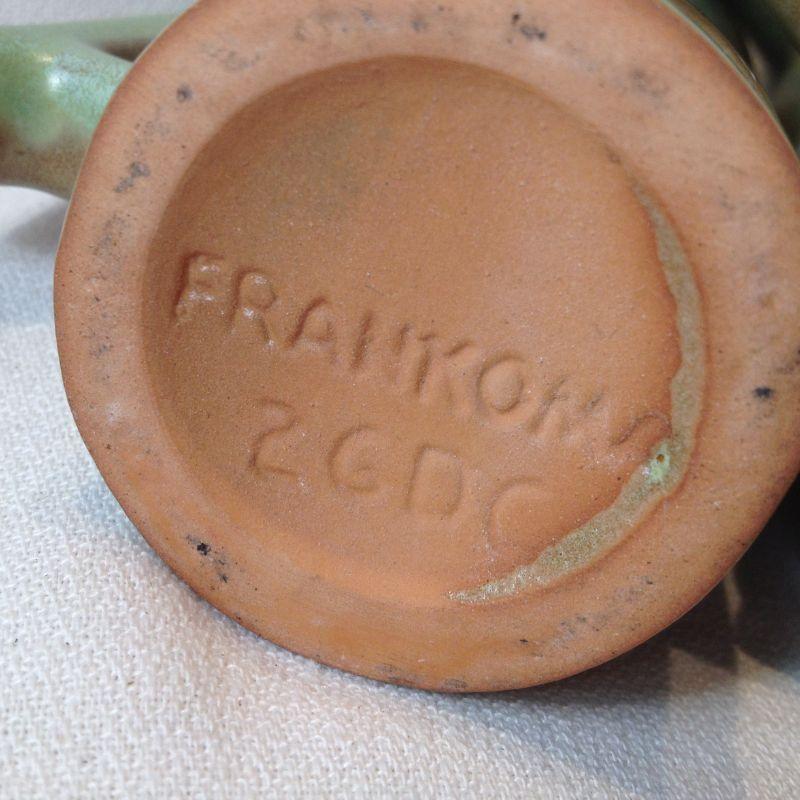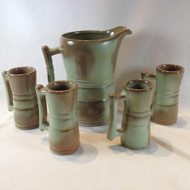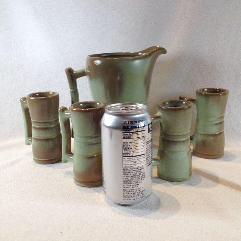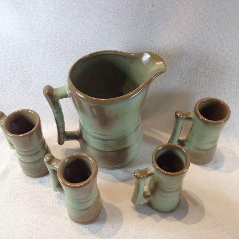 This collector's gem is both useful and beautiful. Much desired 50's patio set of a tall pitcher and four tall mugs - fired in those California-era colors. Ready for lemonade and you. Frankoma Pottery is an American pottery company located in Sapulpa, Oklahoma. The company is widely known for its sculptures and dinnerware although the company made many other products including figurines, trivets, and vases. All Frankoma pottery is made in the U.S. from locally dug clay.