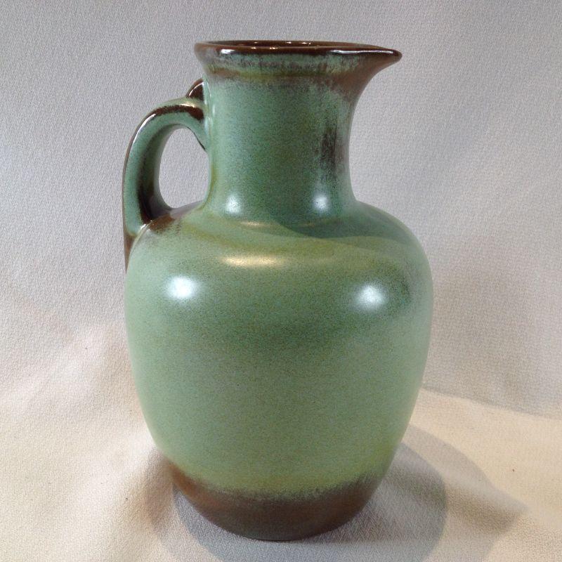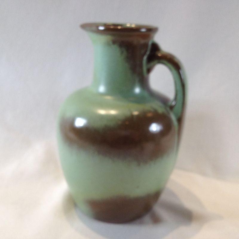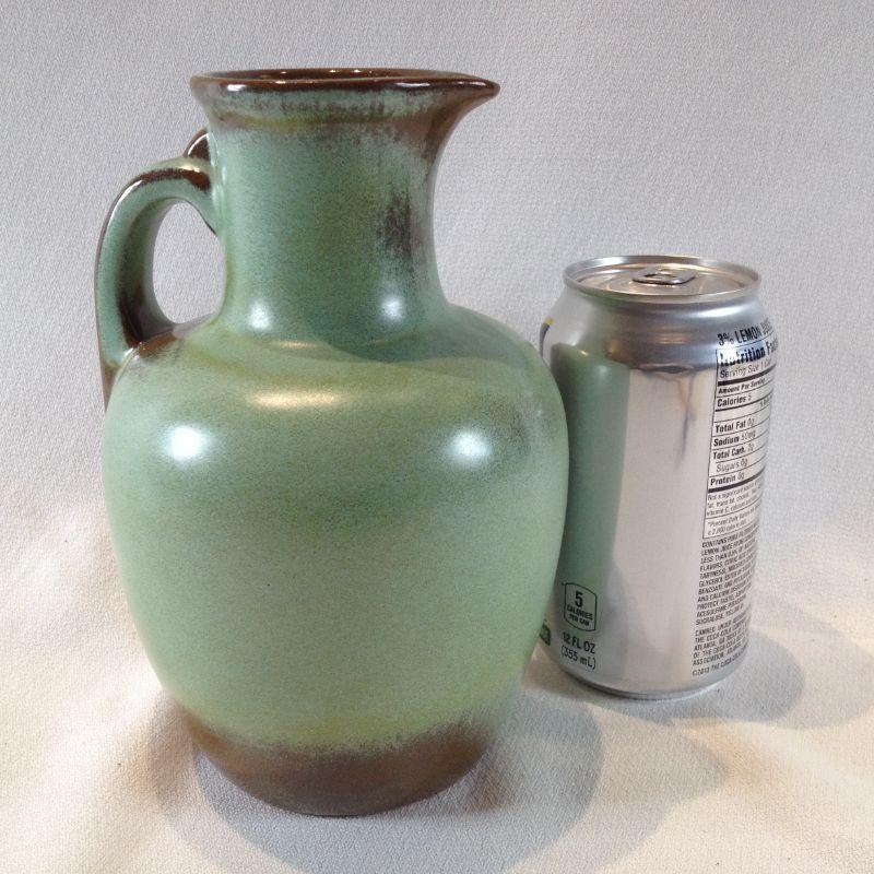 This is a fat Frankoma pitcher/vase in the traditional California-era green and brown glaze. Great for the Frankoma collector and everyday use. It is in very good condition. Frankoma Pottery is an American pottery company located in Sapulpa, Oklahoma. The company is widely known for its sculptures and dinnerware although the company made many other products including figurines, trivets, and vases. All Frankoma pottery is made in the U.S. from locally dug clay.