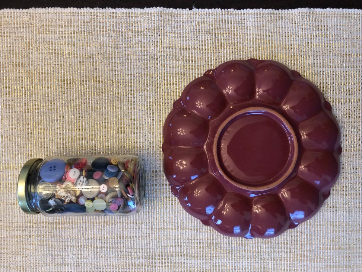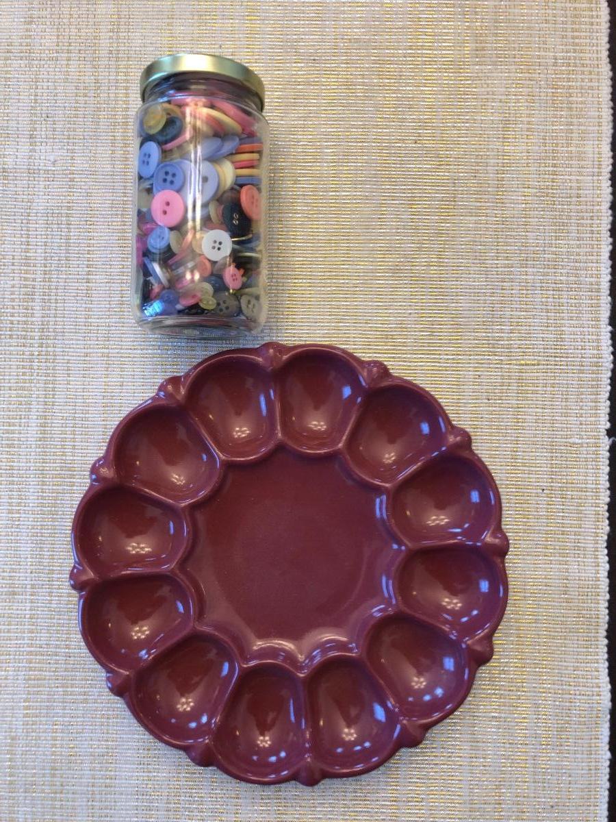 FRANKOMA POTTERY EGGPLATE AND JAR OF BUTTONS