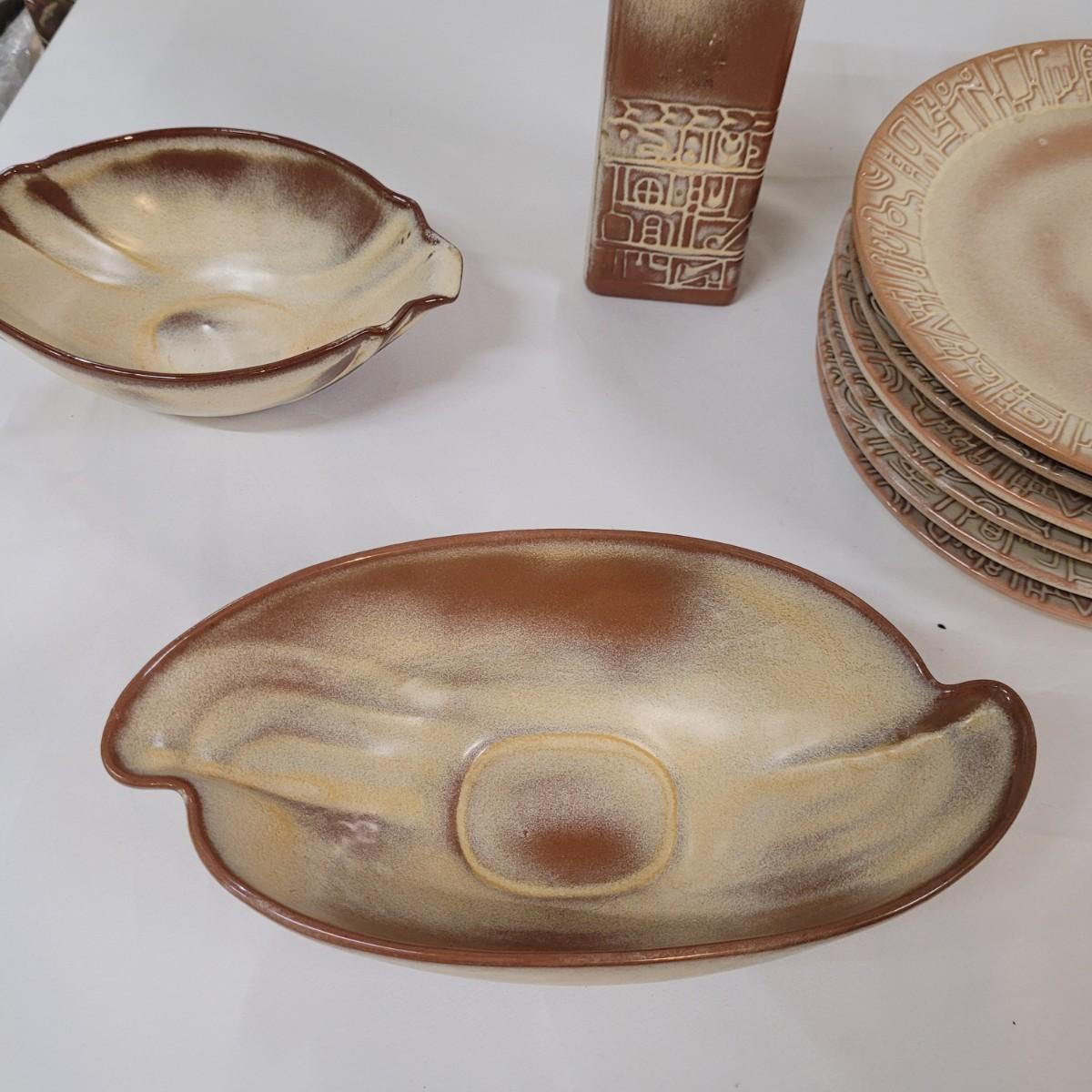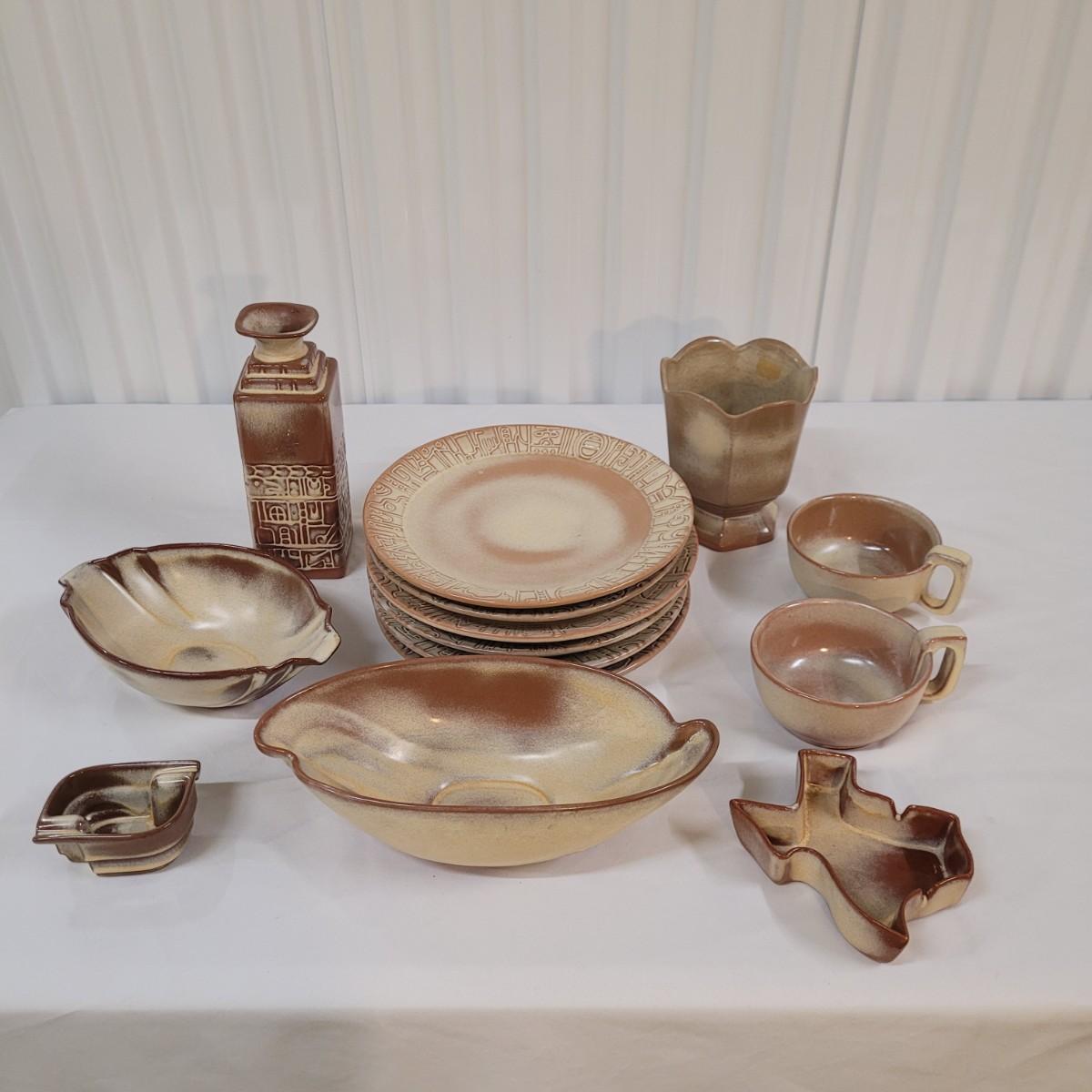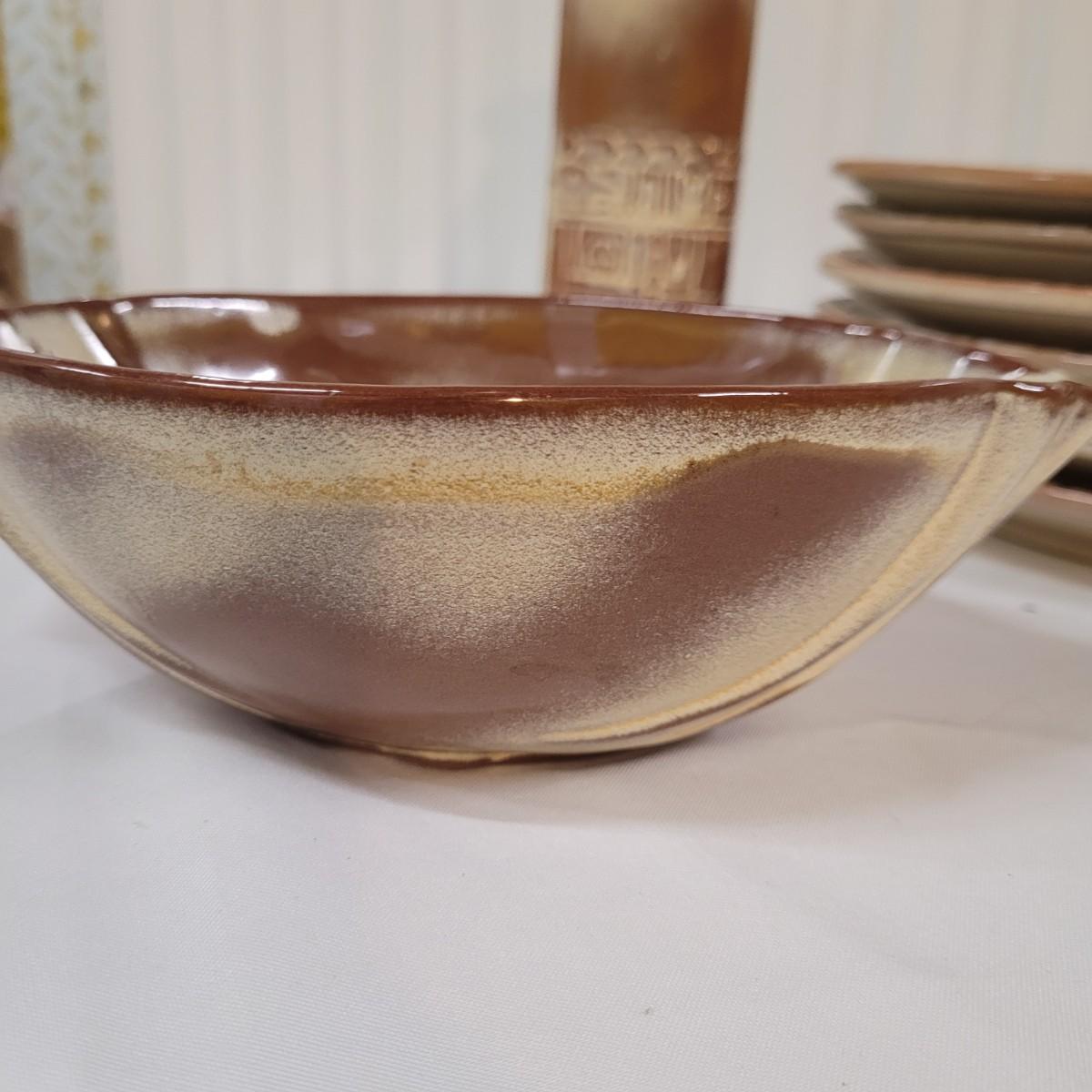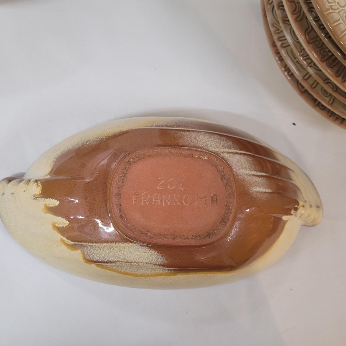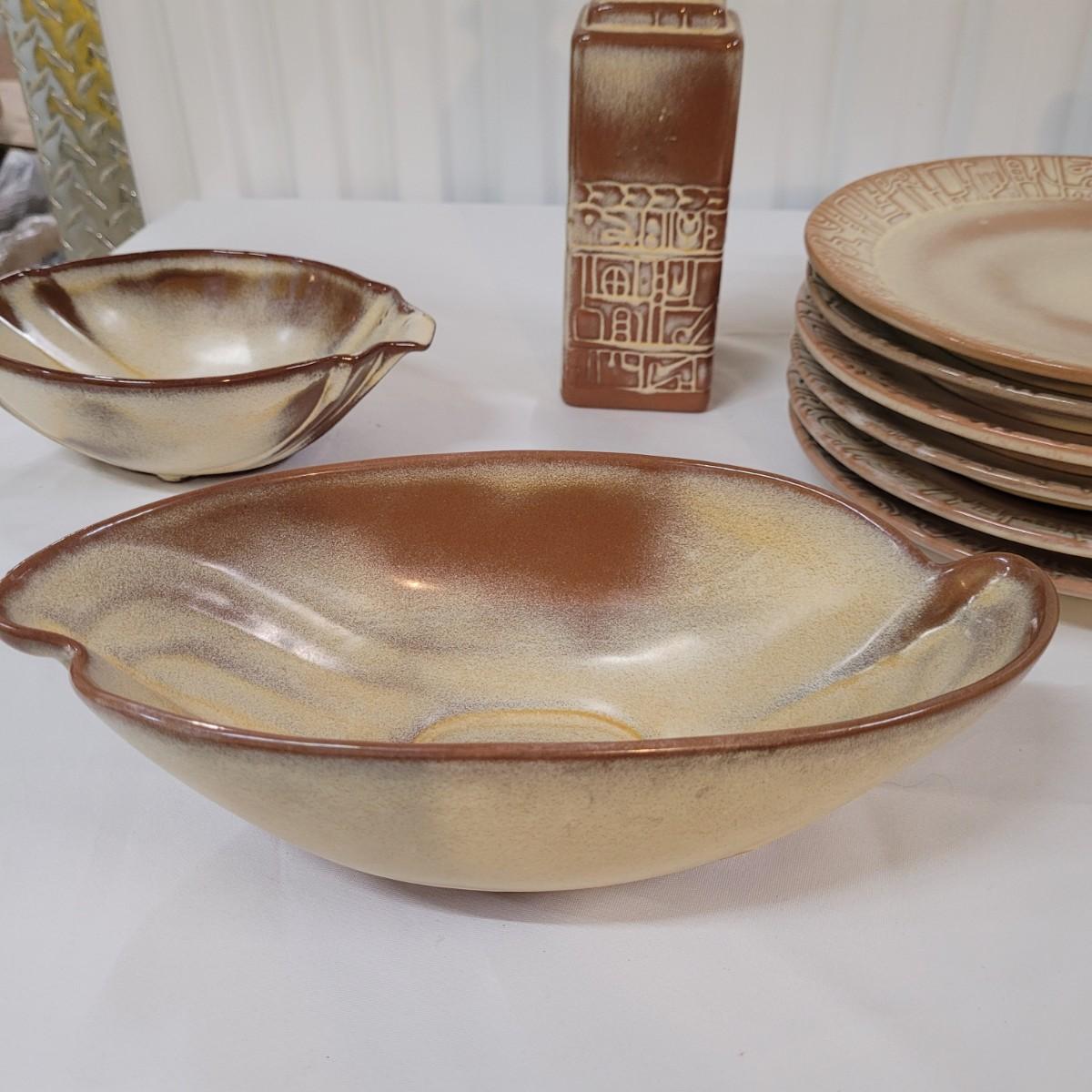 Beautiful set of Frankoma dishes (six), two mugs, two serving bowls, two vases and a small sauce dish. Texas shaped small dish included as well. Items in excellent condition, with only one chip on scalloped vase (see photos). Dishes measure approximately 10.5"DIA. Shipping available.