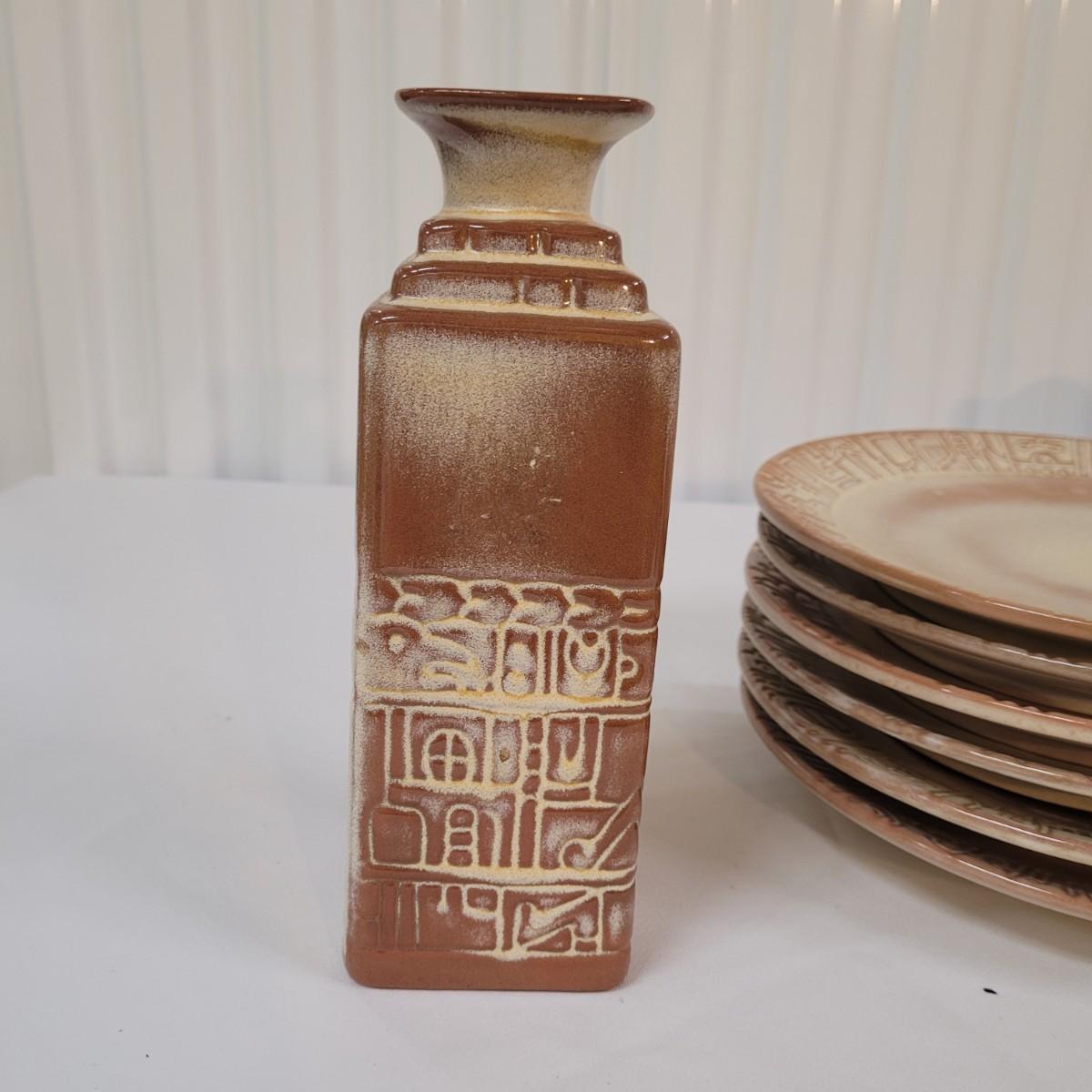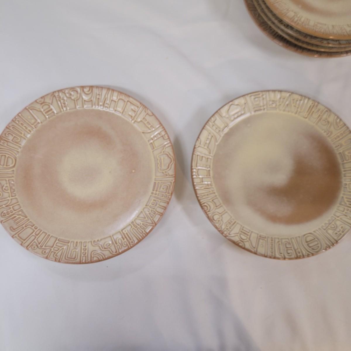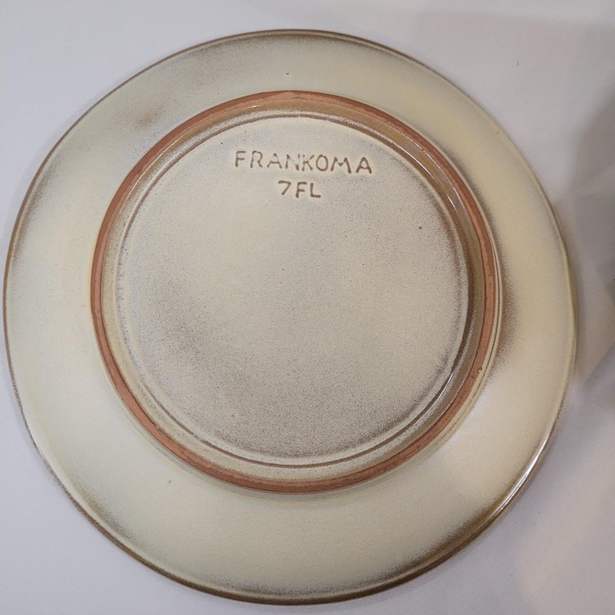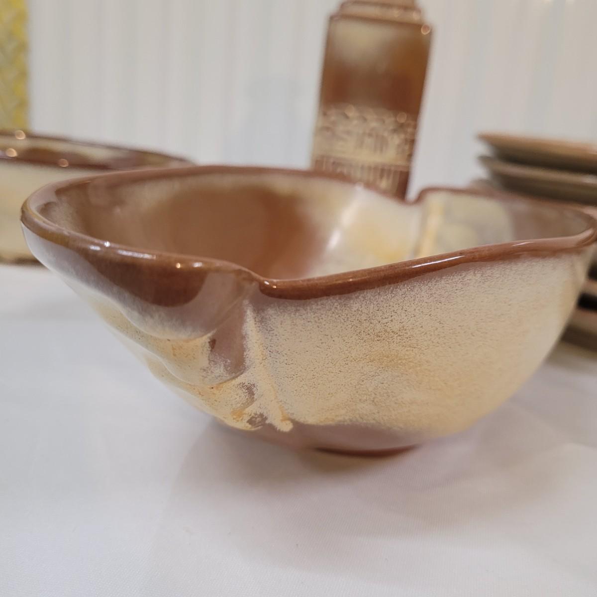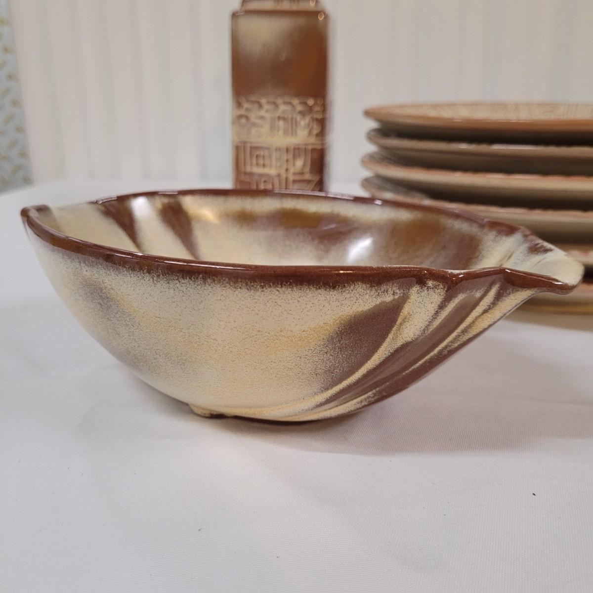 Beautiful set of Frankoma dishes (six), two mugs, two serving bowls, two vases and a small sauce dish. Texas shaped small dish included as well. Items in excellent condition, with only one chip on scalloped vase (see photos). Dishes measure approximately 10.5"DIA. Shipping available.