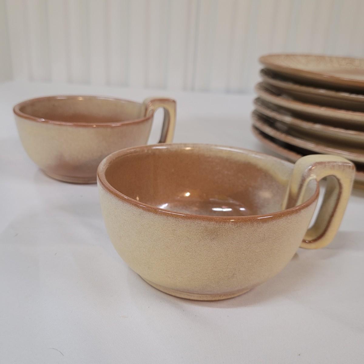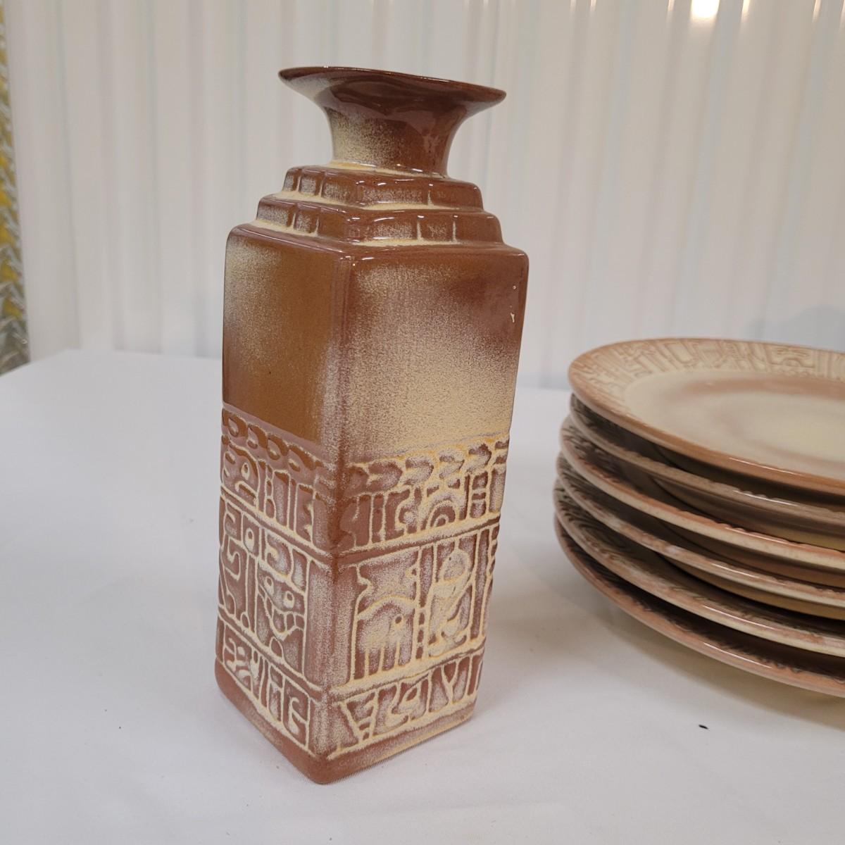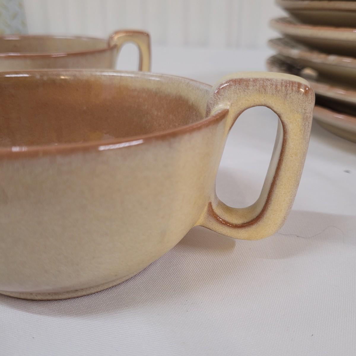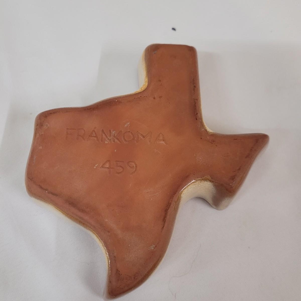 Beautiful set of Frankoma dishes (six), two mugs, two serving bowls, two vases and a small sauce dish. Texas shaped small dish included as well. Items in excellent condition, with only one chip on scalloped vase (see photos). Dishes measure approximately 10.5"DIA. Shipping available.