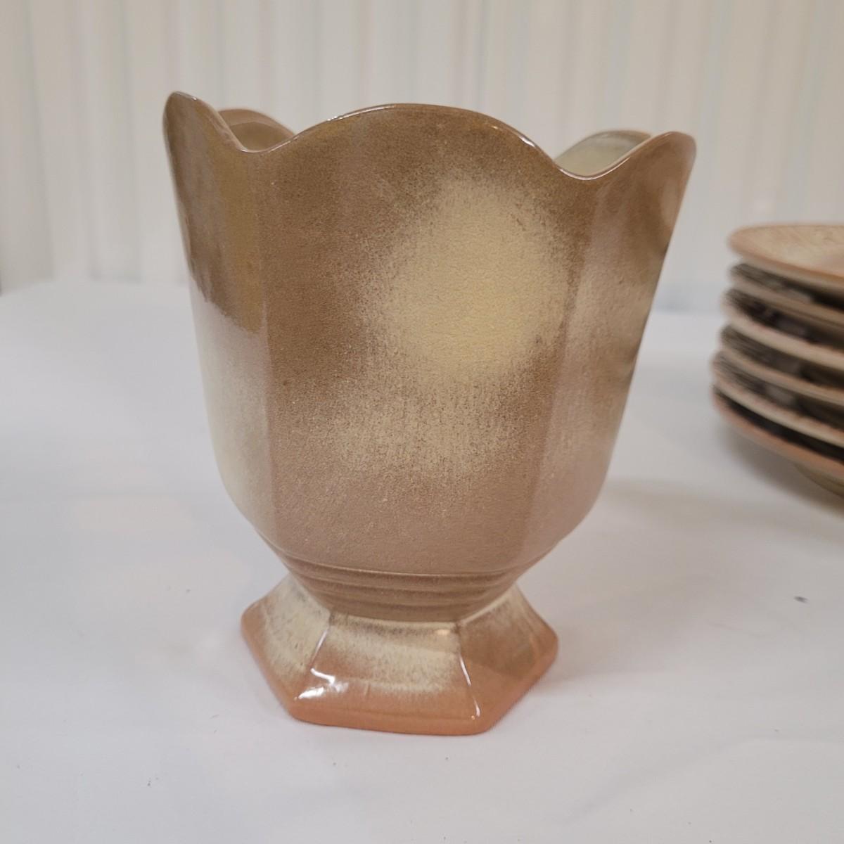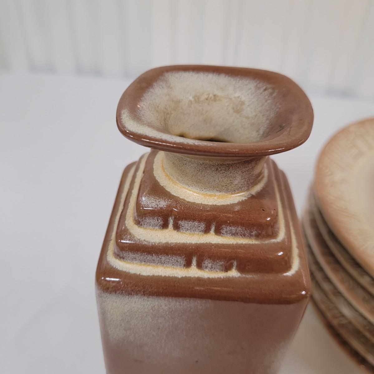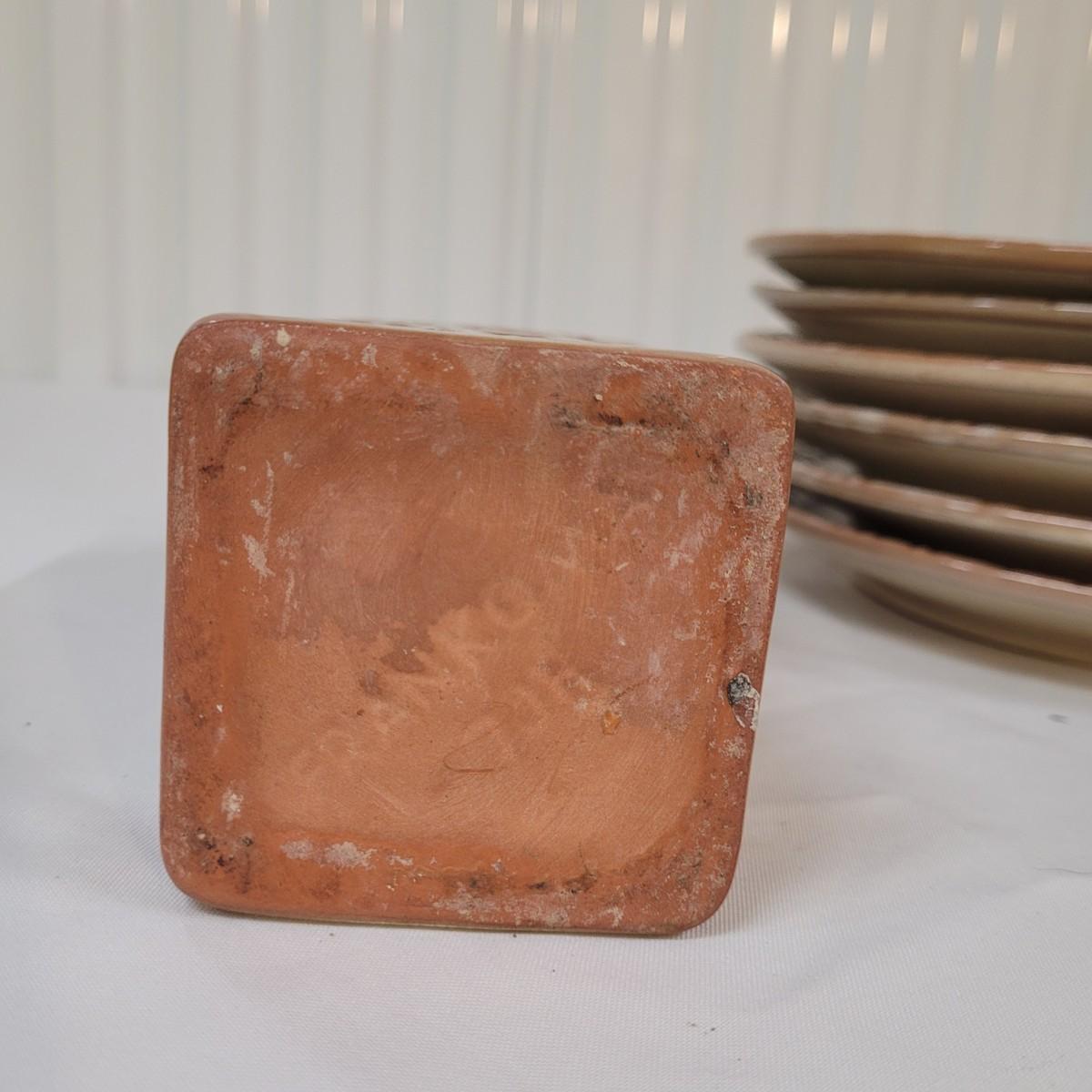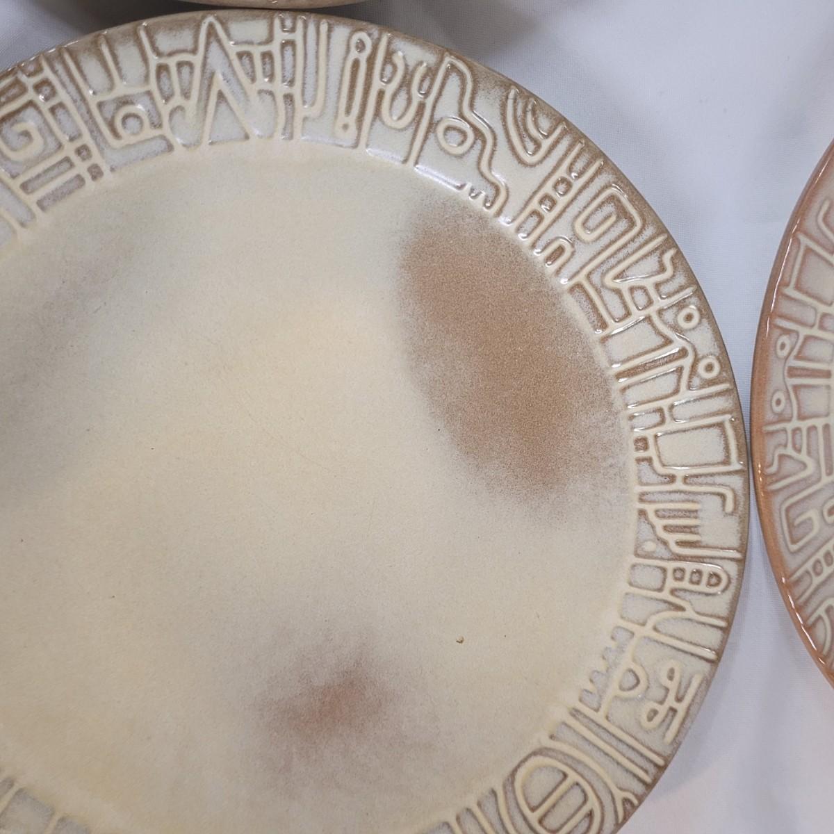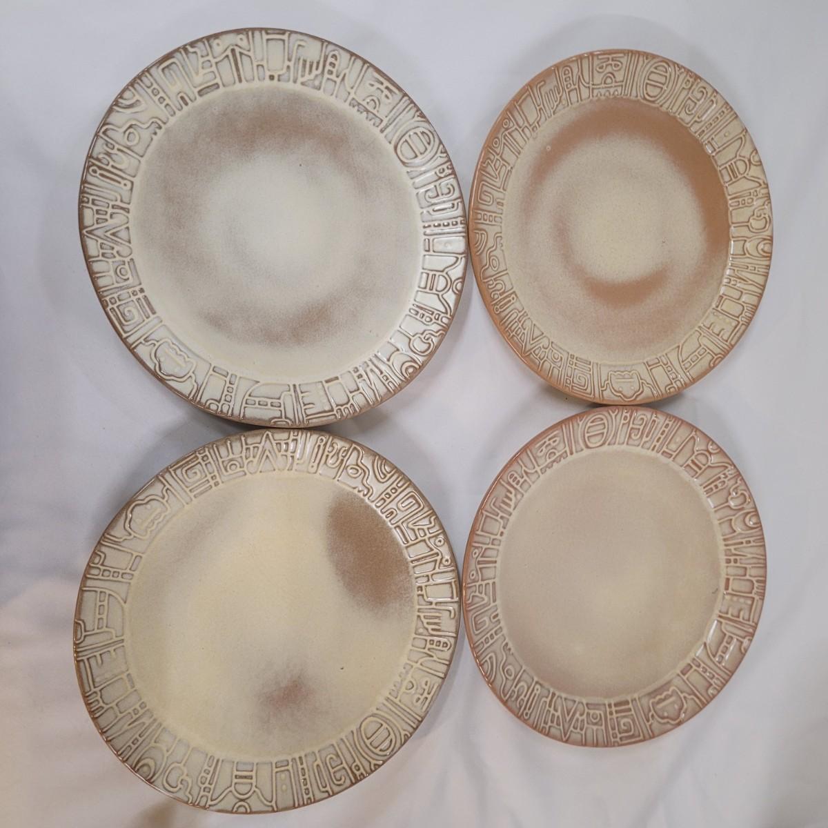 Beautiful set of Frankoma dishes (six), two mugs, two serving bowls, two vases and a small sauce dish. Texas shaped small dish included as well. Items in excellent condition, with only one chip on scalloped vase (see photos). Dishes measure approximately 10.5"DIA. Shipping available.
