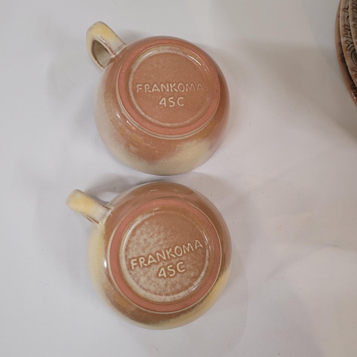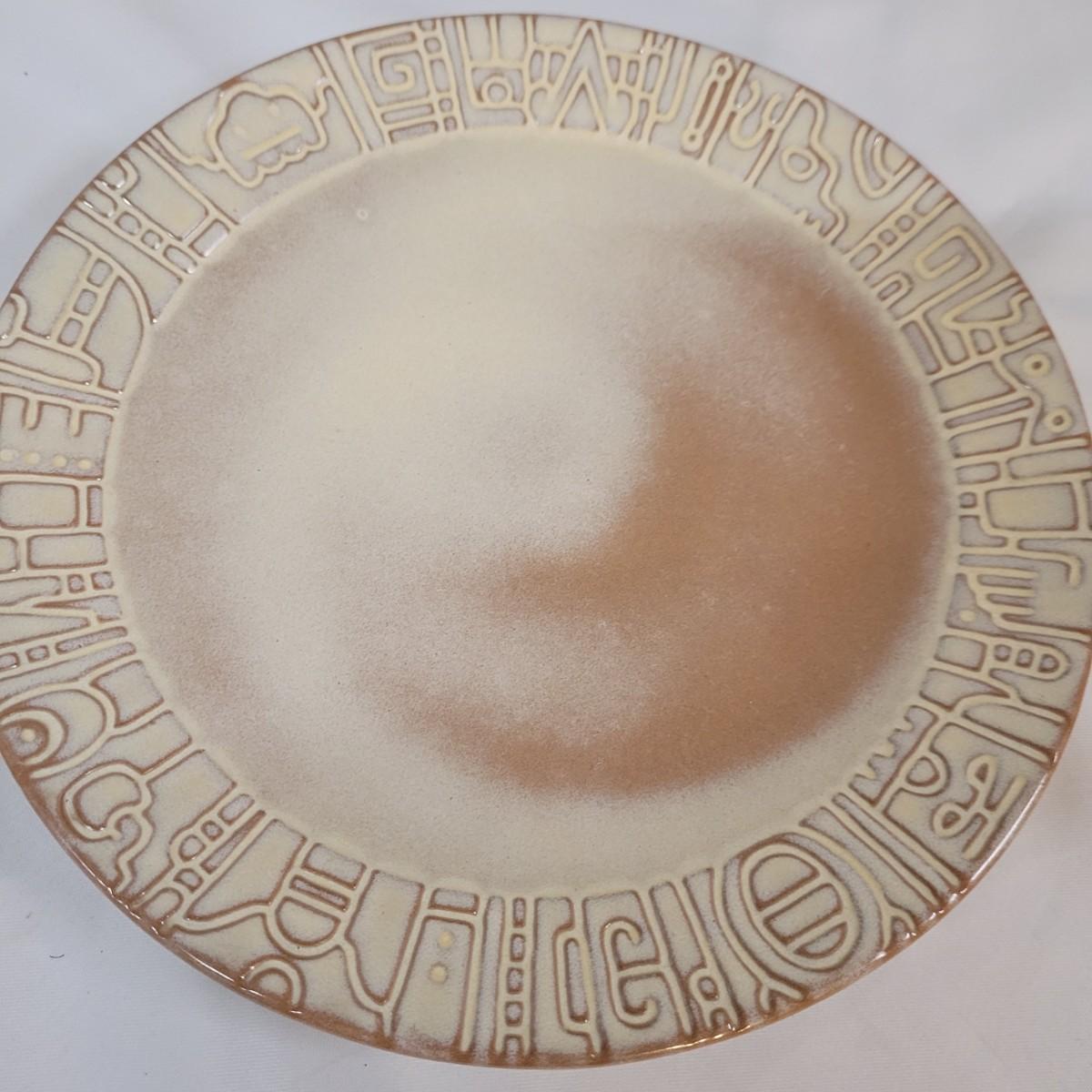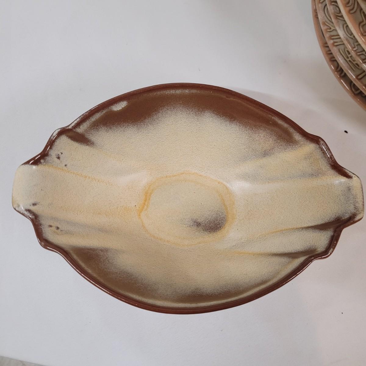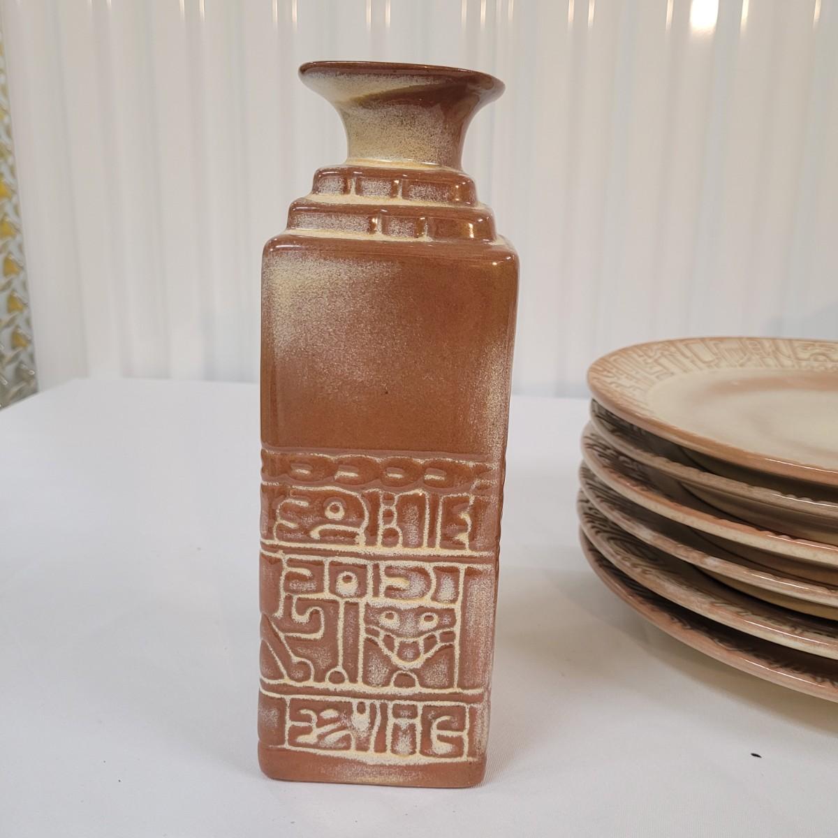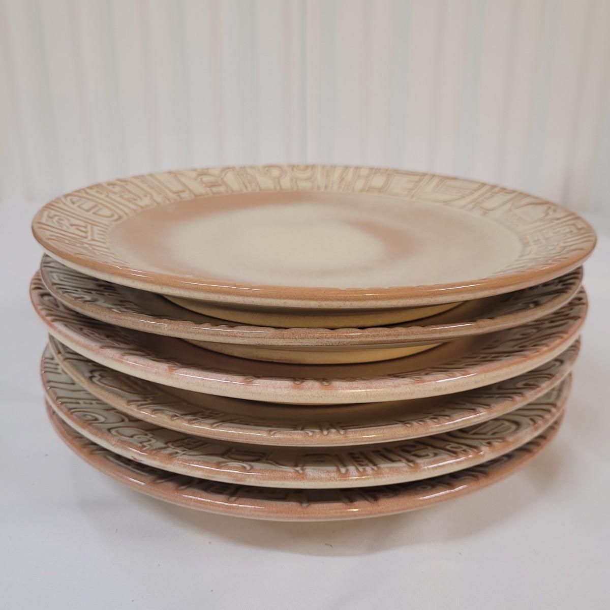 Beautiful set of Frankoma dishes (six), two mugs, two serving bowls, two vases and a small sauce dish. Texas shaped small dish included as well. Items in excellent condition, with only one chip on scalloped vase (see photos). Dishes measure approximately 10.5"DIA. Shipping available.