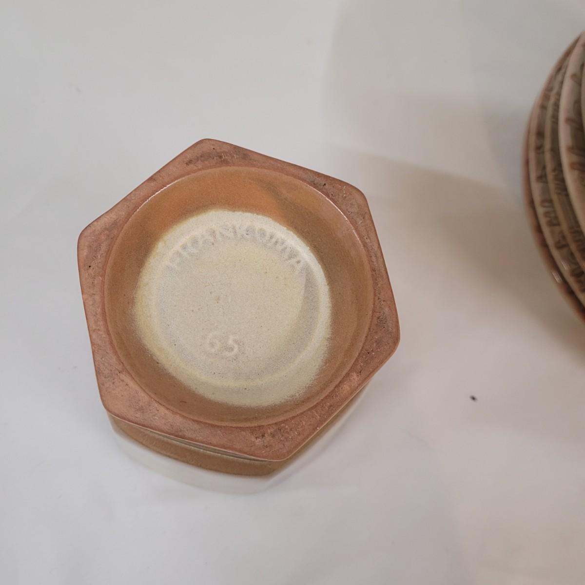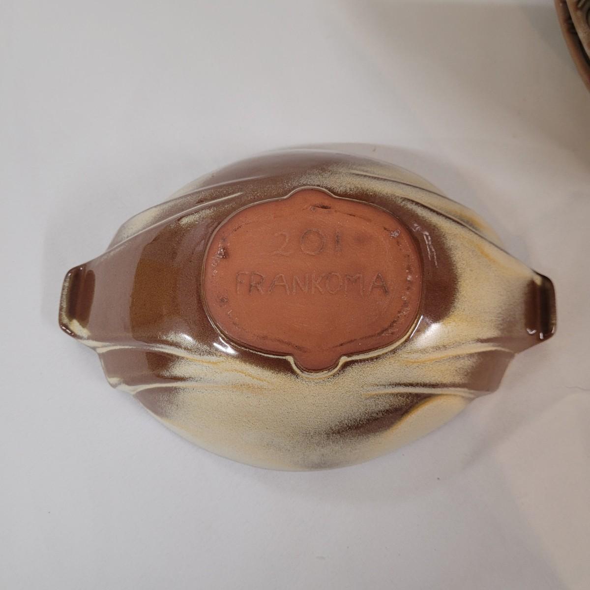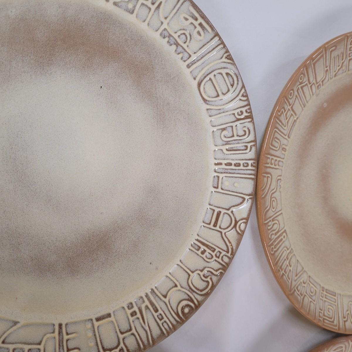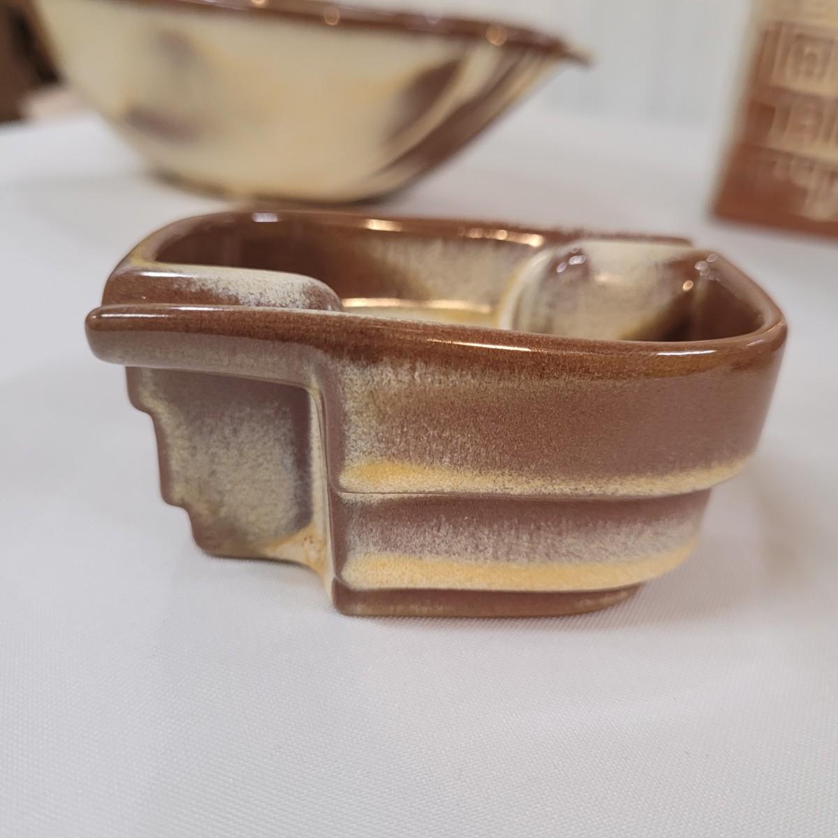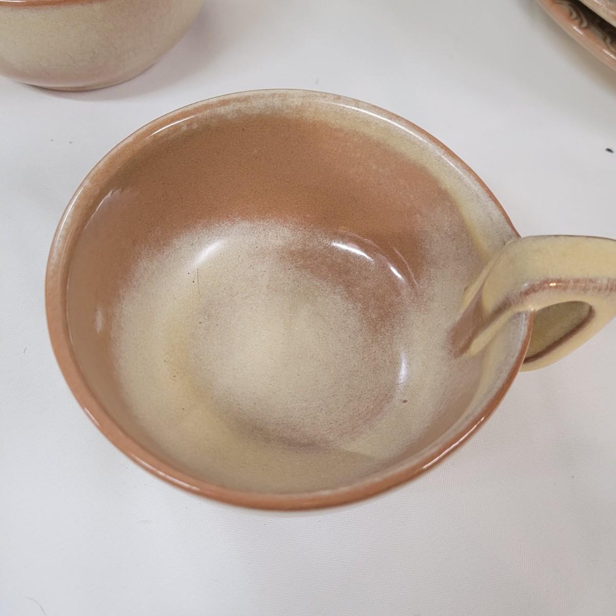 Beautiful set of Frankoma dishes (six), two mugs, two serving bowls, two vases and a small sauce dish. Texas shaped small dish included as well. Items in excellent condition, with only one chip on scalloped vase (see photos). Dishes measure approximately 10.5"DIA. Shipping available.