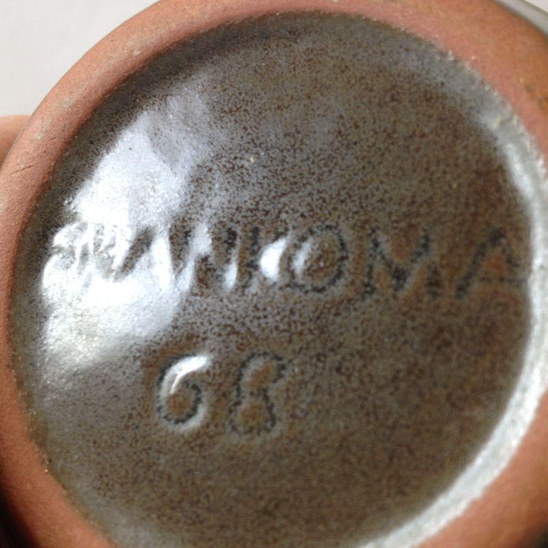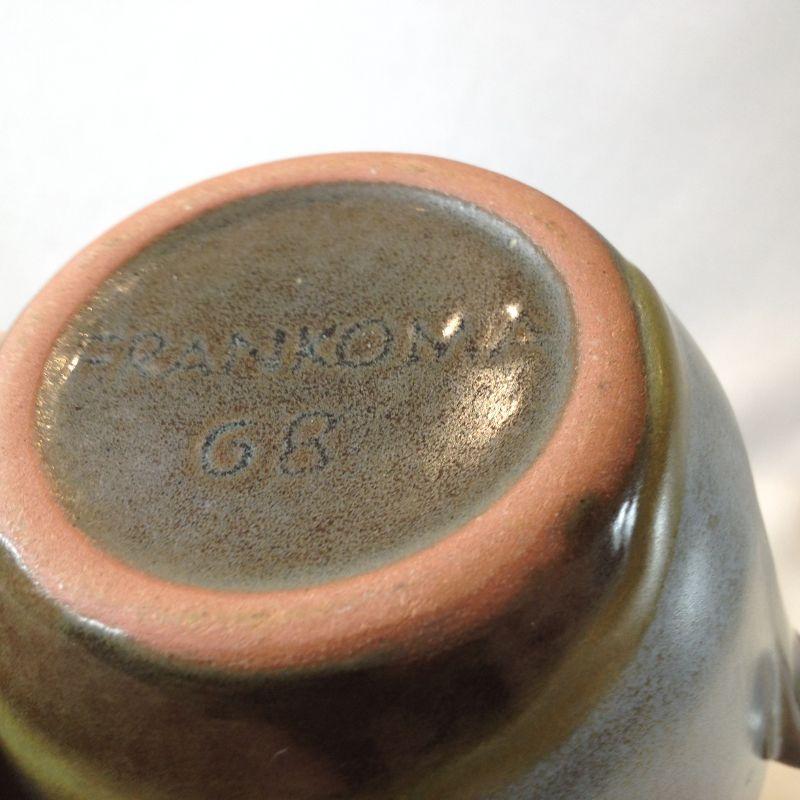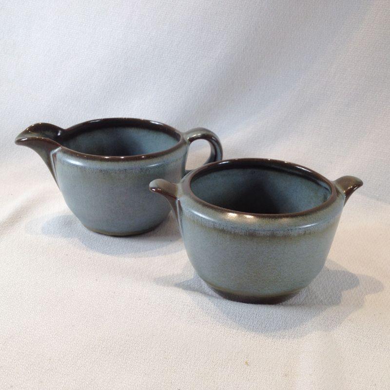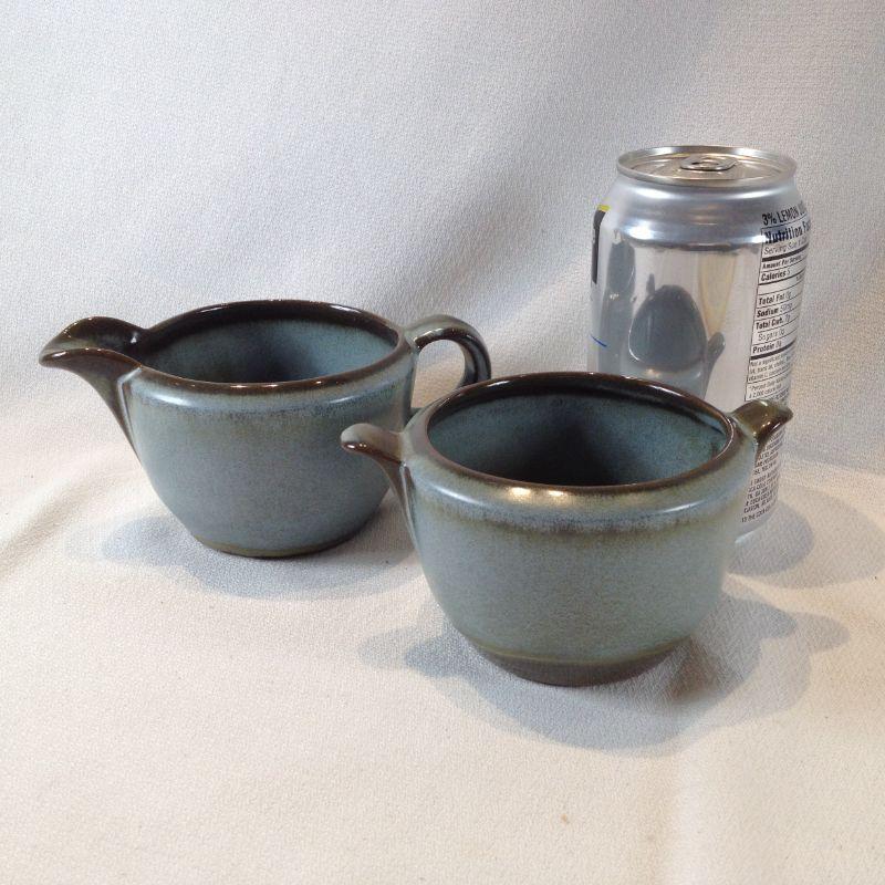 Frankoma the pottery of the 50s and smart collectors of today. This wonderful sugar/creamer set is finished in the rarer blue-grey and brown finish. Useful and collectible.