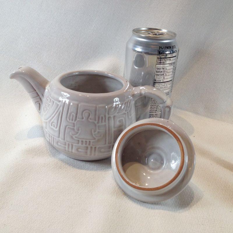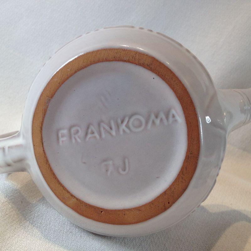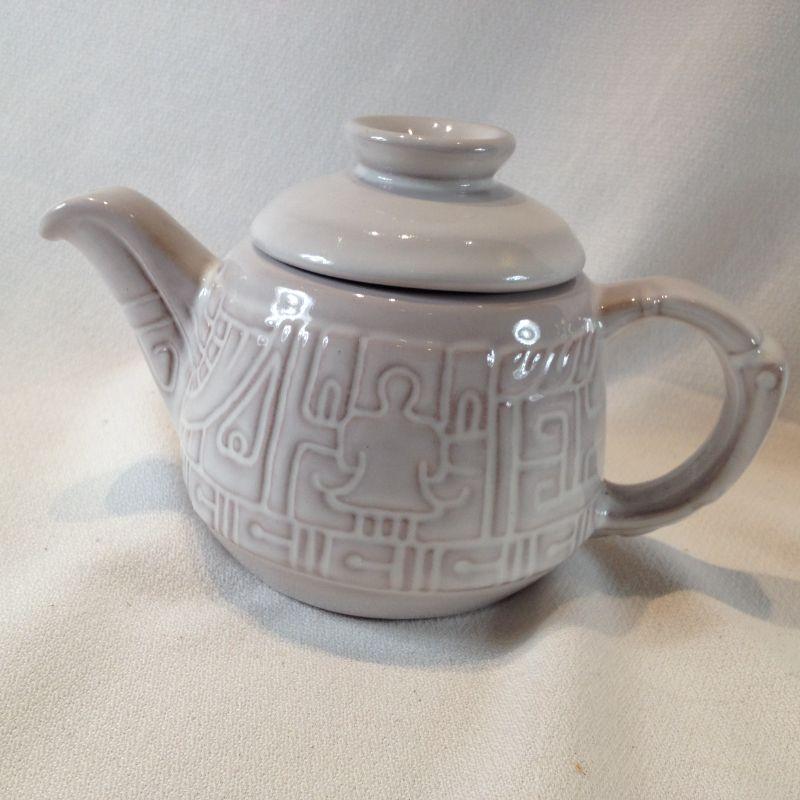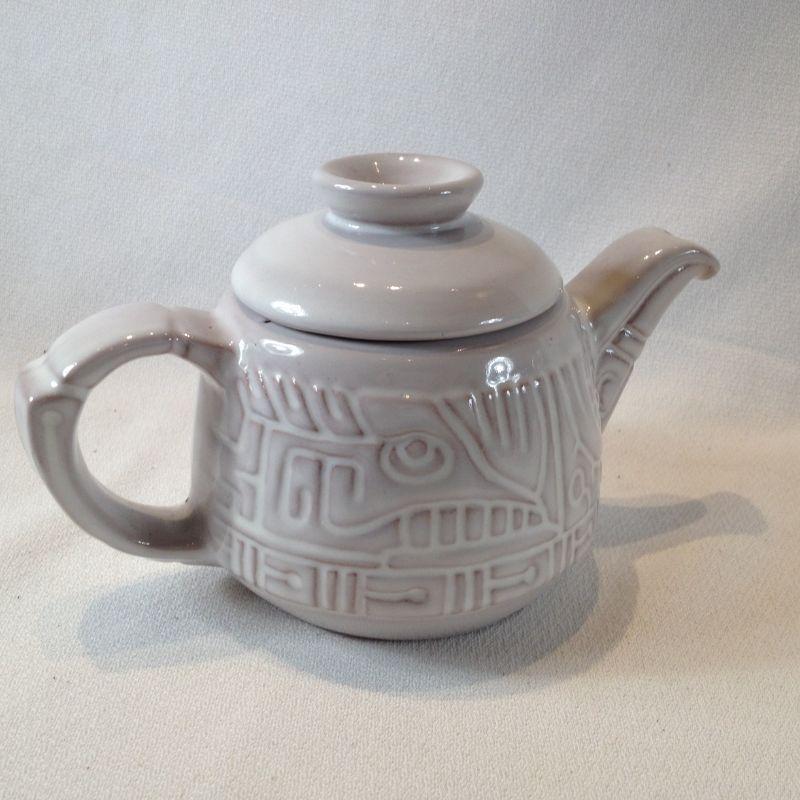 This wonderful teapot is a fine example of the Frankoma school of pottery. This pot is in an unusually decorated white tea pot with a unique relief decoration. Frankoma Pottery is an American pottery company located in Sapulpa, Oklahoma. The company is widely known for its sculptures and dinnerware although the company made many other products including figurines, trivets, and vases. All Frankoma pottery is made in the U.S. from locally dug clay.