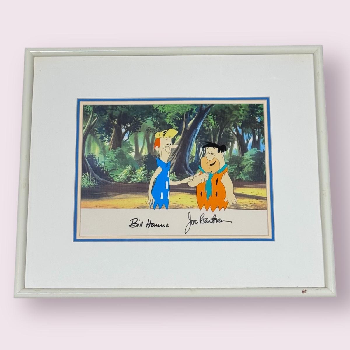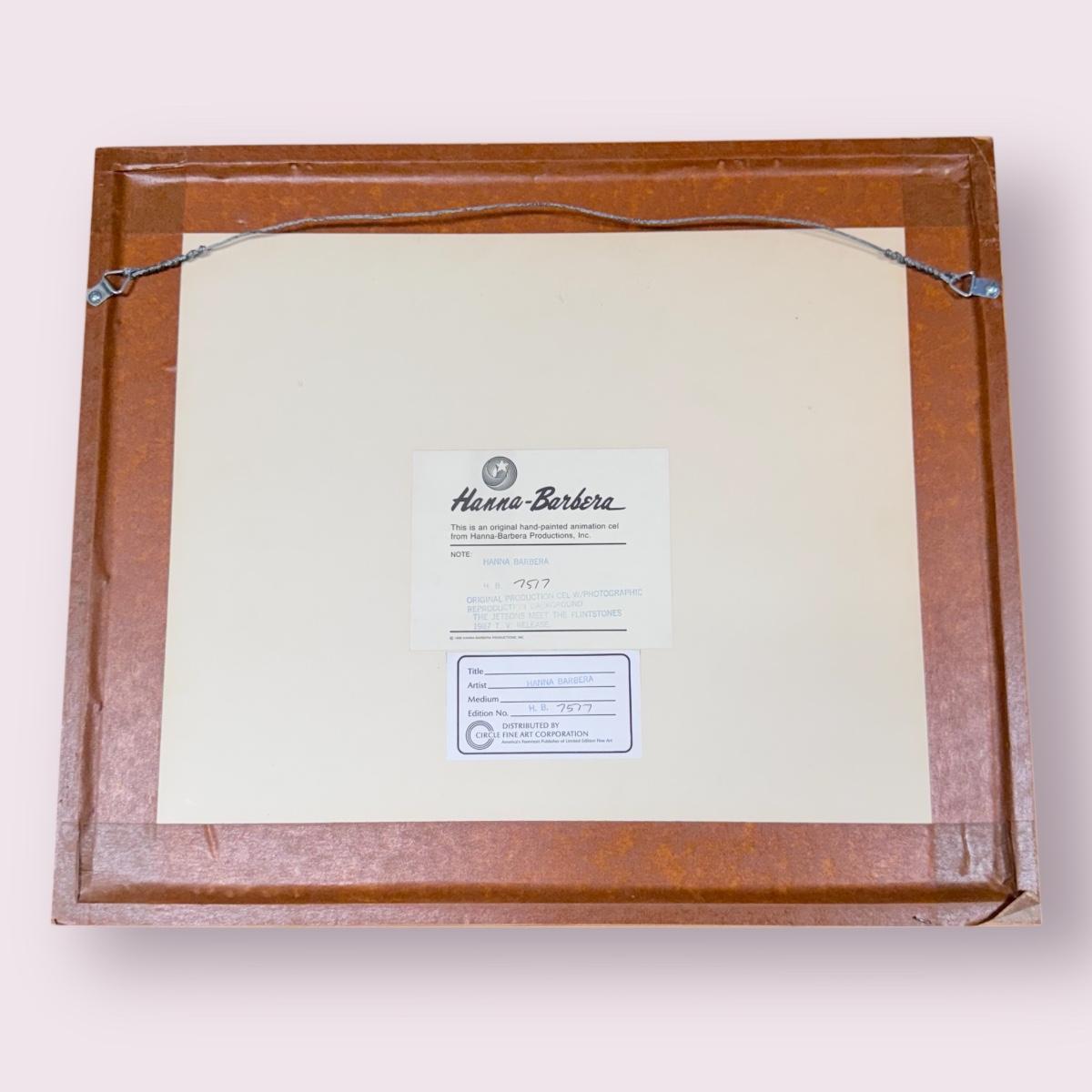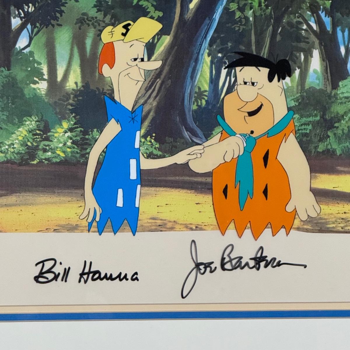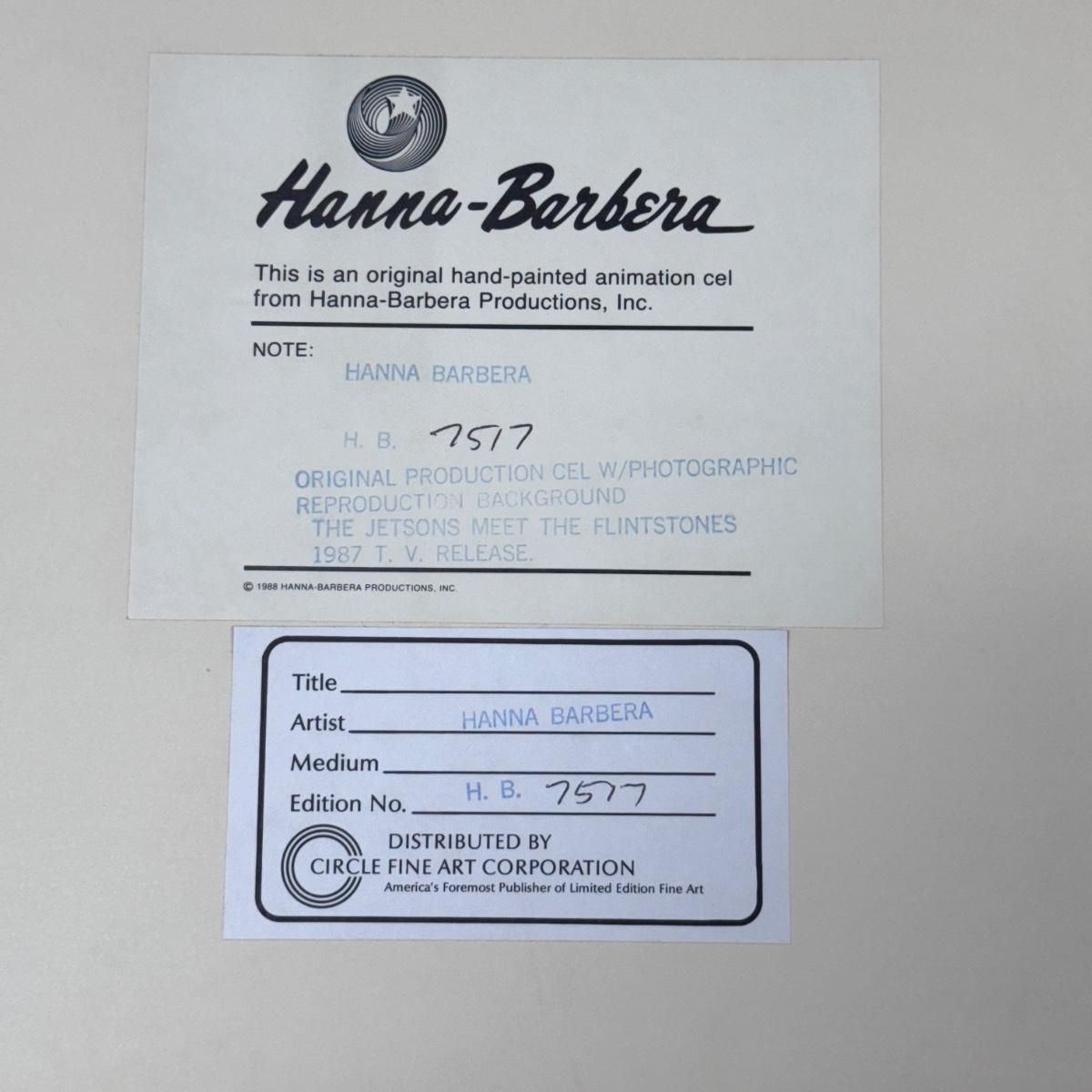 This lot includes one framed cel The Jetsons meet the Flintstones by Hanna-Barbera Productions. It appears to be signed by Bill Hanna and Joe Barbera. Production 7517 1987 with photographic background as stated on label on back of frame. The frame appears to be wooden, painted with an off-white glossy paint. The frame measures 19” x 16”H and has a few stains that appear to be removable. The art is protected with a plastic layer and three mattings.