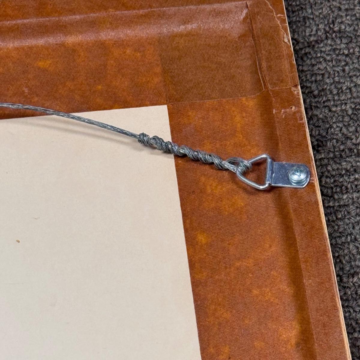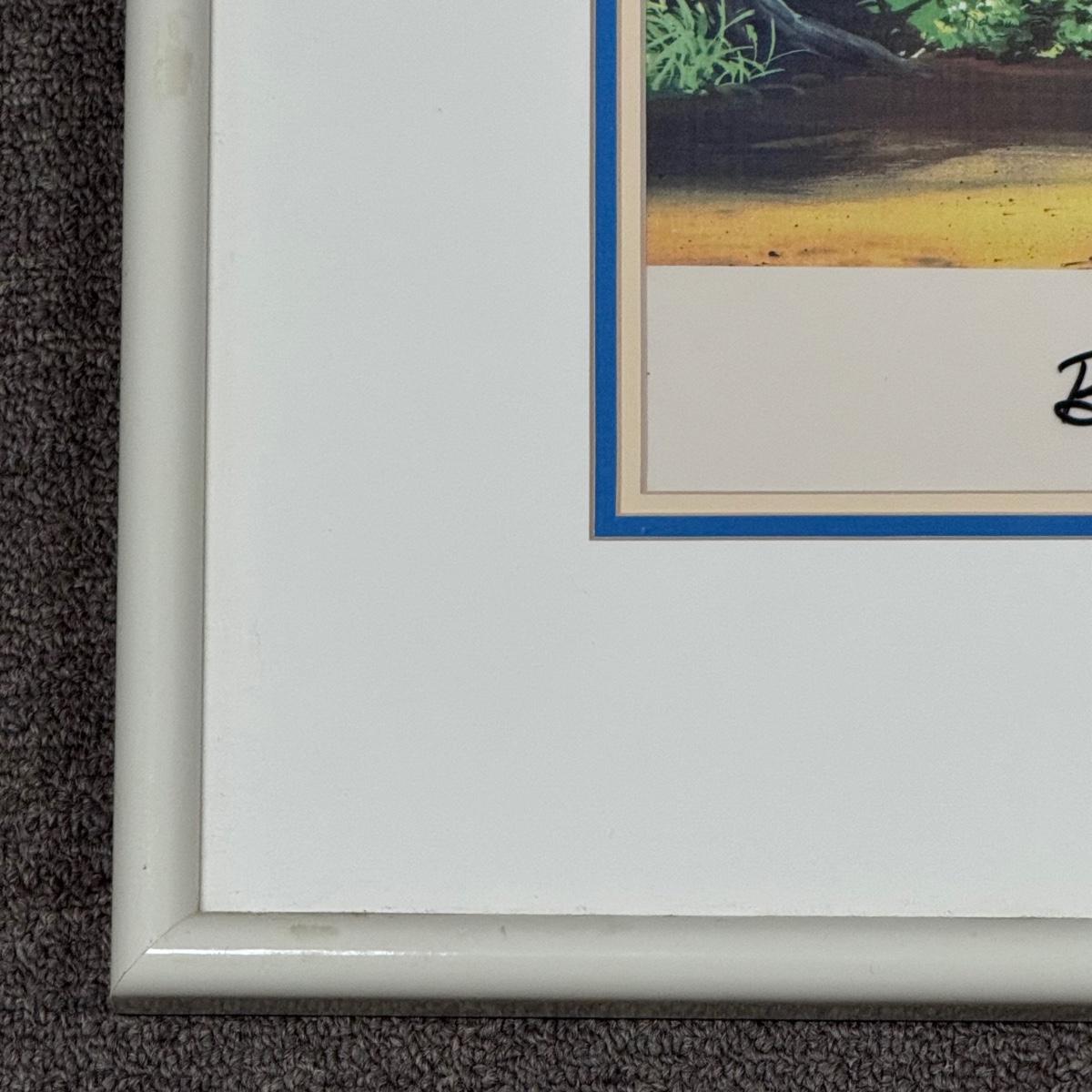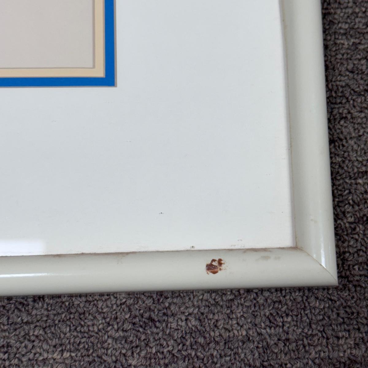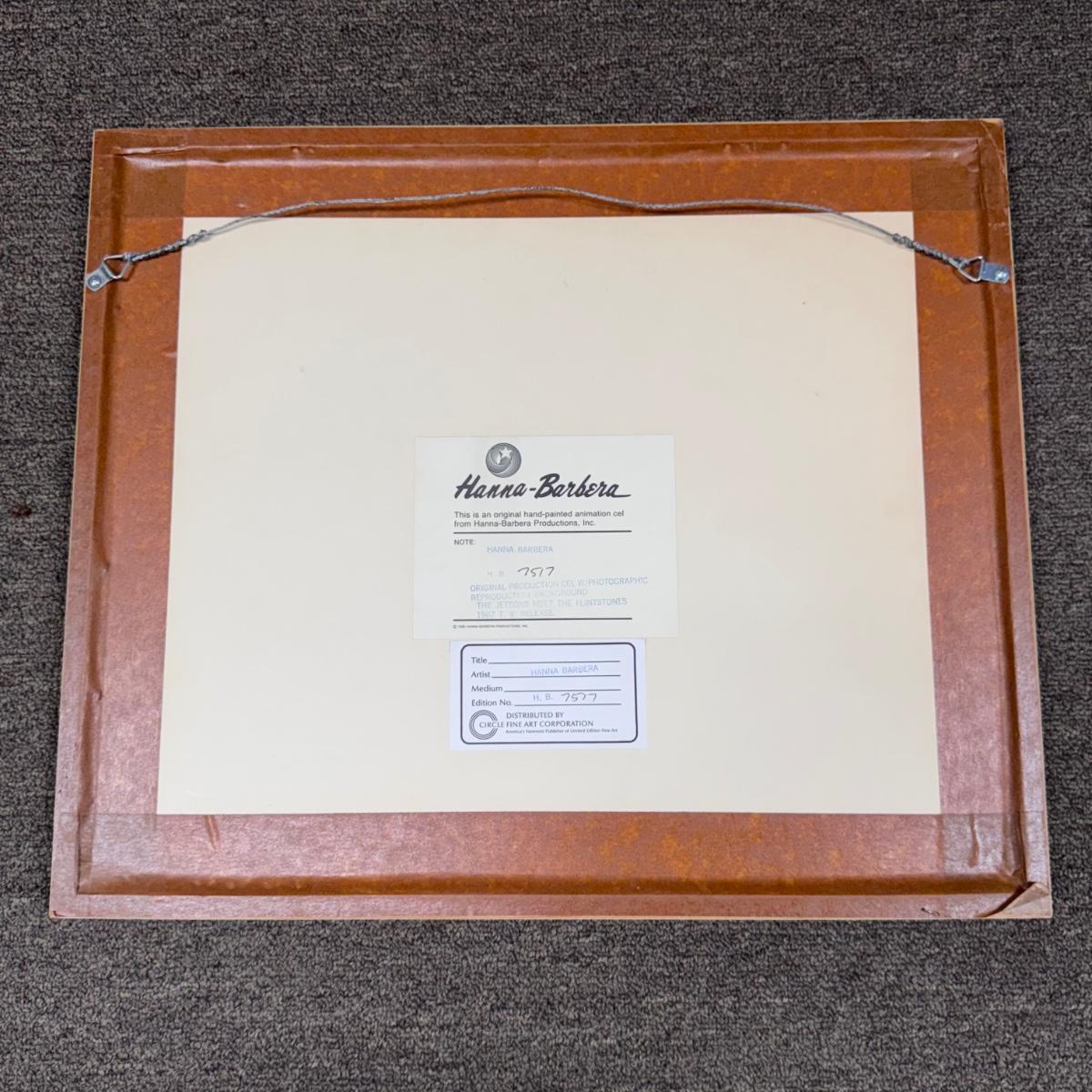 This lot includes one framed cel The Jetsons meet the Flintstones by Hanna-Barbera Productions. It appears to be signed by Bill Hanna and Joe Barbera. Production 7517 1987 with photographic background as stated on label on back of frame. The frame appears to be wooden, painted with an off-white glossy paint. The frame measures 19” x 16”H and has a few stains that appear to be removable. The art is protected with a plastic layer and three mattings.