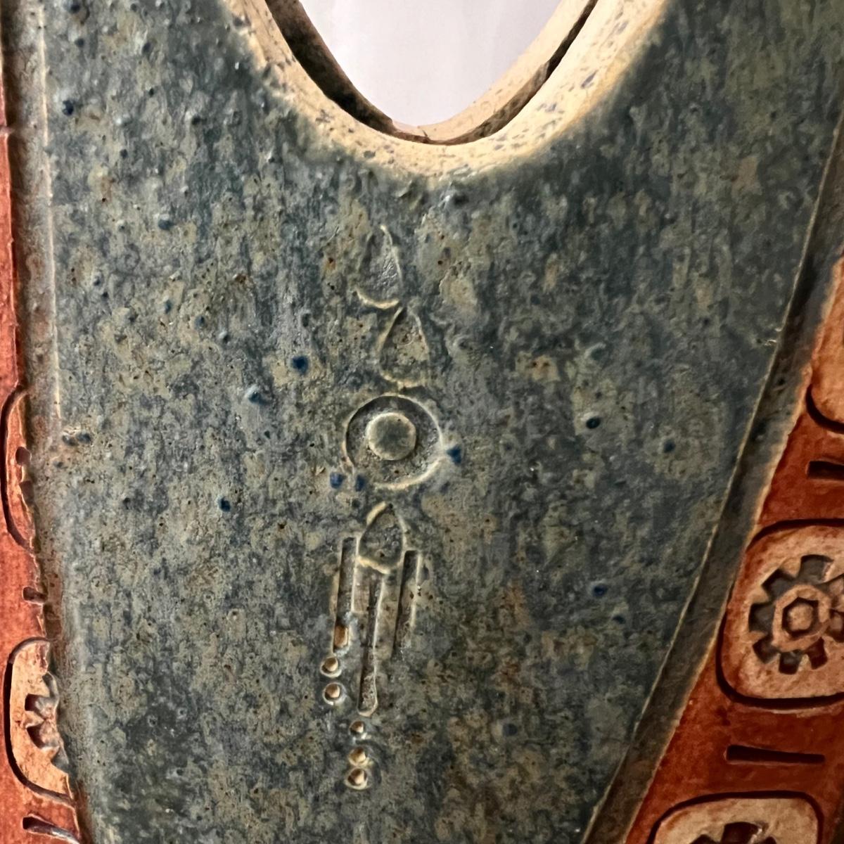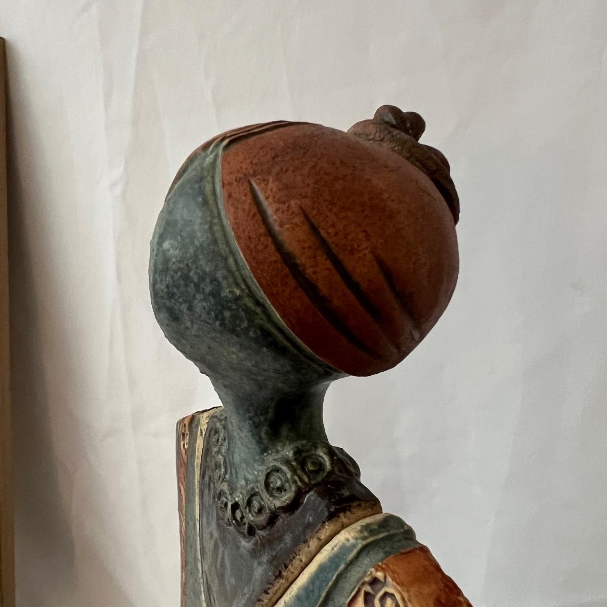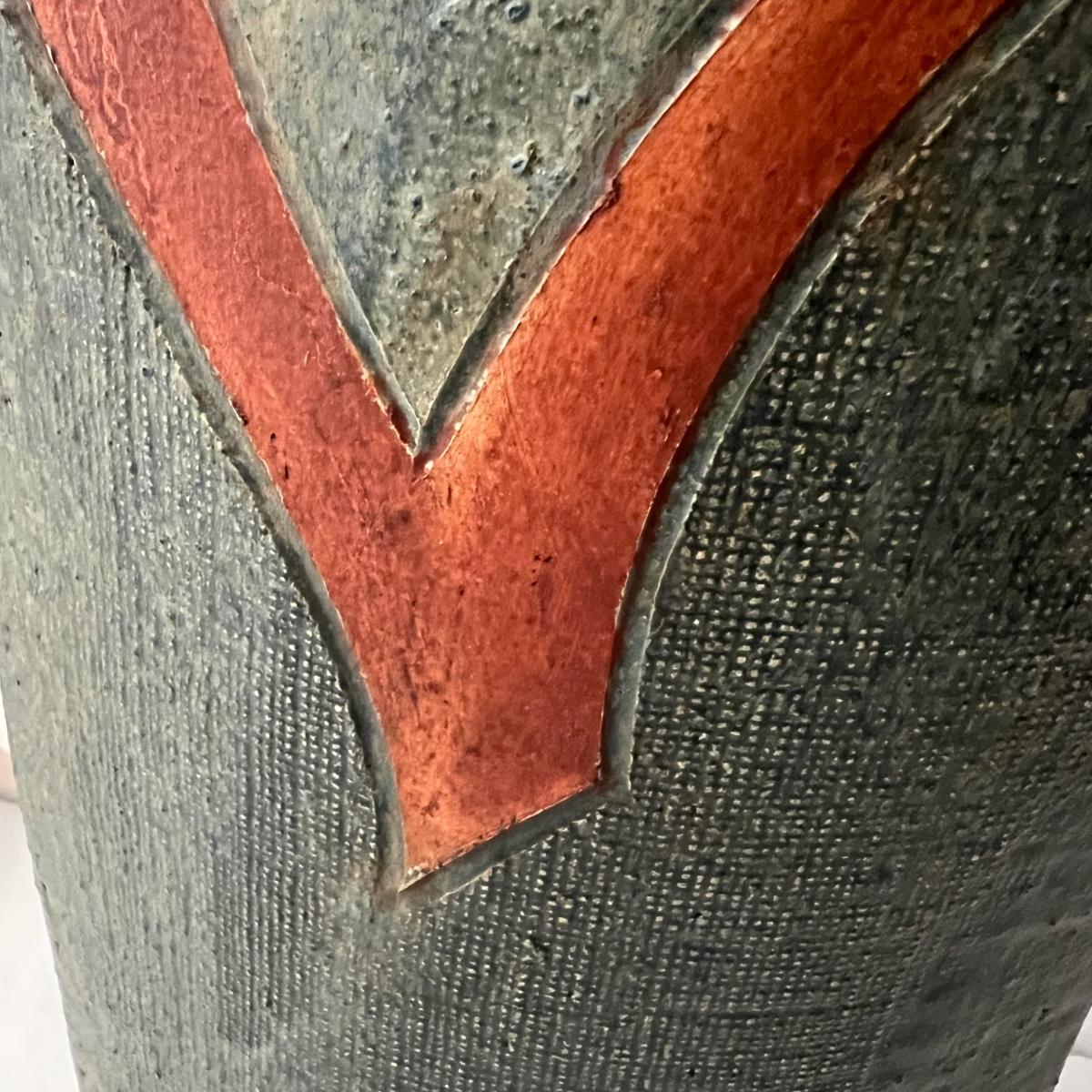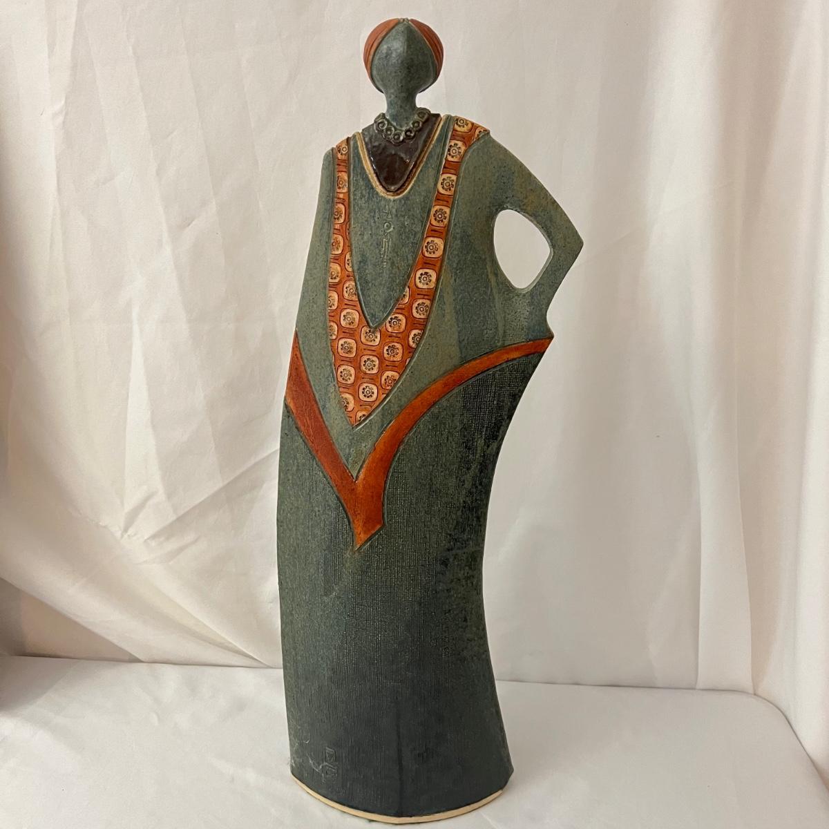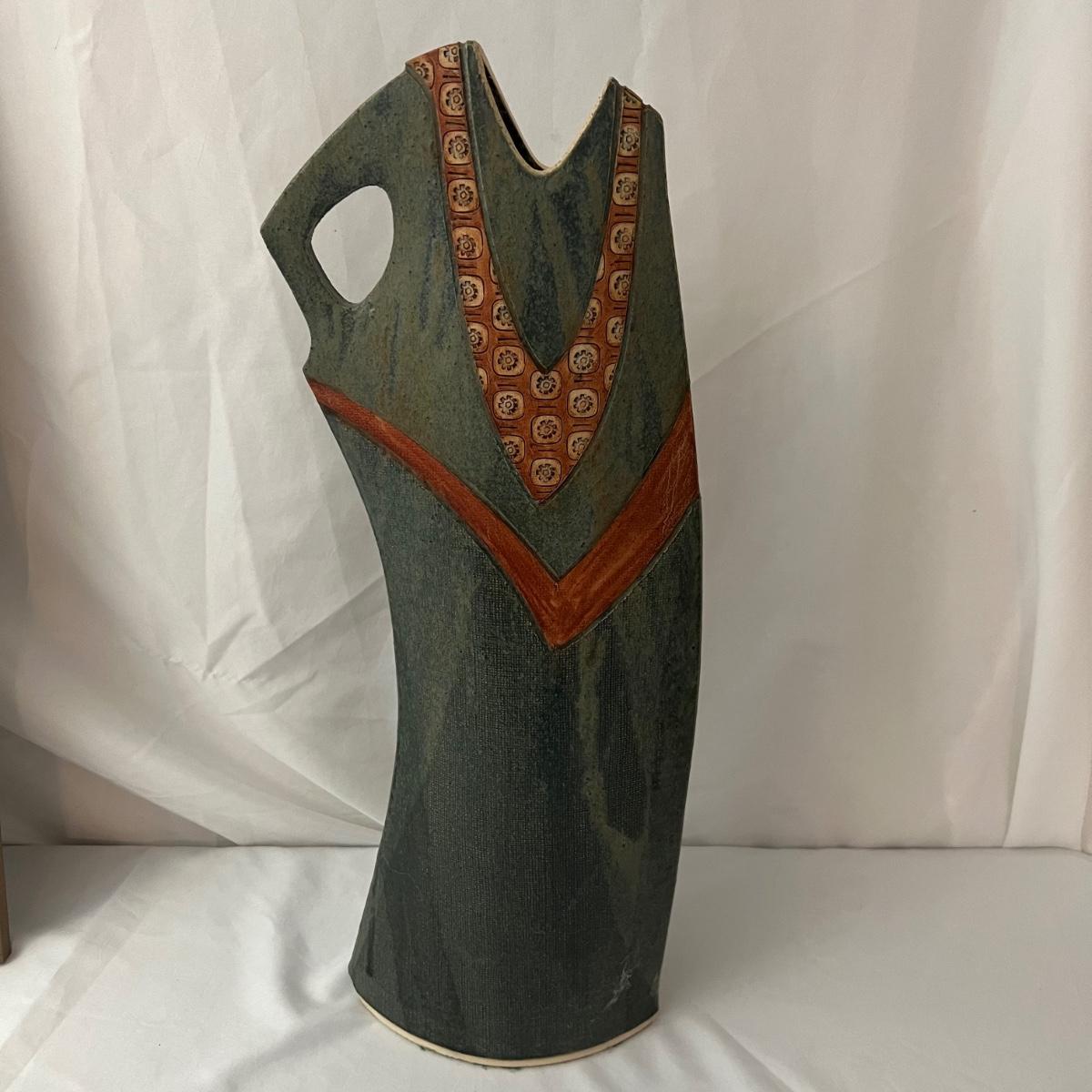 This Fred Weisener pottery sculpture measures 10” x 5” x 30”H. This slab built “˜Standing Lady’ has a head that is the lid, with a wood dowel to hold it securely into place.