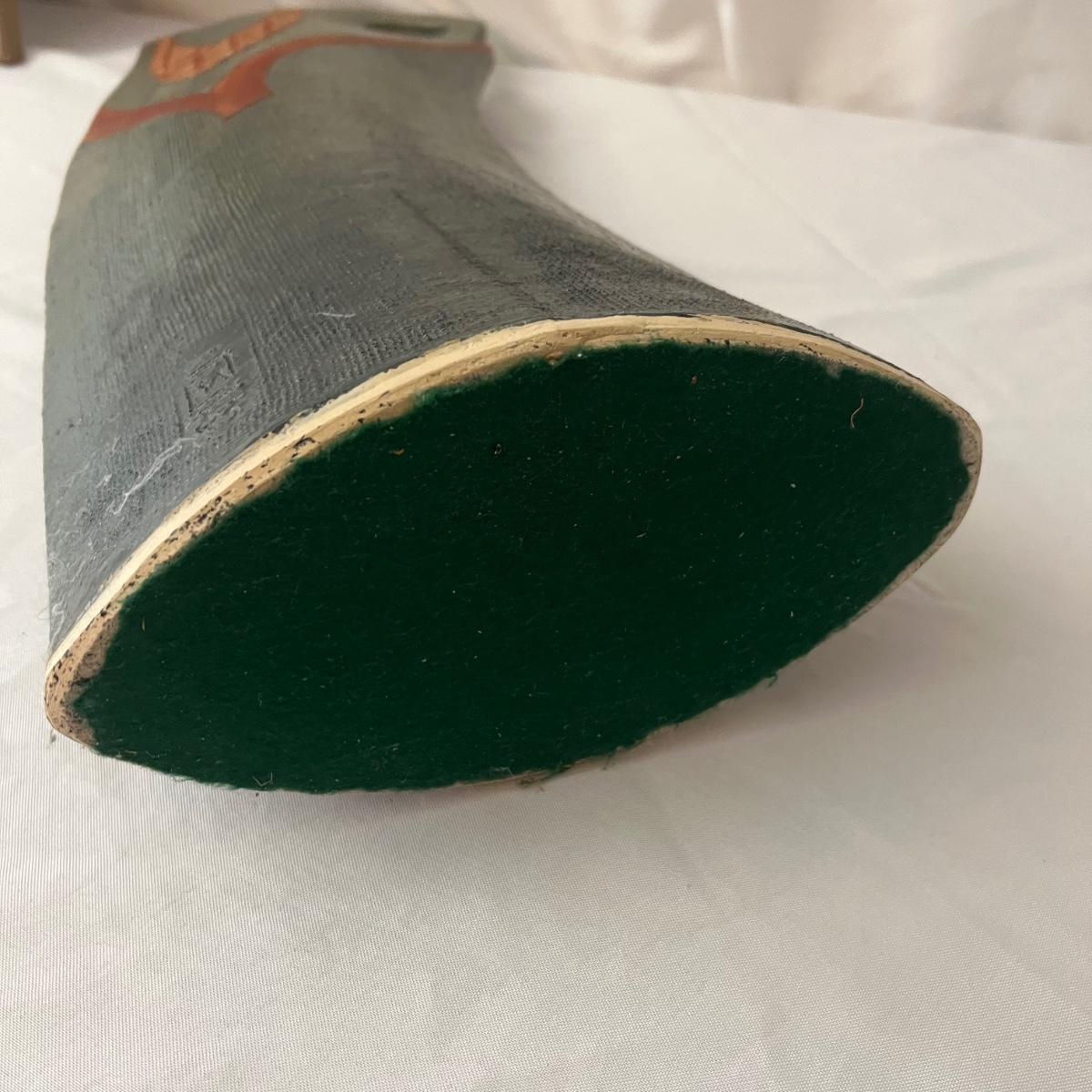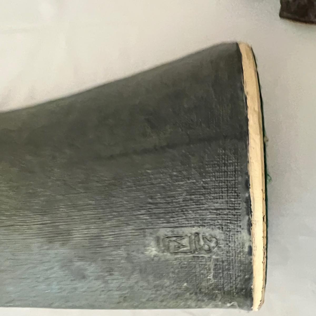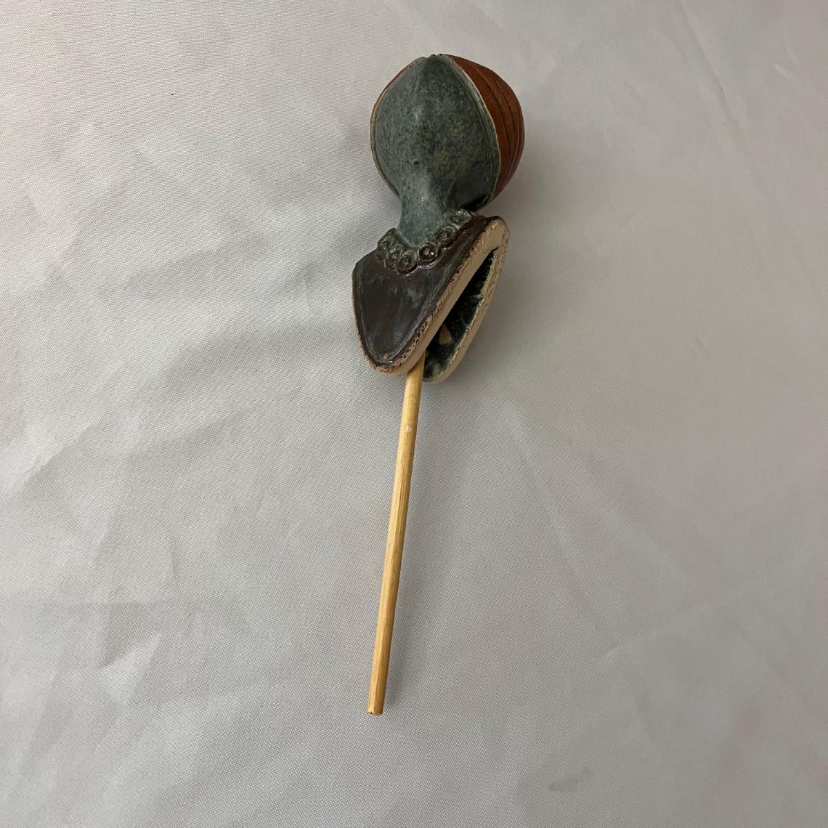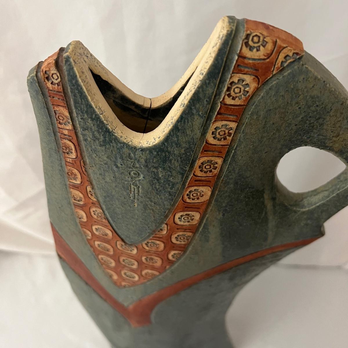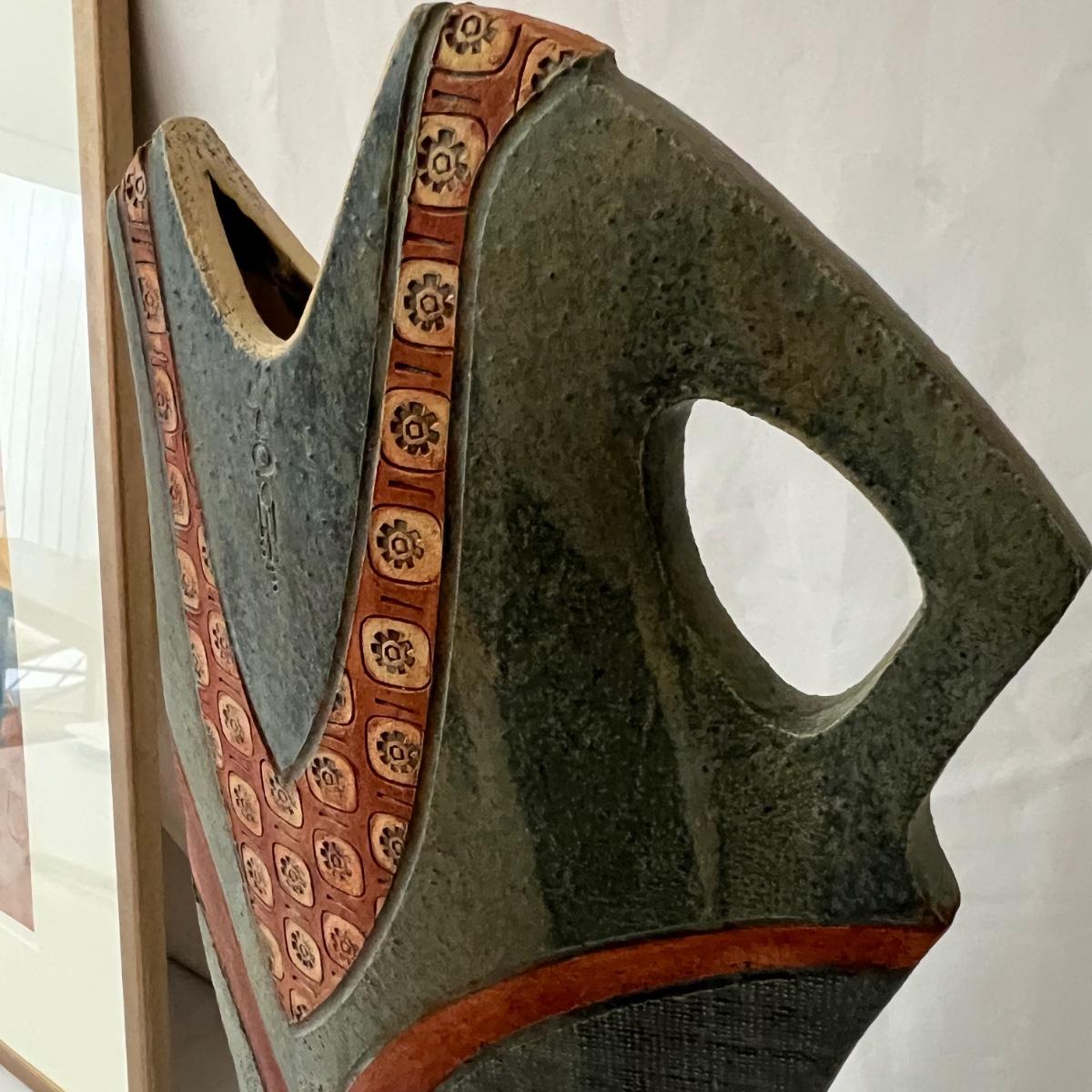 This Fred Weisener pottery sculpture measures 10” x 5” x 30”H. This slab built “˜Standing Lady’ has a head that is the lid, with a wood dowel to hold it securely into place.