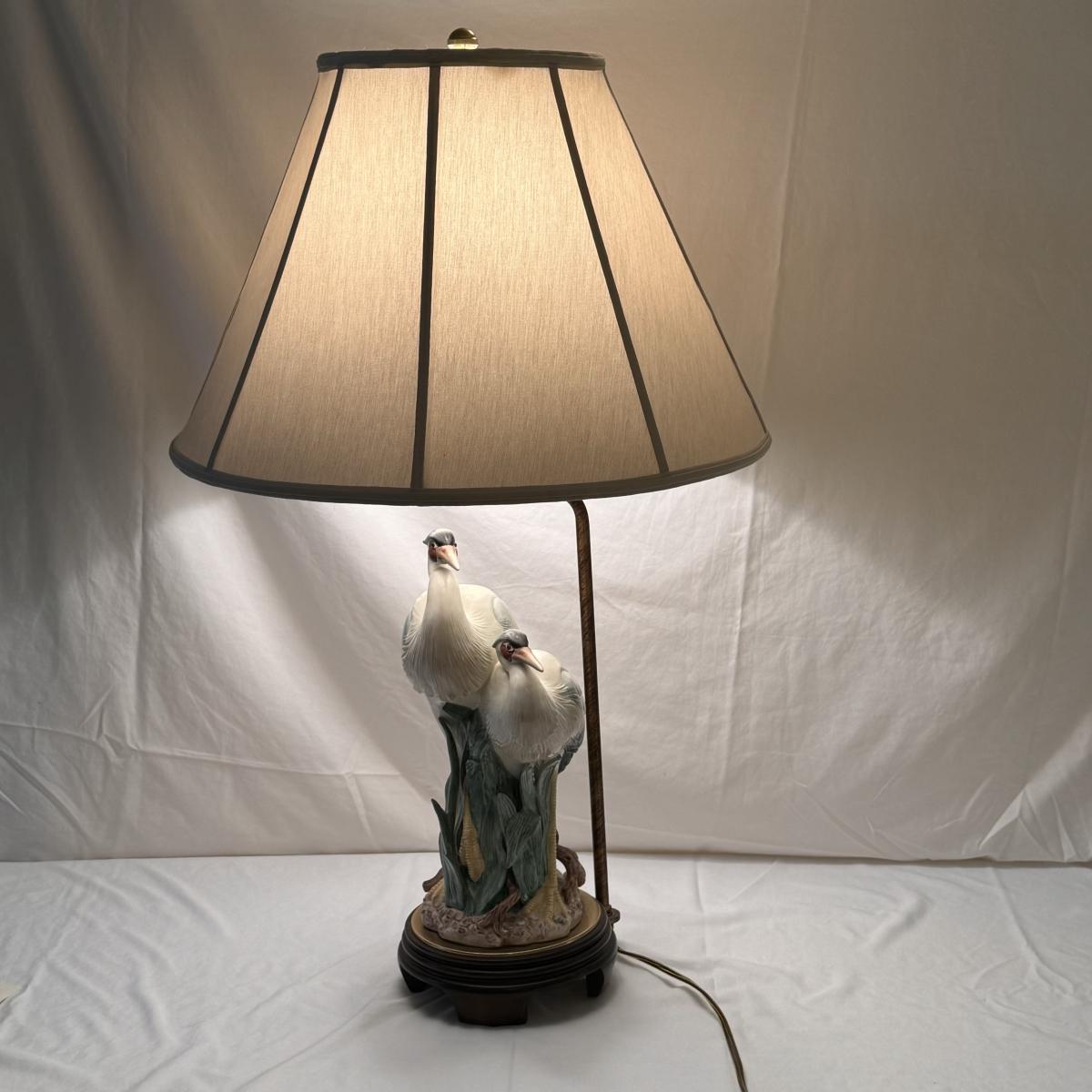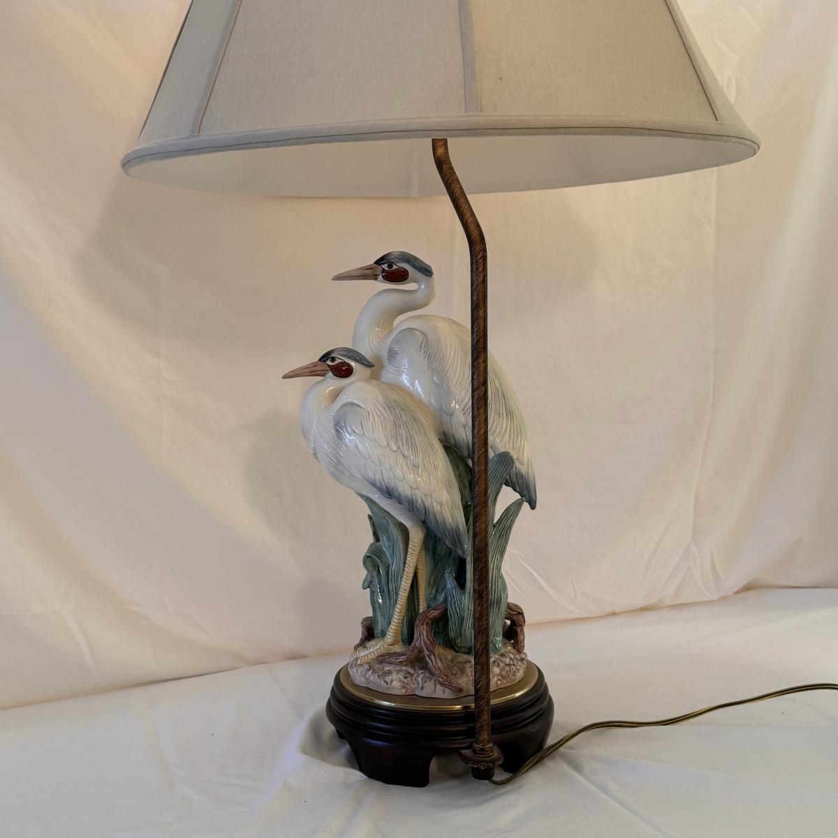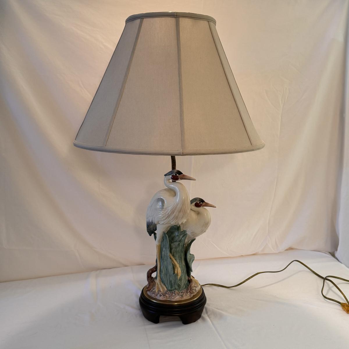 This lot includes one Frederick Cooper table lamp of two herons. Heron’s are ceramic. The lamp powered on when plugged in and has an in/off switch- see picture included. The base is wooden. The lamp with the lampshade included measures 20” x 32”H. Shipping available.