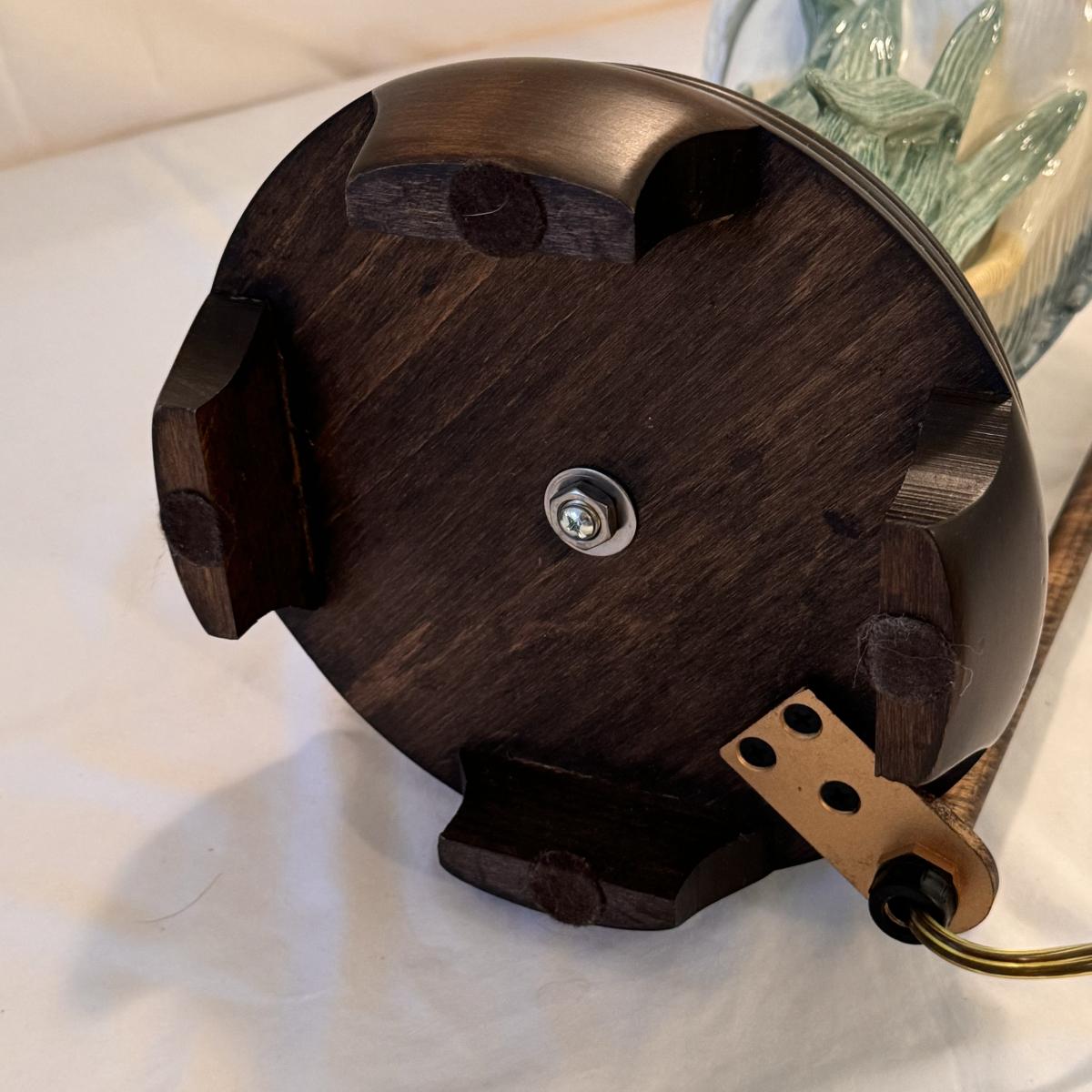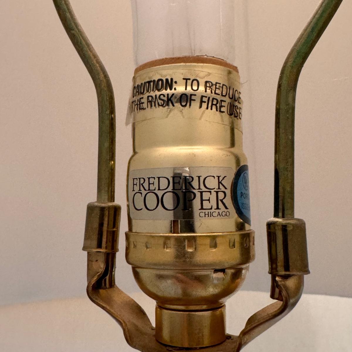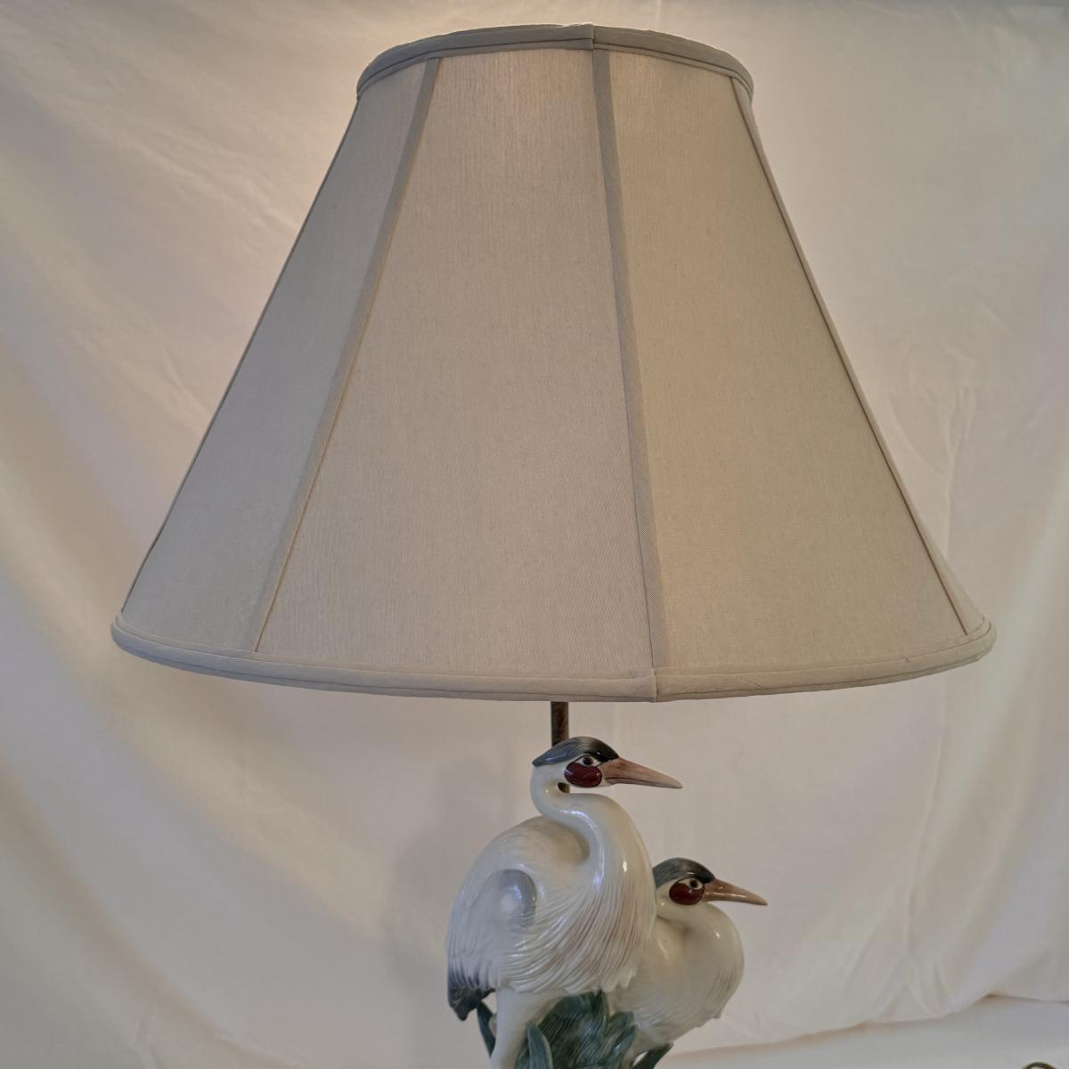 This lot includes one Frederick Cooper table lamp of two herons. Heron’s are ceramic. The lamp powered on when plugged in and has an in/off switch- see picture included. The base is wooden. The lamp with the lampshade included measures 20” x 32”H. Shipping available.