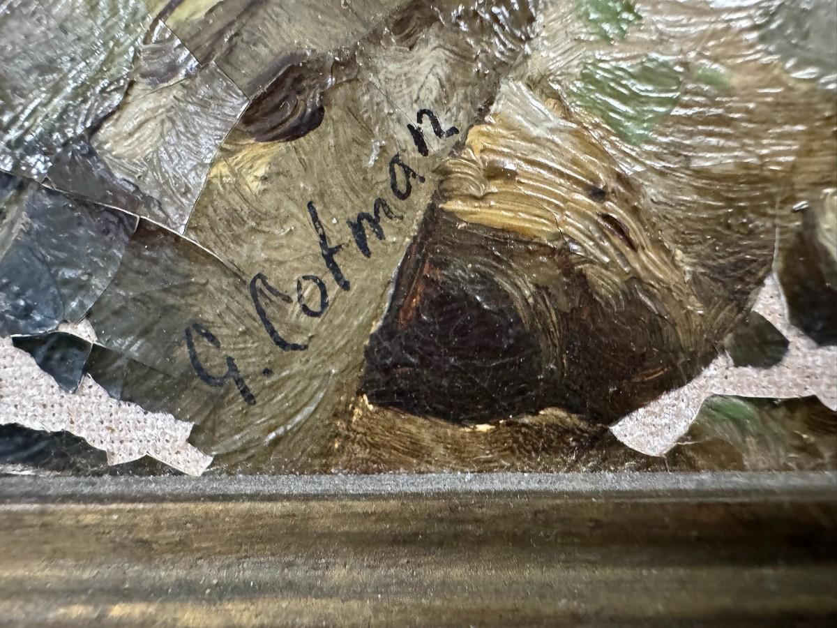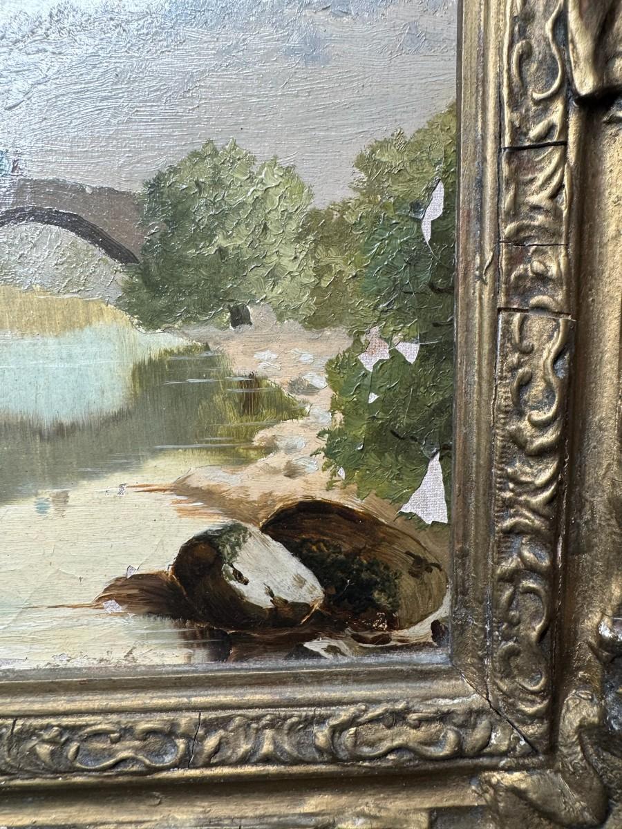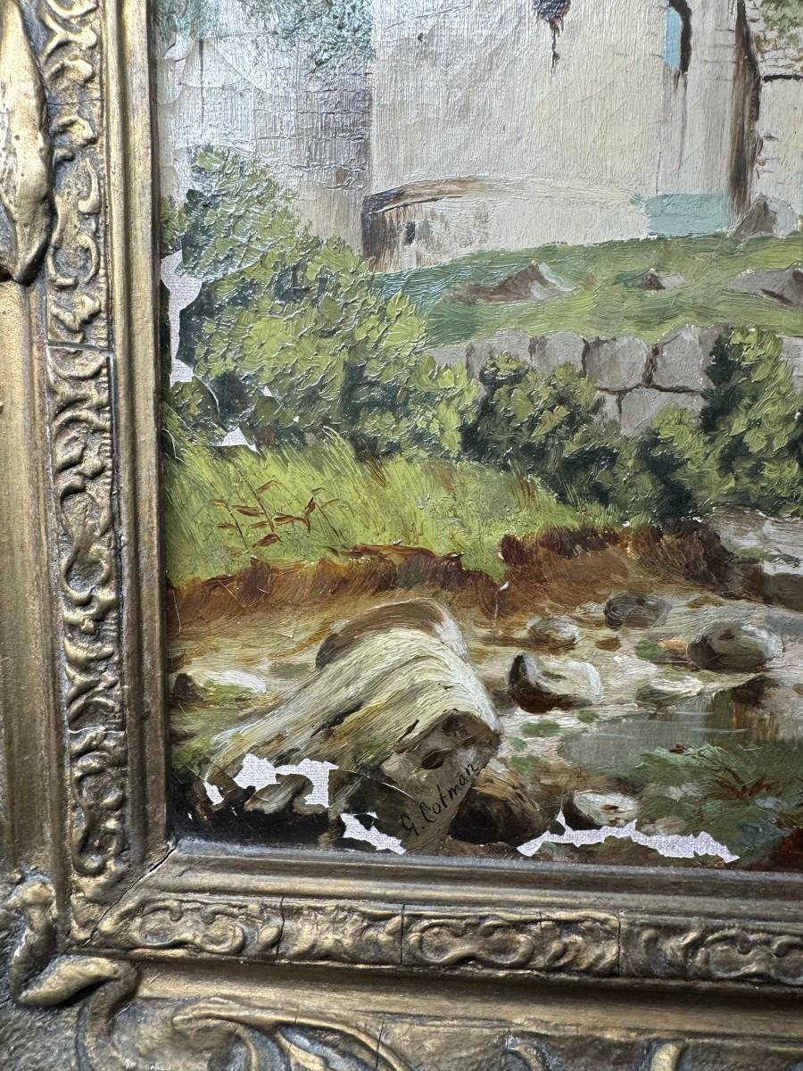 This late Victorian piece depicts an English castle scene with a stream. There is some paint loss (pictured). There are no tears, and little wear to the gesso. Measurement: 22”H x 28”W (framed). Pre-auction estimate: $500-$750. [JP]