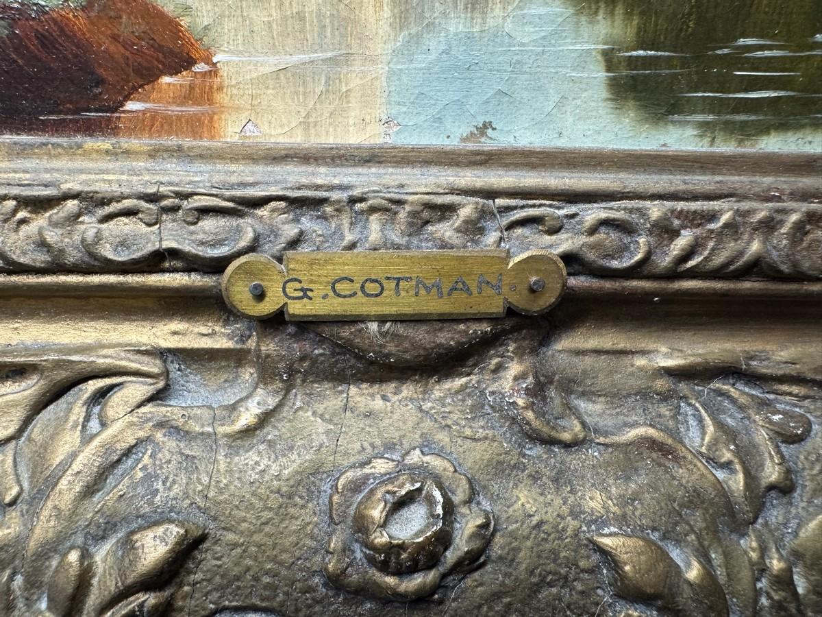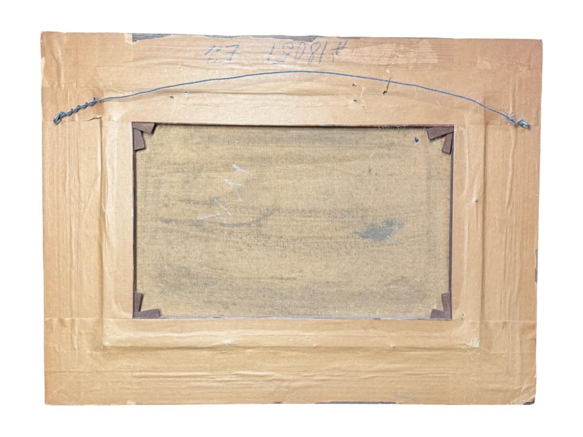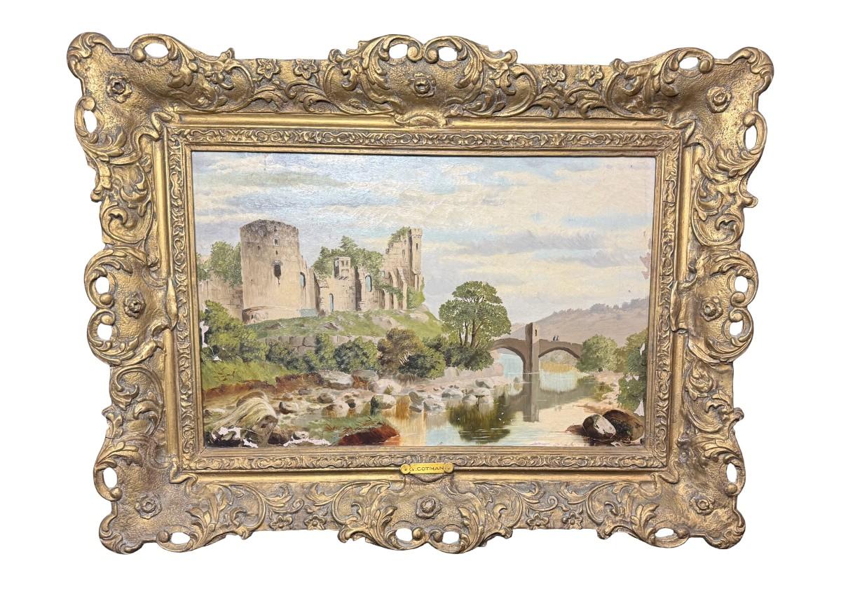 This late Victorian piece depicts an English castle scene with a stream. There is some paint loss (pictured). There are no tears, and little wear to the gesso. Measurement: 22”H x 28”W (framed). Pre-auction estimate: $500-$750. [JP]