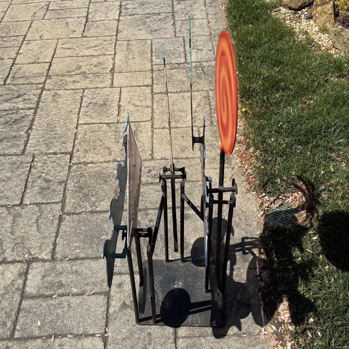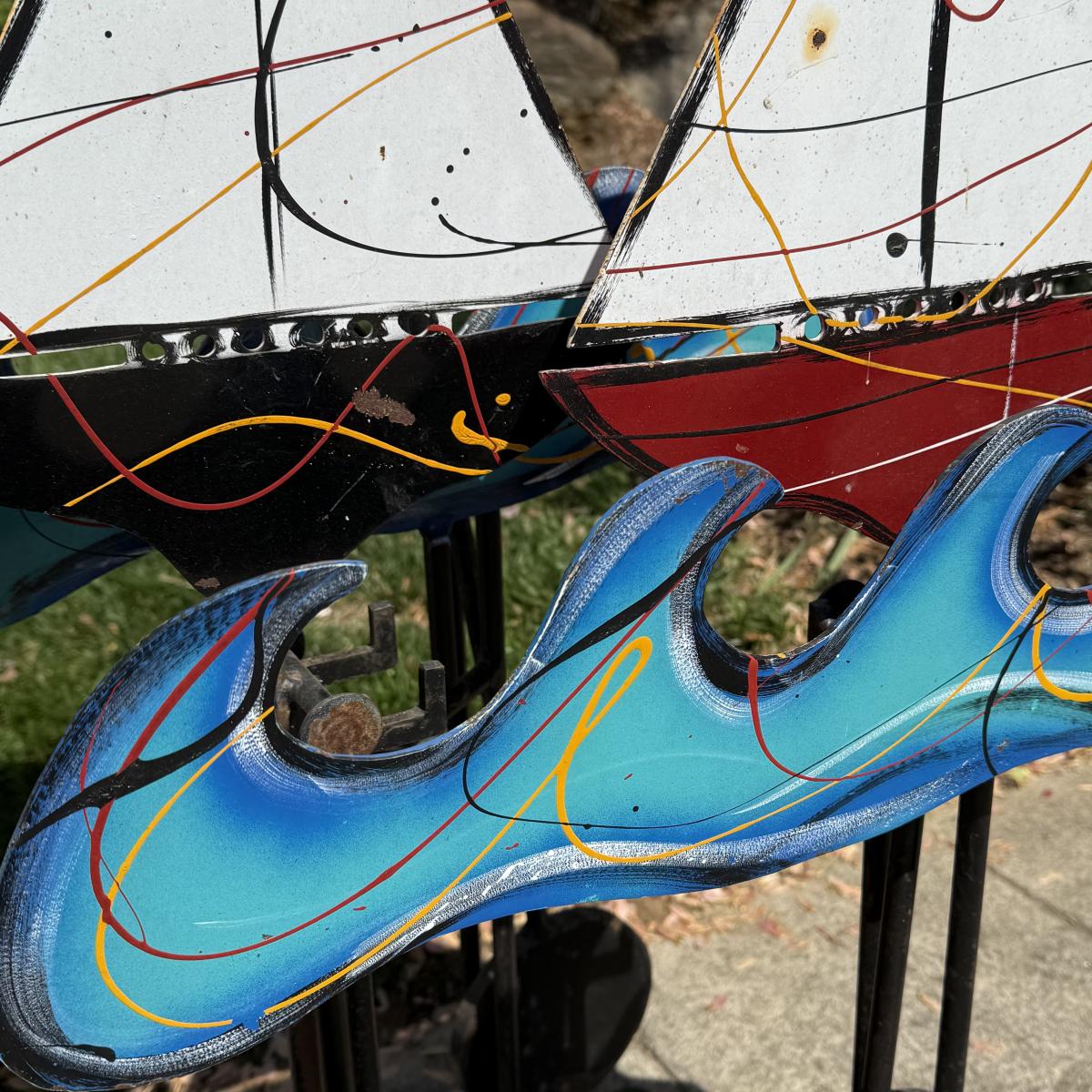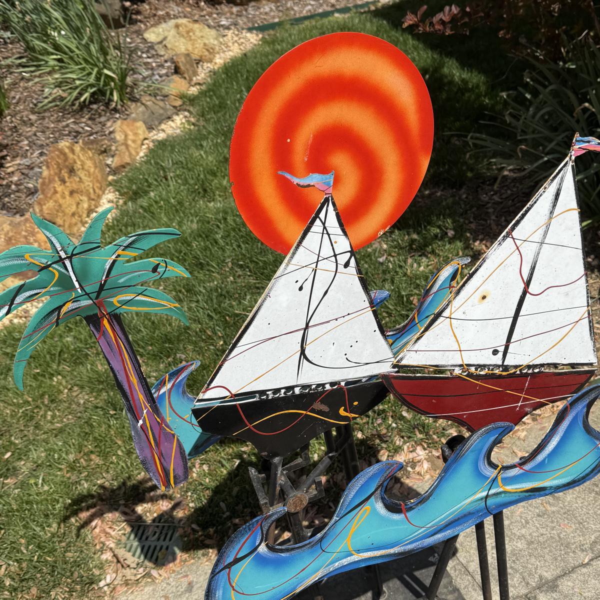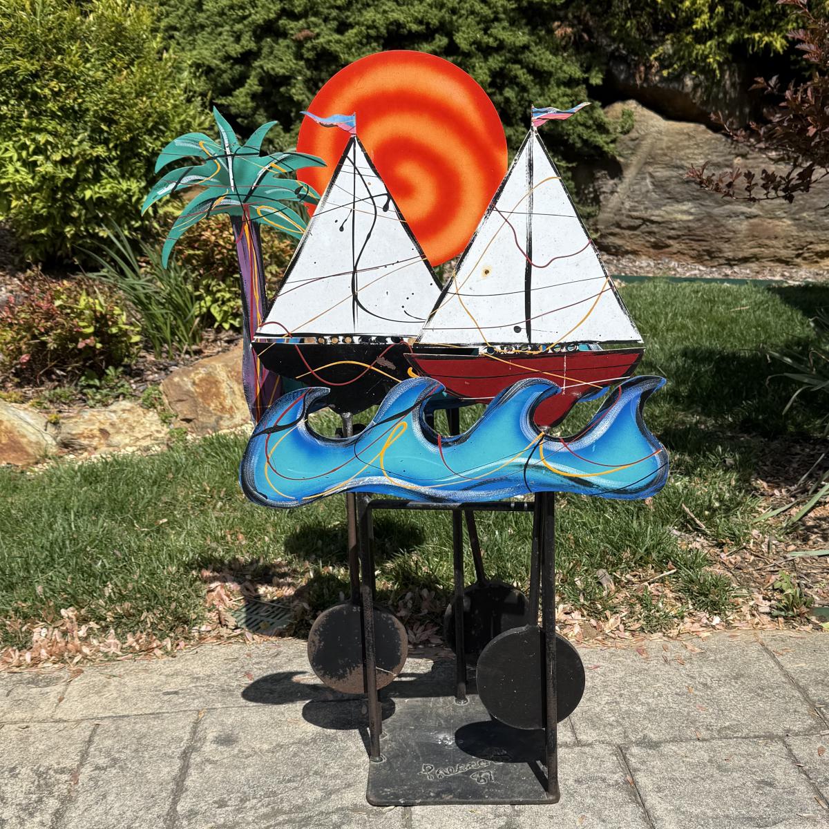 Fun and colorful kinetic sailboat sculpture by Frederick Prescott. Sculpture base is signed “Prescott 87”. The sculpture is made of metal and is painted. The sun and two sailboats are not attached; they rest in their places and have kinetic movements. The sculpture is quite heavy, but easier to move when the sun and sailboats are removed. It measures approximately 24” x 12” x 37.5”H. The paint has worn in some spots and there is some rust on the sculpture.