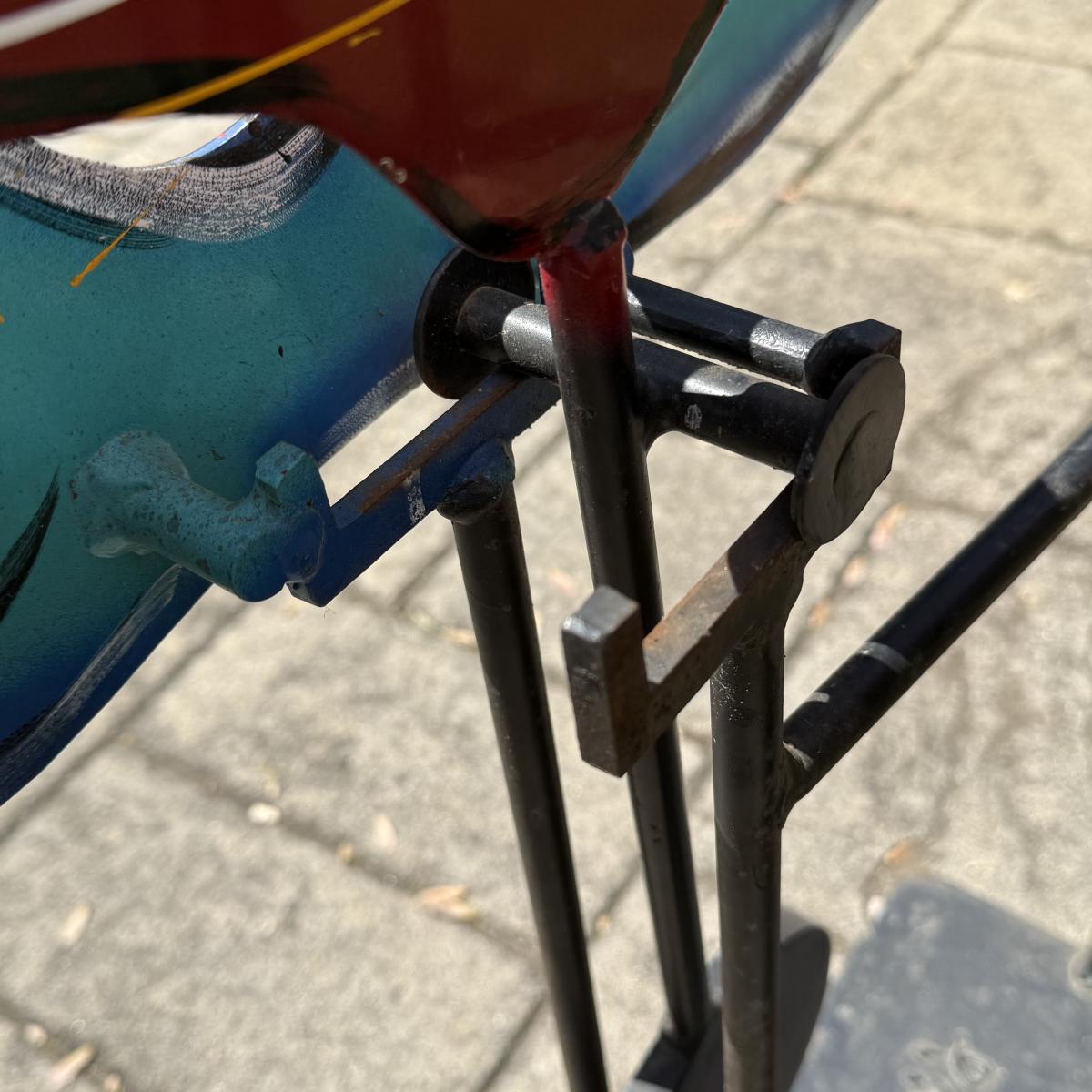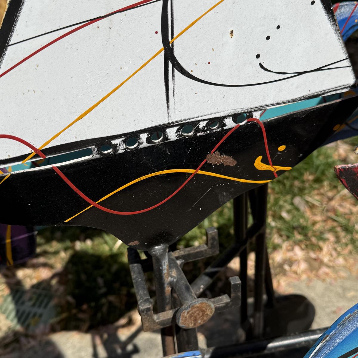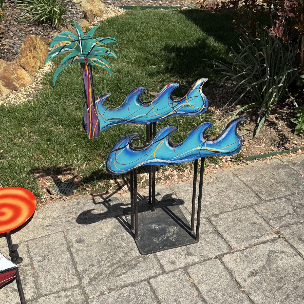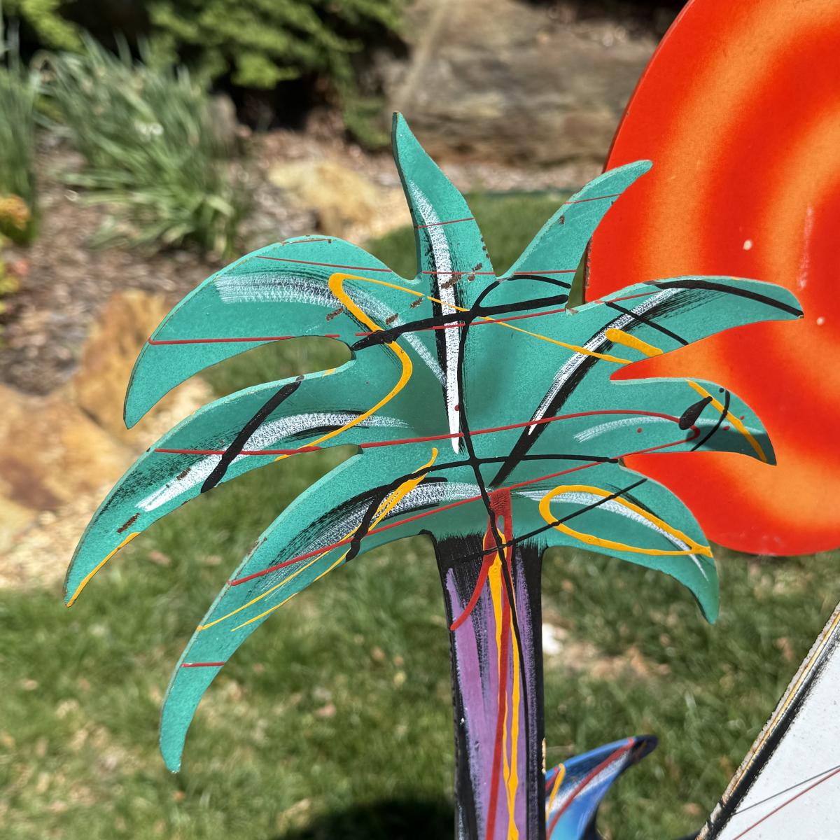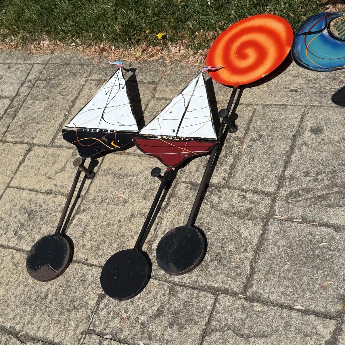 Fun and colorful kinetic sailboat sculpture by Frederick Prescott. Sculpture base is signed “Prescott 87”. The sculpture is made of metal and is painted. The sun and two sailboats are not attached; they rest in their places and have kinetic movements. The sculpture is quite heavy, but easier to move when the sun and sailboats are removed. It measures approximately 24” x 12” x 37.5”H. The paint has worn in some spots and there is some rust on the sculpture.
