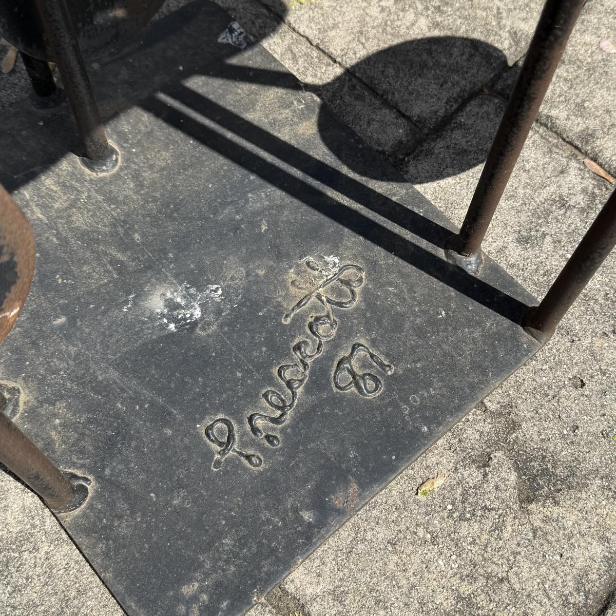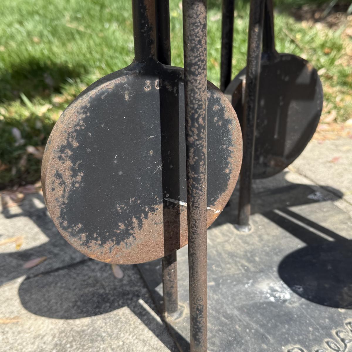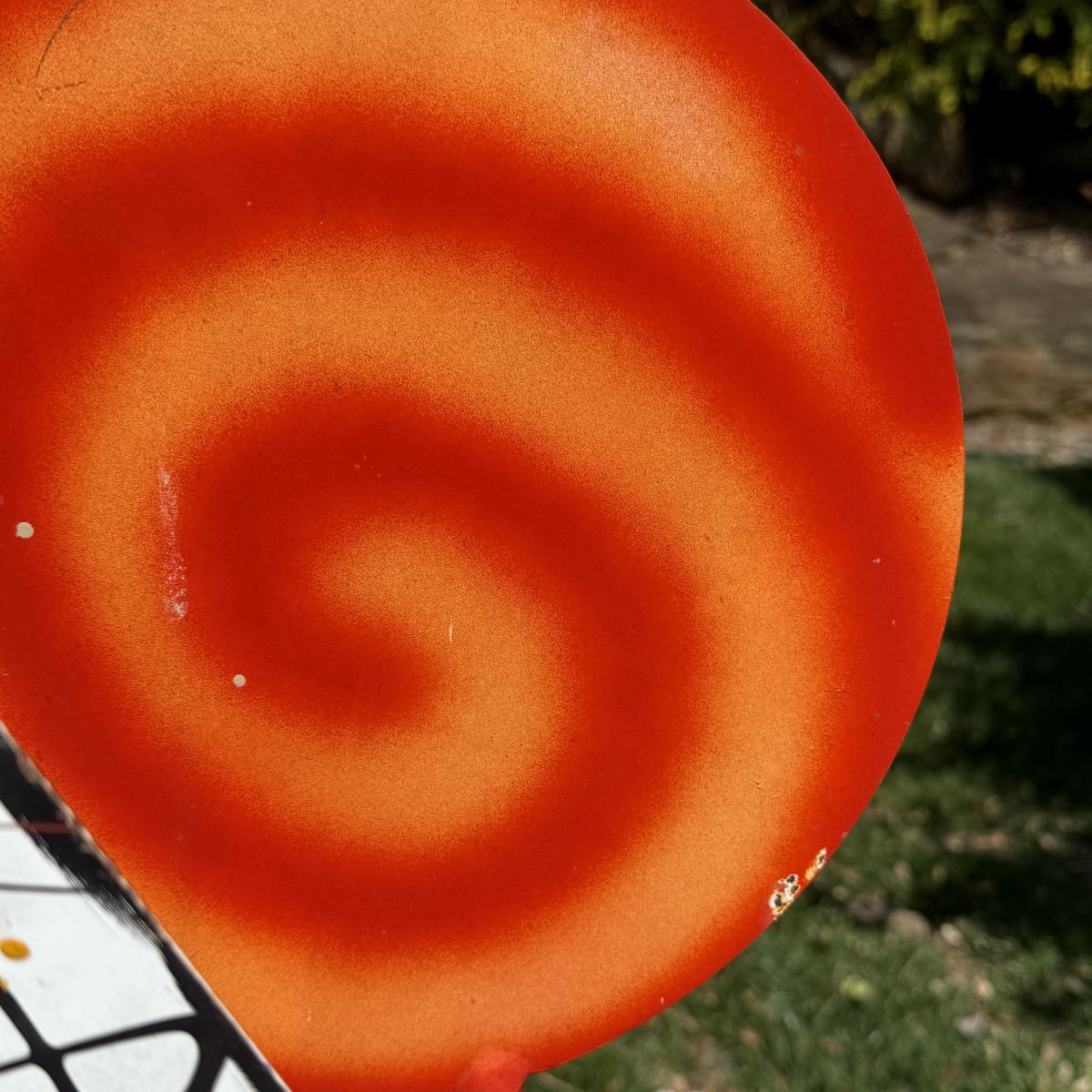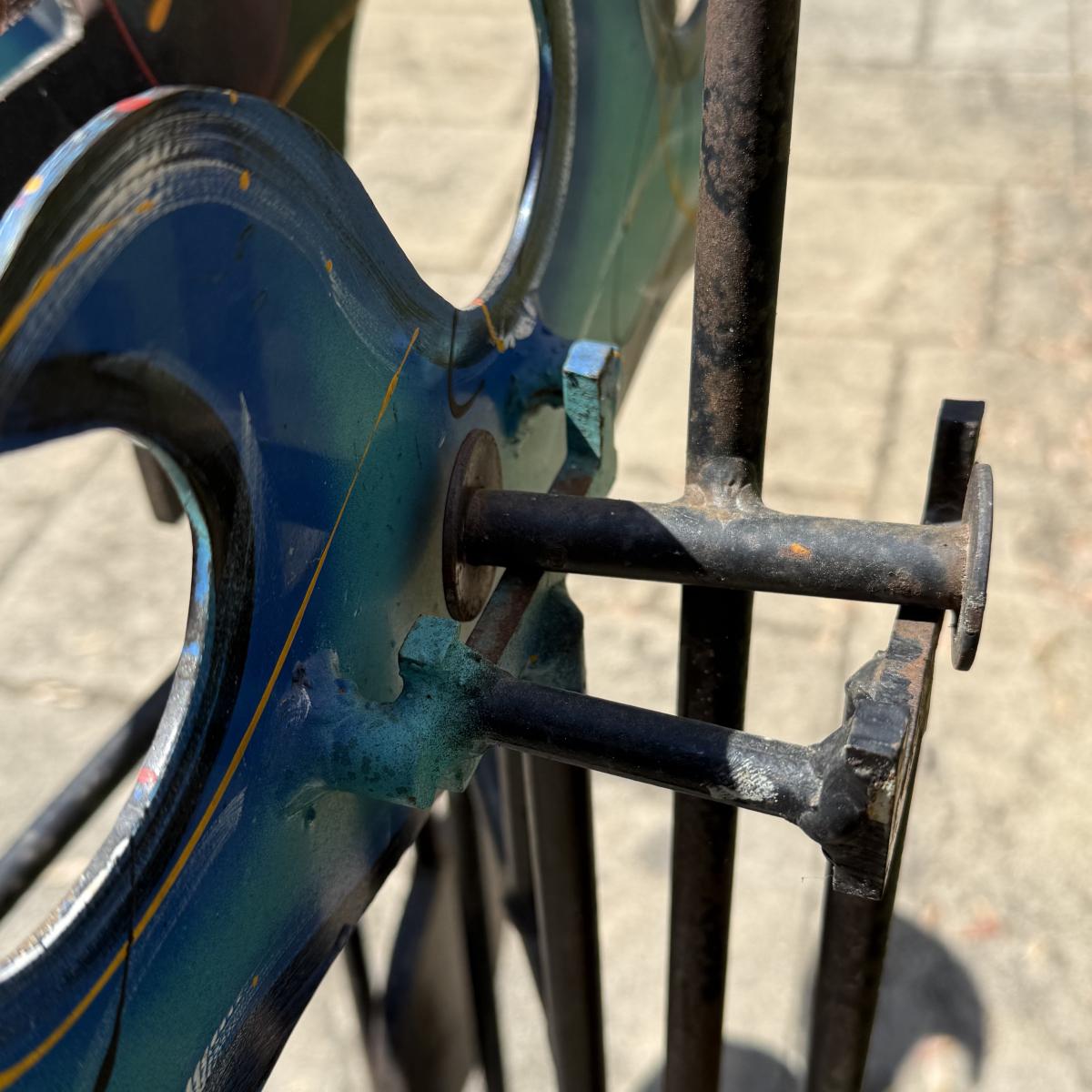 Fun and colorful kinetic sailboat sculpture by Frederick Prescott. Sculpture base is signed “Prescott 87”. The sculpture is made of metal and is painted. The sun and two sailboats are not attached; they rest in their places and have kinetic movements. The sculpture is quite heavy, but easier to move when the sun and sailboats are removed. It measures approximately 24” x 12” x 37.5”H. The paint has worn in some spots and there is some rust on the sculpture.