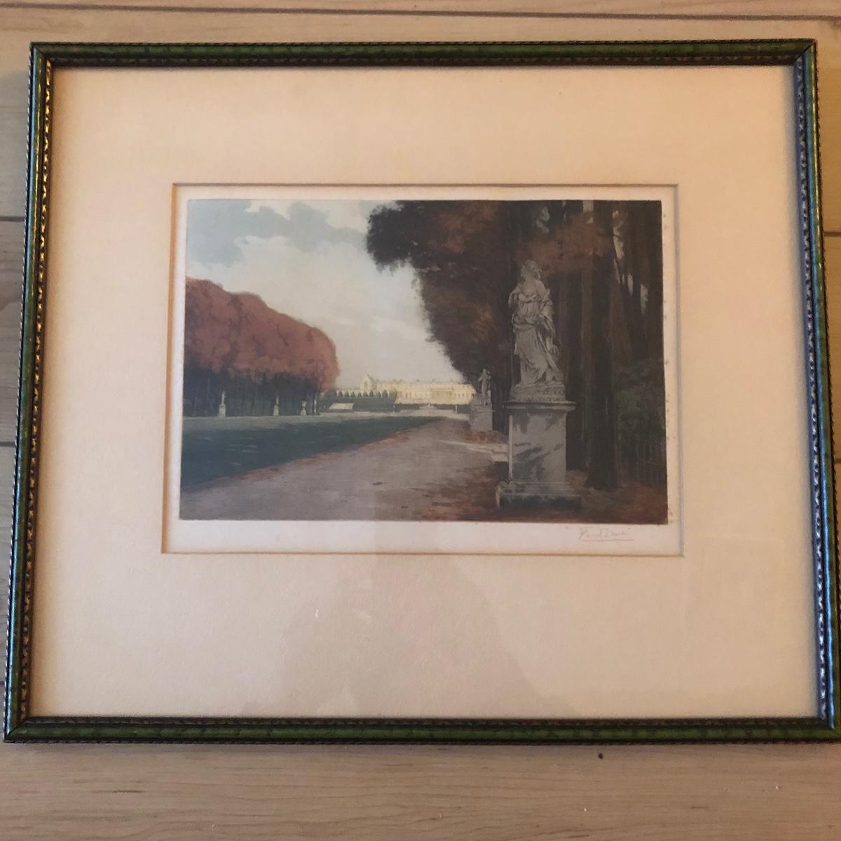 Lot includes Framed, matted and pencil signed aquatint etching by Fredric Leve that is under glass and is titled “The Green Carpet Versailles “. Frame measures 15” x 17”.