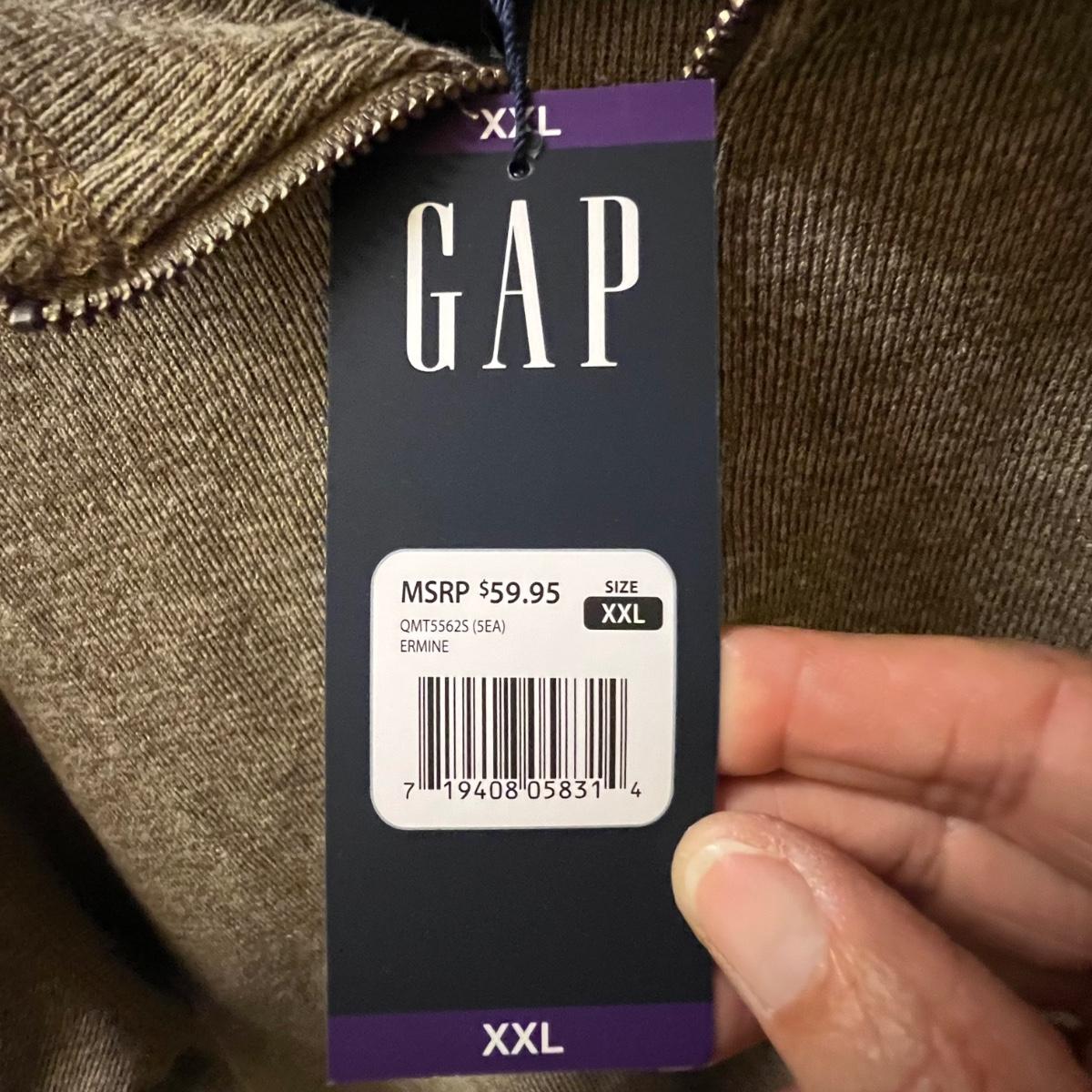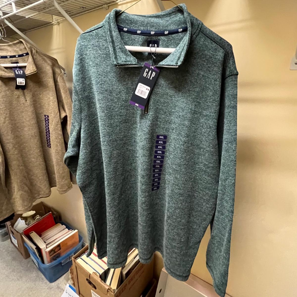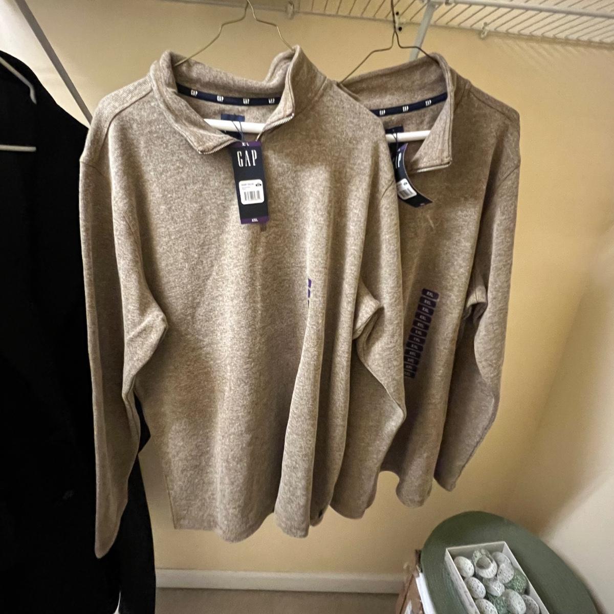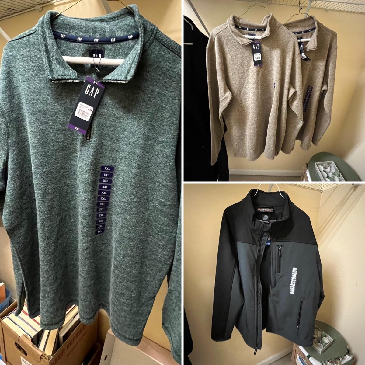 Four clothing items that are all new with tags and size men’s XXL. See images for labels. One Free Country jacket and three GAP tops that are the same, two are tan and one is green.
