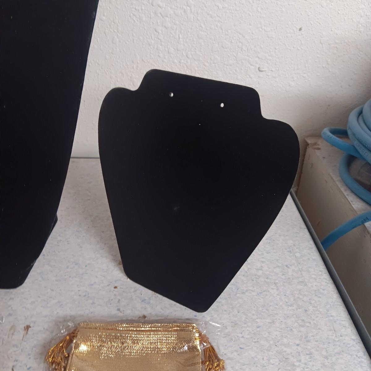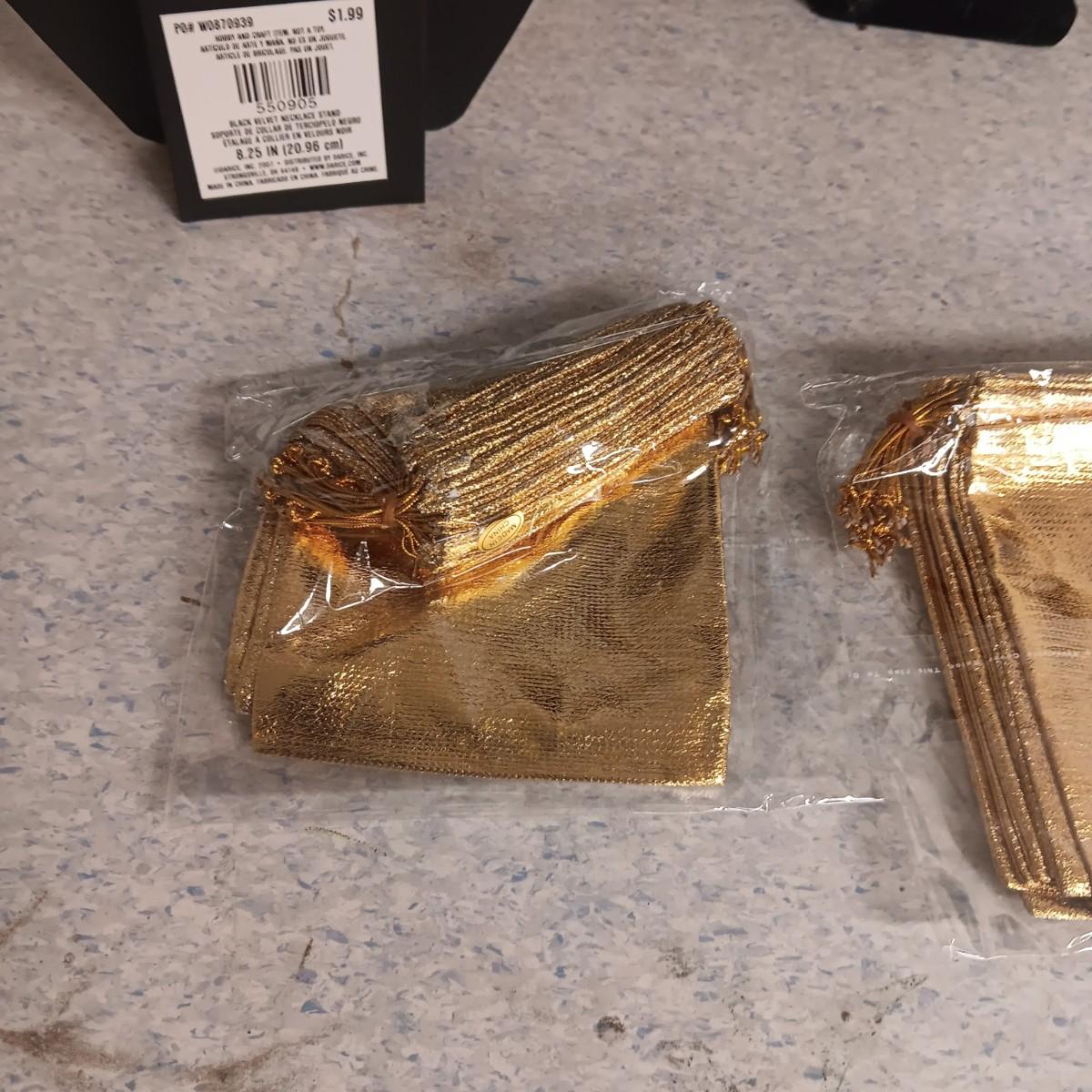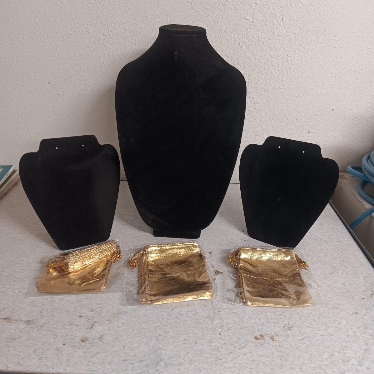 FREE STANDING JEWELRY DISPLAYS AND GOLD DRAWSTRING BAGS