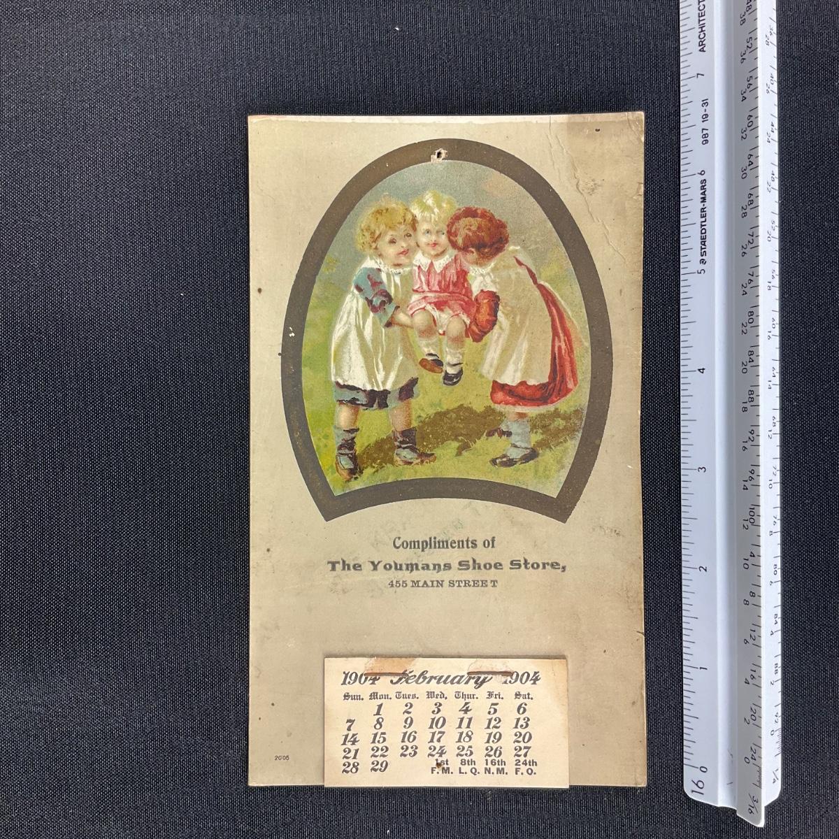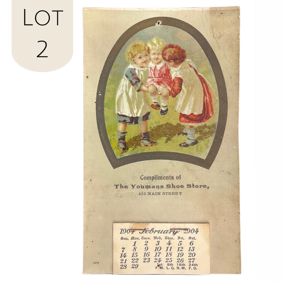 Delightful children playing together on this 1904 Youmans Shoe Store Calendar. Calendar is incomplete and shows February. **|** Please see photos for details and condition. ::: Shipping is available on this lot. If you require shipping you must let us know at the close of the auction. We will coordinate with you after the item has been won. Shipping fees will include insurance up to or exceeding the value of all items being mailed. If you have any questions regarding this lot please contact the auctioneer either via this website, by direct email or by phone. PICK UP TIMES and other important information can be found in the TERMS and DESCRIPTION of the auction. Please take a look for pertinent information. Thanks!