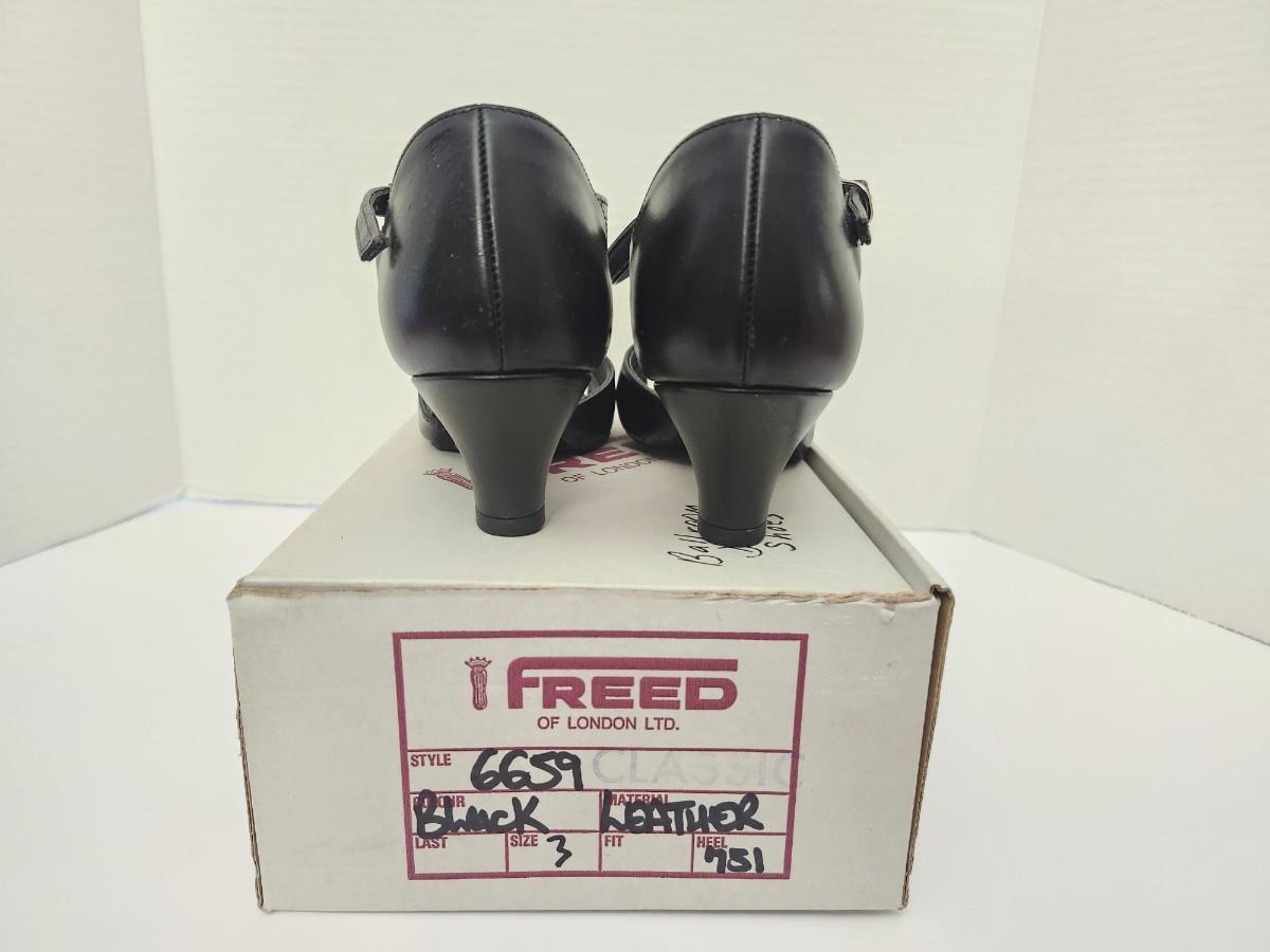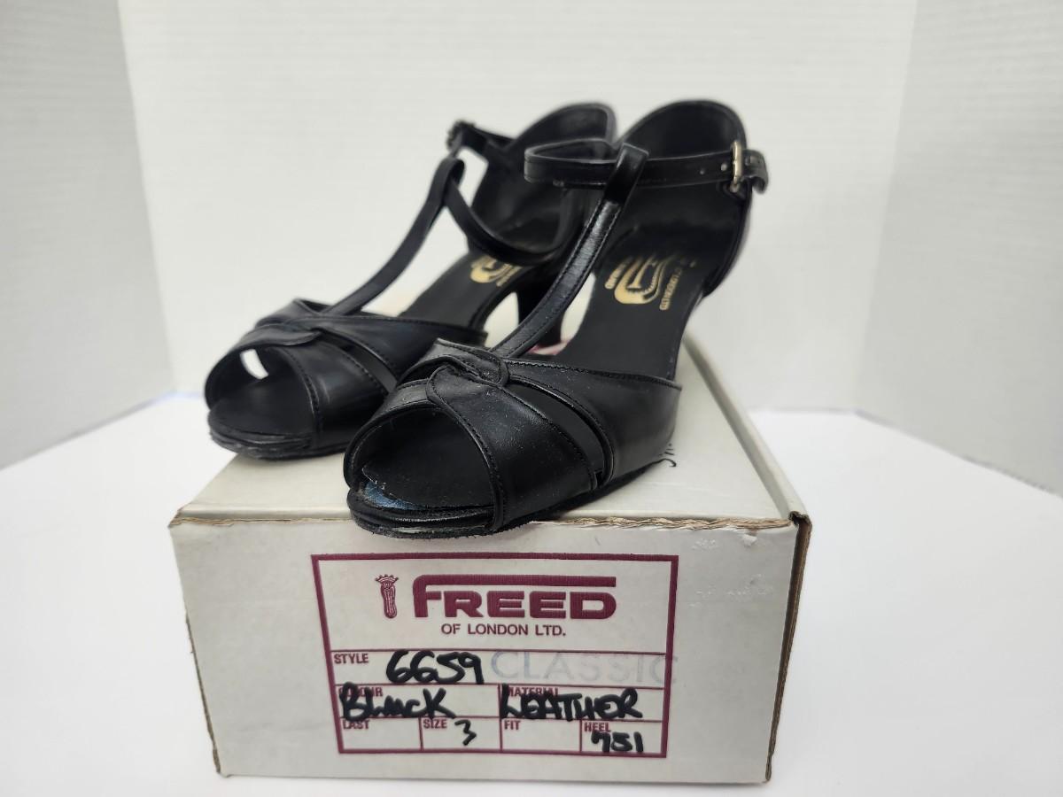 Freed of London women’s dance heels in black leather with T strap design, open toe front, and adjustable ankle buckle. Labeled style 6659 Classic in black leather, size 3, with heel marked 751 on original Freed of London box. Traditional character heel shape suitable for ballroom or dance use. Includes original Freed of London box as shown. Description based strictly on visible labels and photographs only.