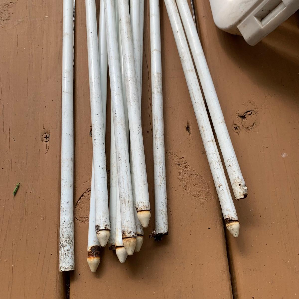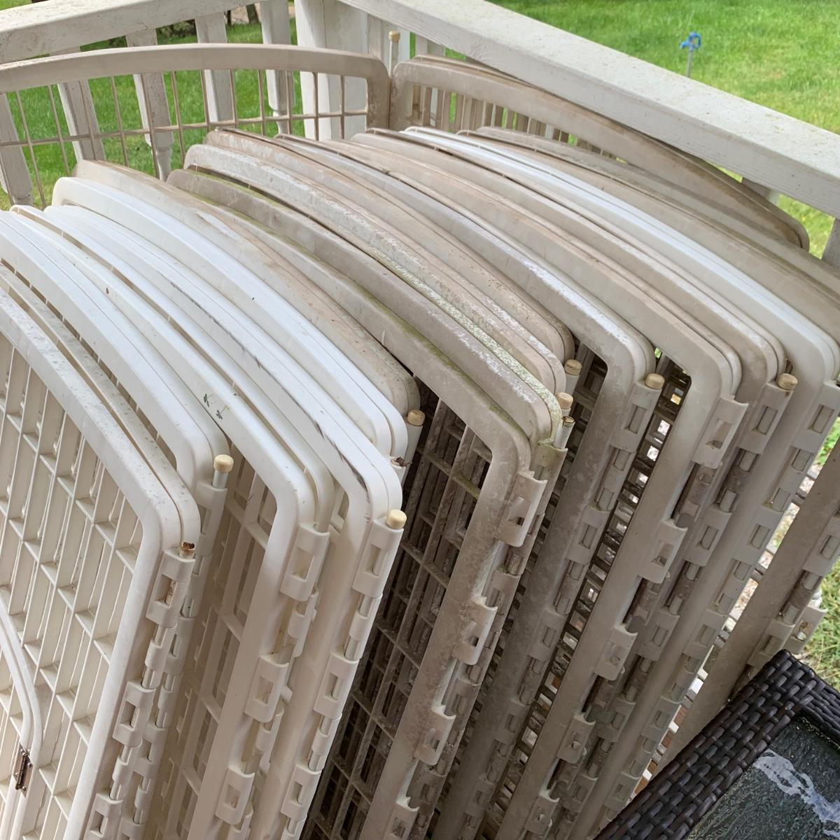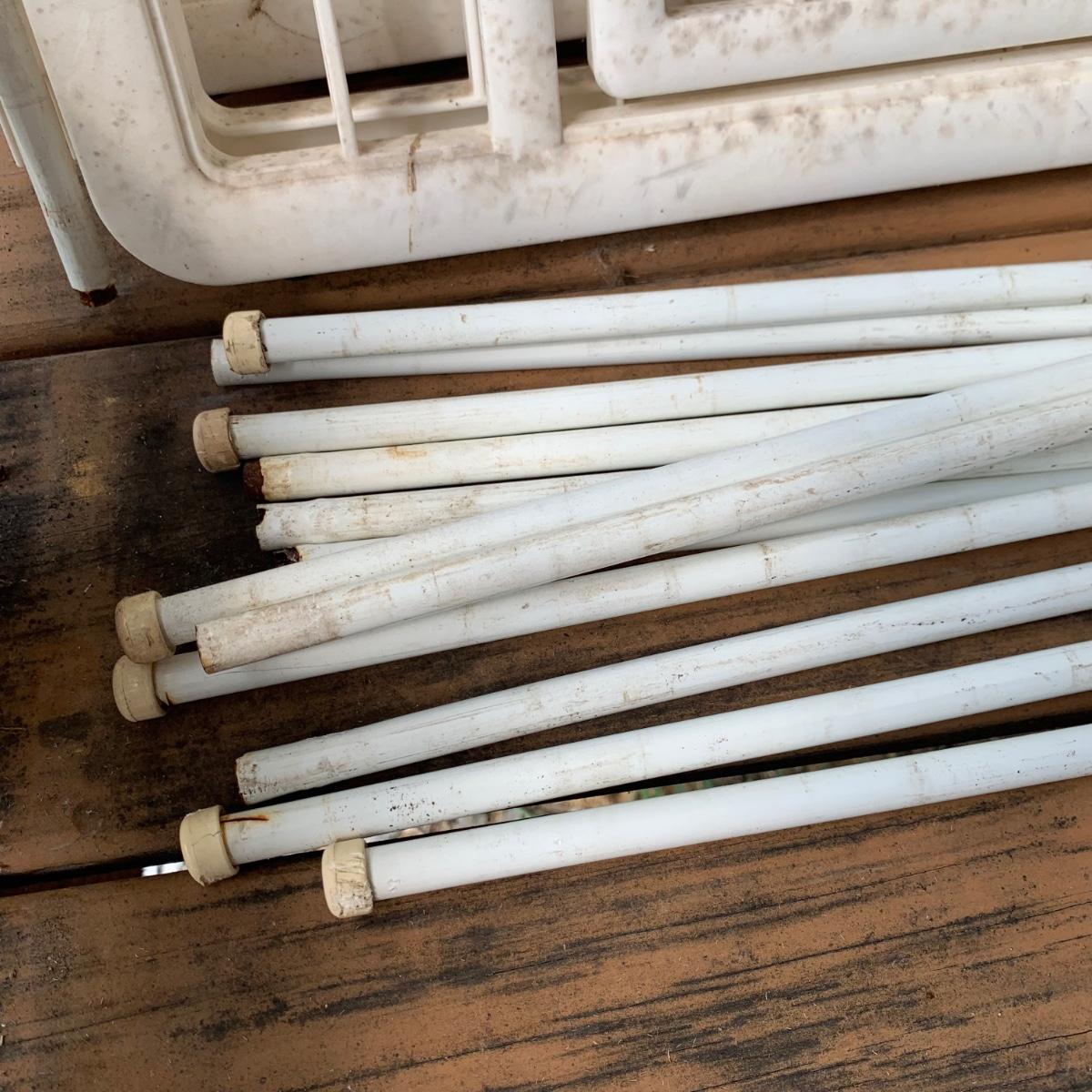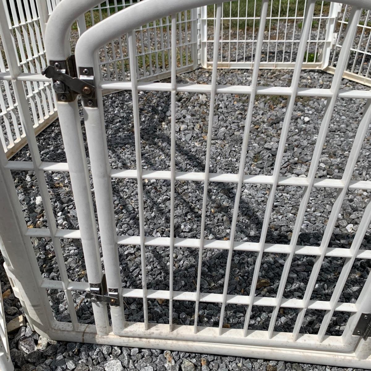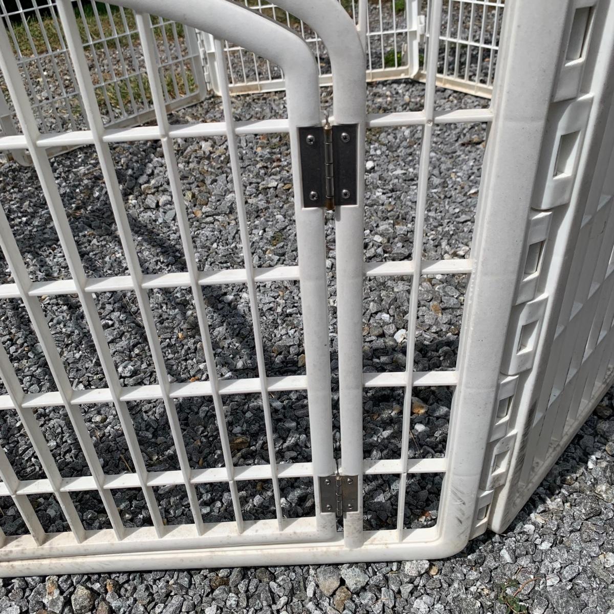 Freestanding white plastic fence with dog door. Plastic panels connect with metal rods. 36 plastic panels are included. Each panel is 25” x 33.5”H. Door opening is 15” x 20.5”H. Fencing has been used outside and some of the panels are quite stained, but still functional. Some of the metal rods are rusty and misshapen. We cannot guarantee that entire set of rods is present.