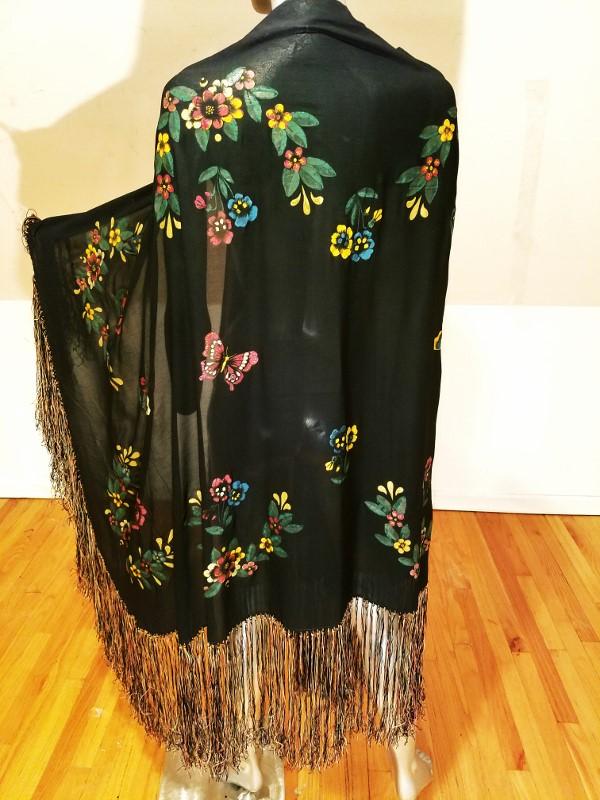 Very Rare silk crepe hand painted with gold very large silk Shawl/Pareo/dress Kimono from the late 1930's . Floral multi colored with multi colored silk very long fringes . Added is a Vintage crystal on gold tone Brooch that is magnificent. This is a very beautiful Wearable Art item from Old France.