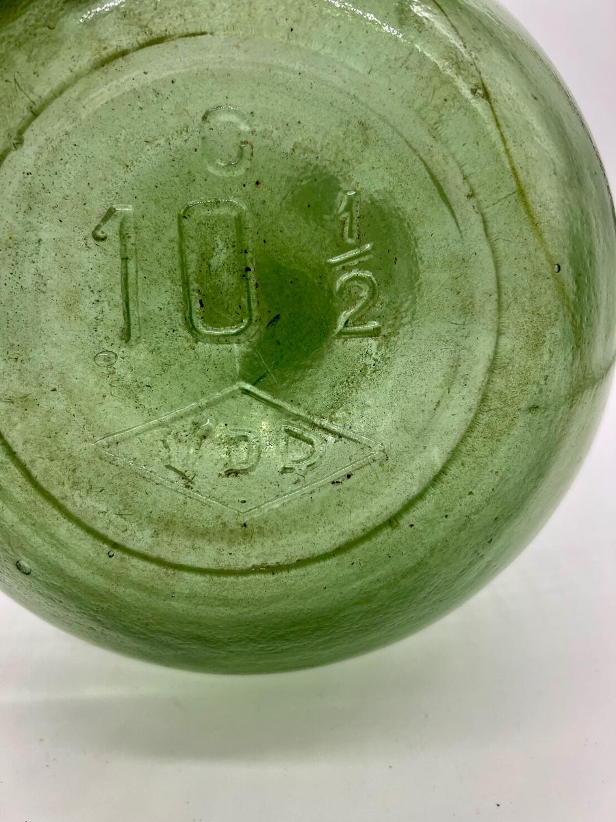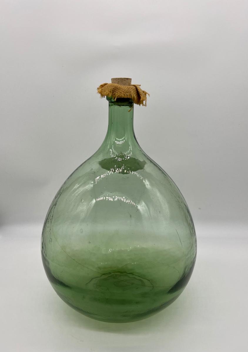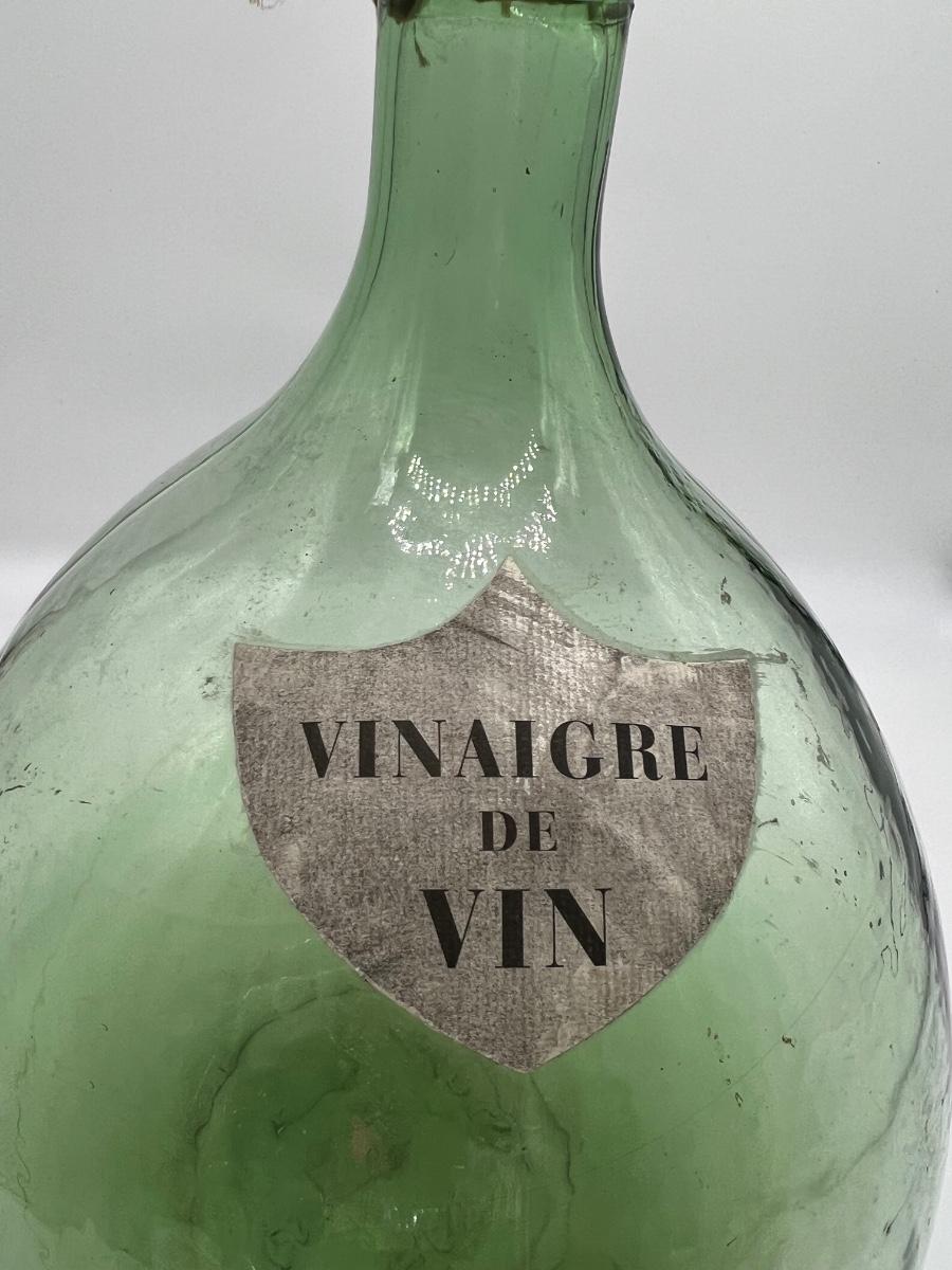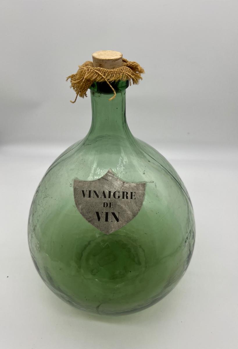 French Antique Large Demijohn Glass Bottle VINAIGRE DI VIN Measures 16 inches tall and 11 inches wide.