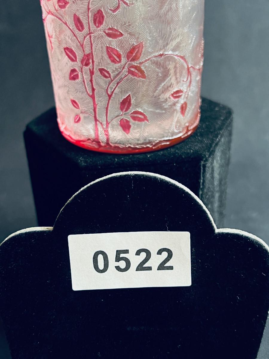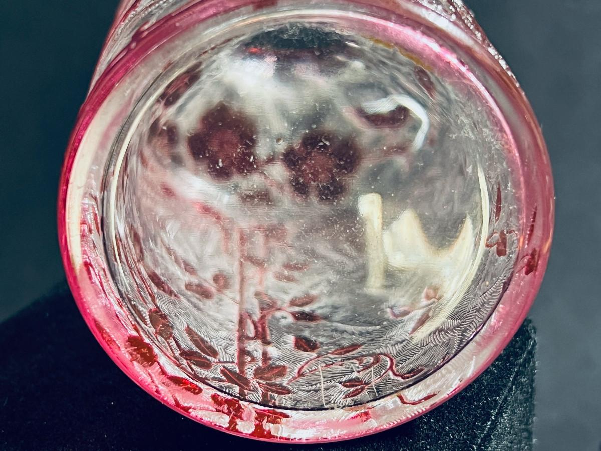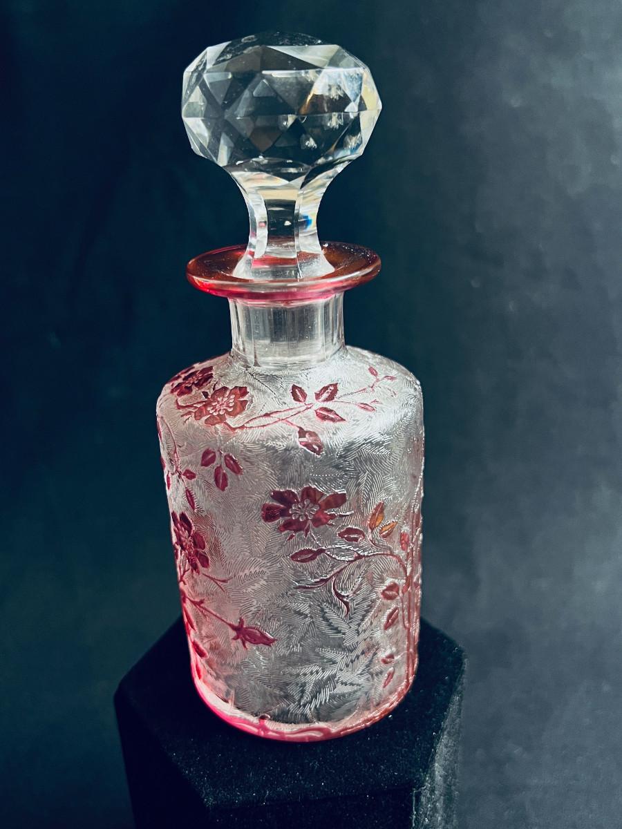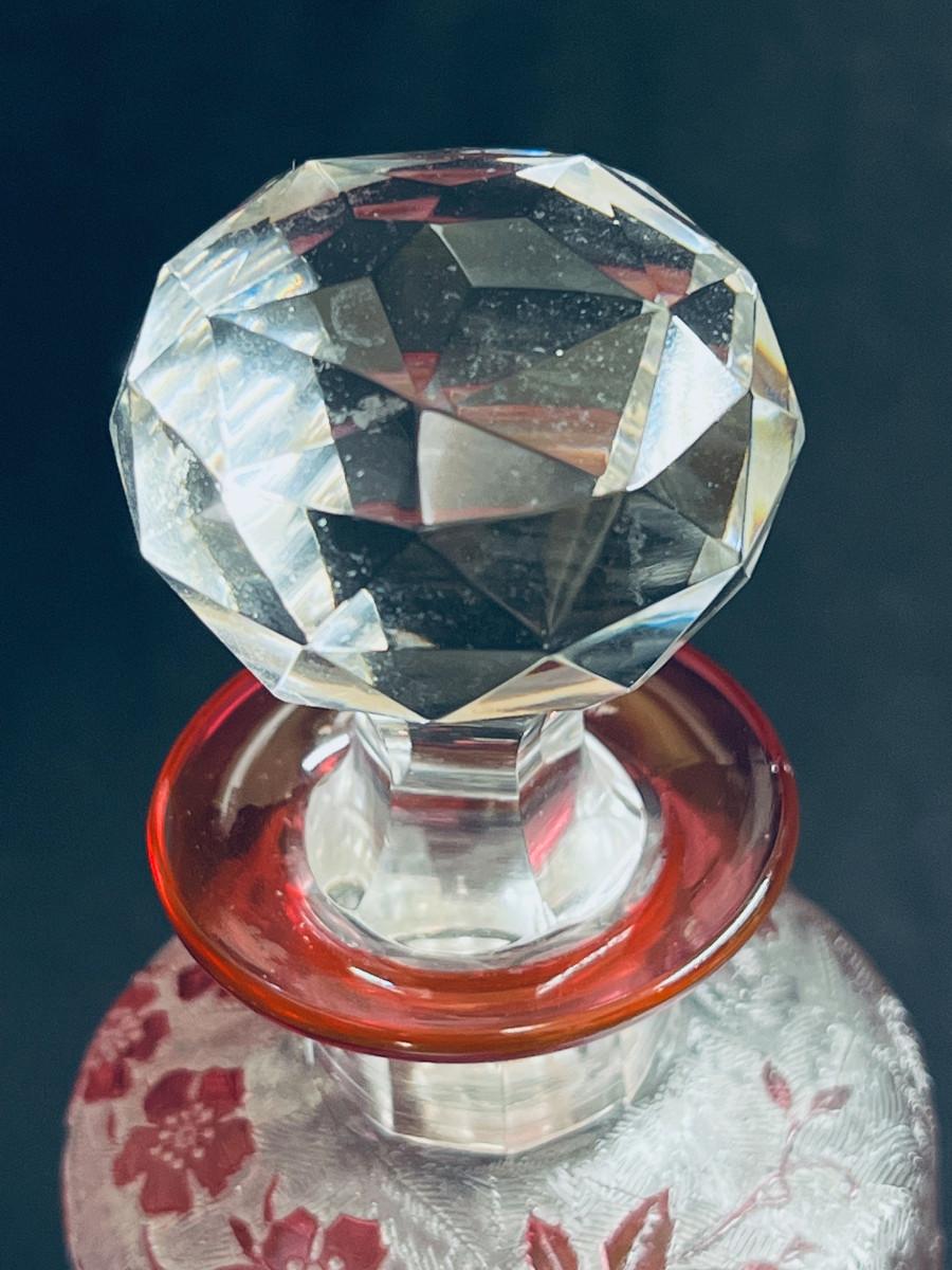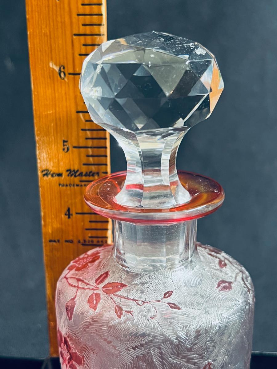 French cranberry cut-to-clear glass perfume / scent bottle, attributed to Baccarat, c.1900, Bottle with acid etched cameo floral branches against a textured ground. Molded, faceted stopper. Hande engraved in matching numbers or letters underfoot and on the stopper.