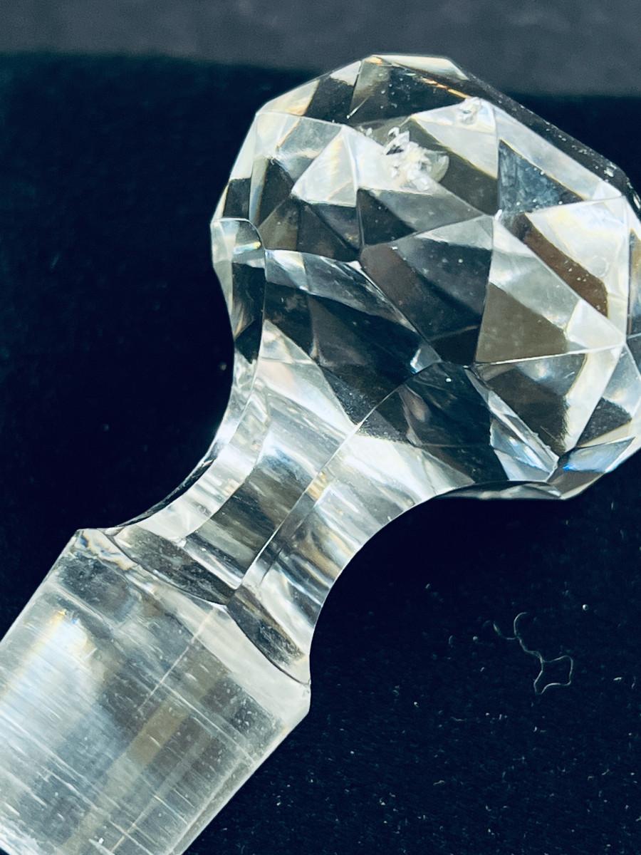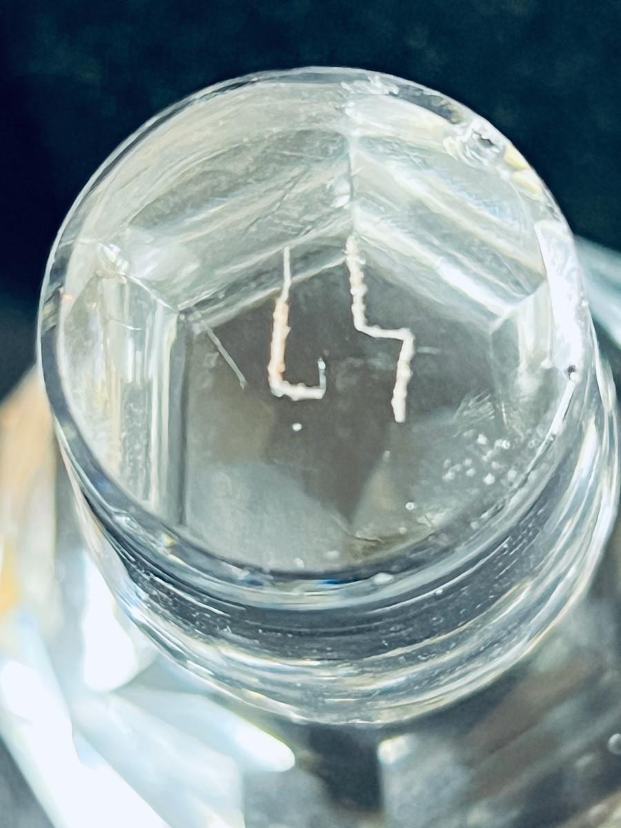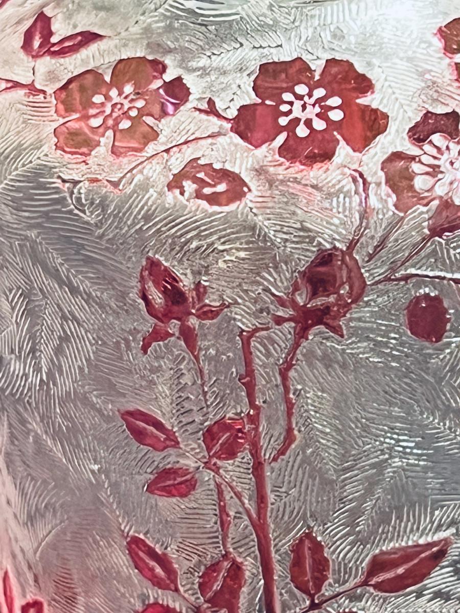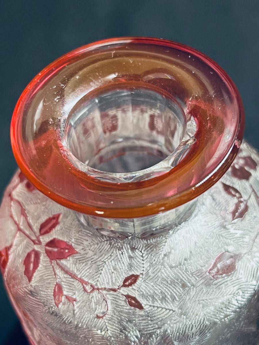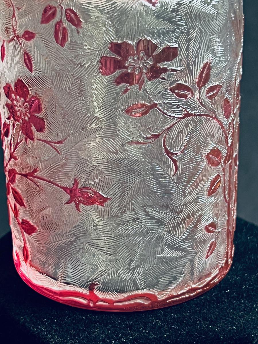 French cranberry cut-to-clear glass perfume / scent bottle, attributed to Baccarat, c.1900, Bottle with acid etched cameo floral branches against a textured ground. Molded, faceted stopper. Hande engraved in matching numbers or letters underfoot and on the stopper.