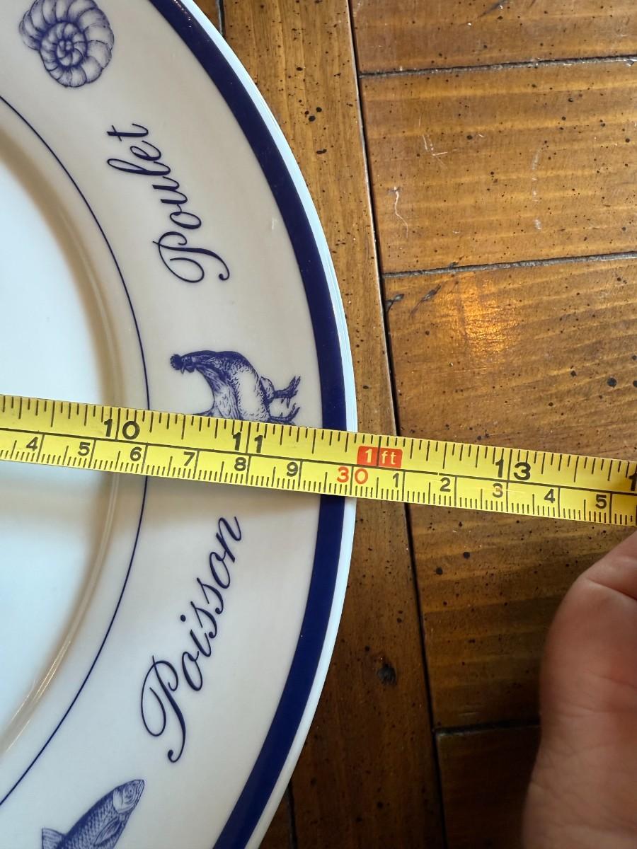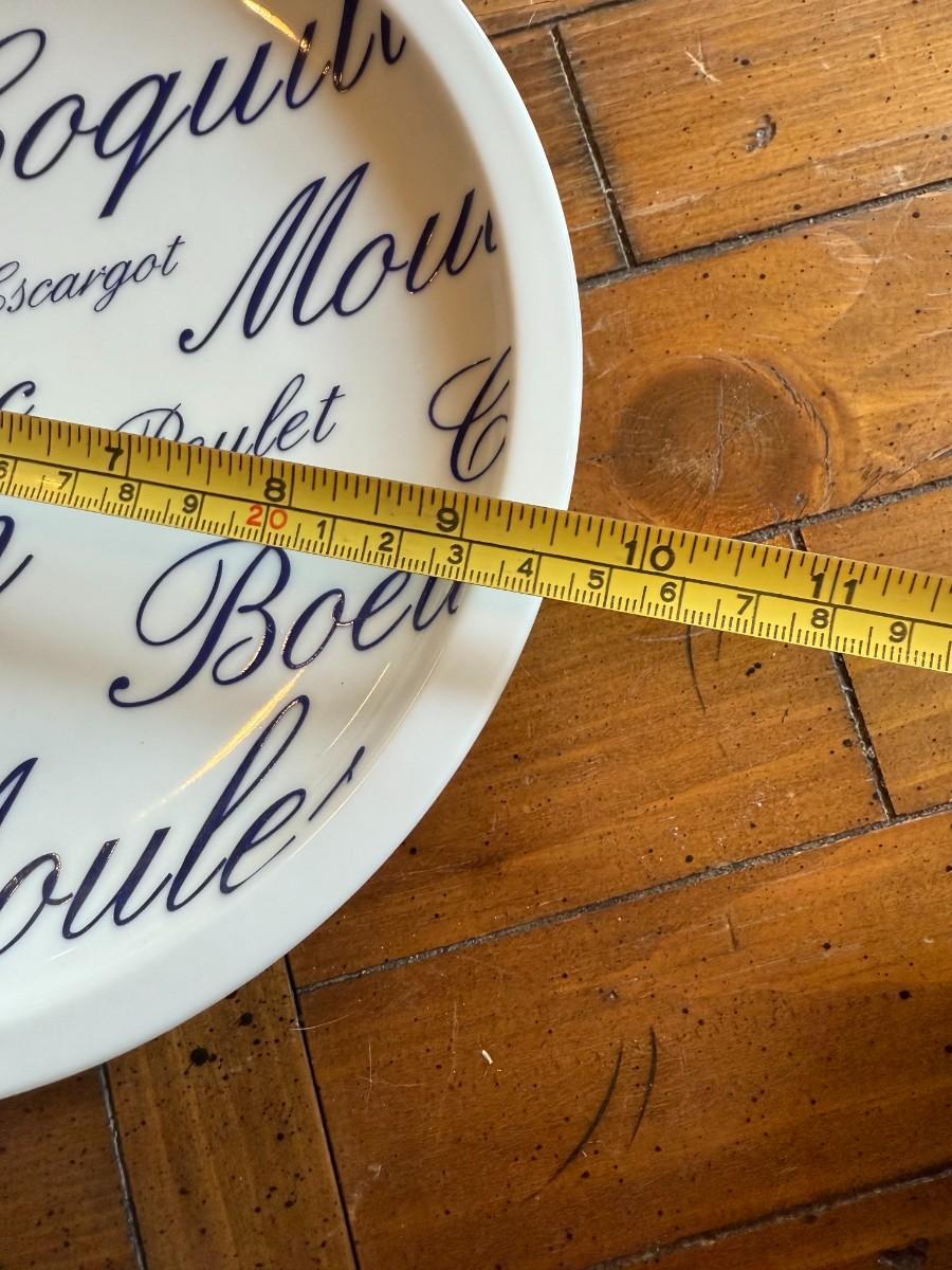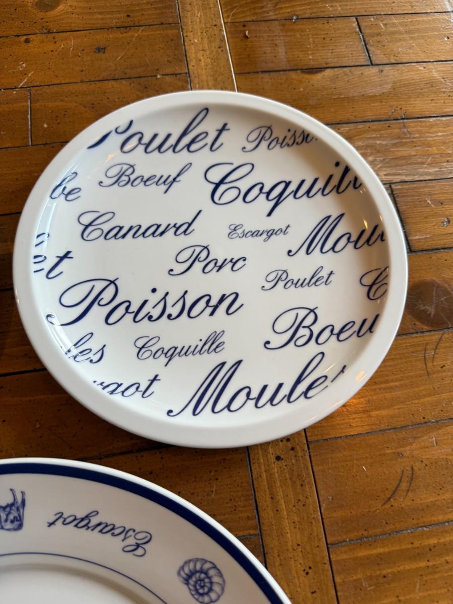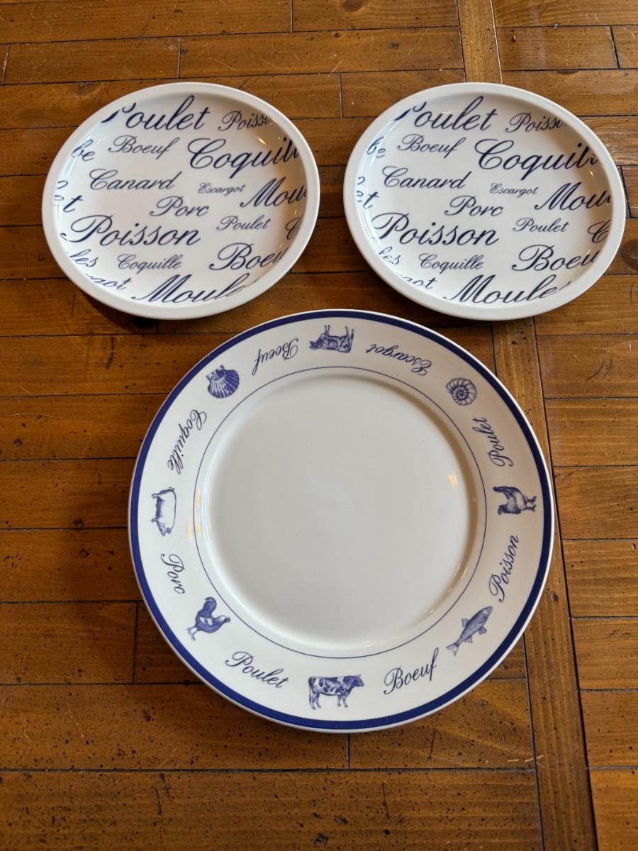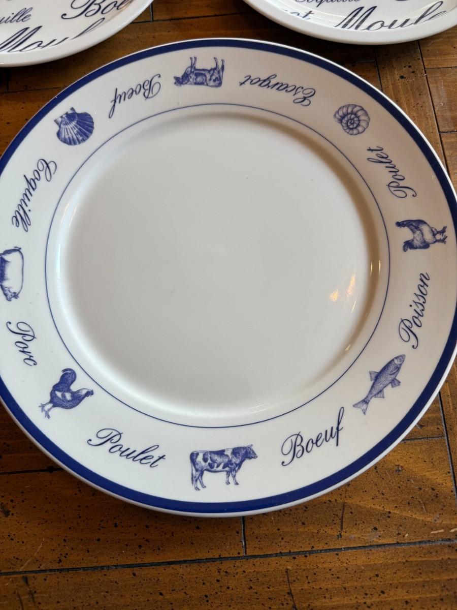 Classic white and blue ceramic plates with French words and illustrations for meats and seafood (Poulet, Boeuf, Poisson, etc.). Bistro-style charm for kitchen or display.