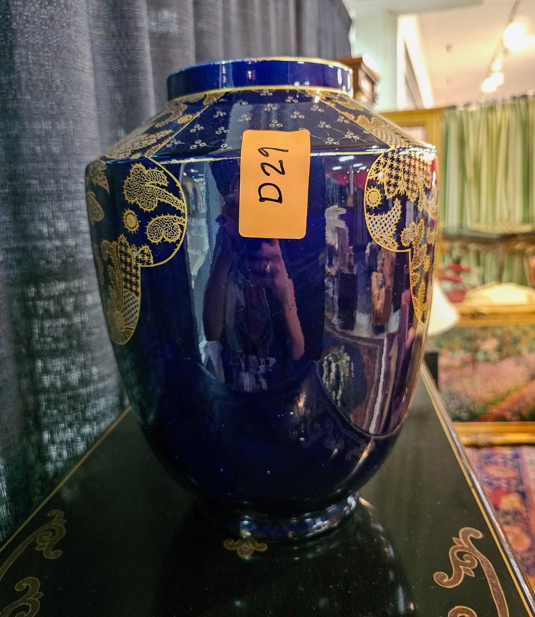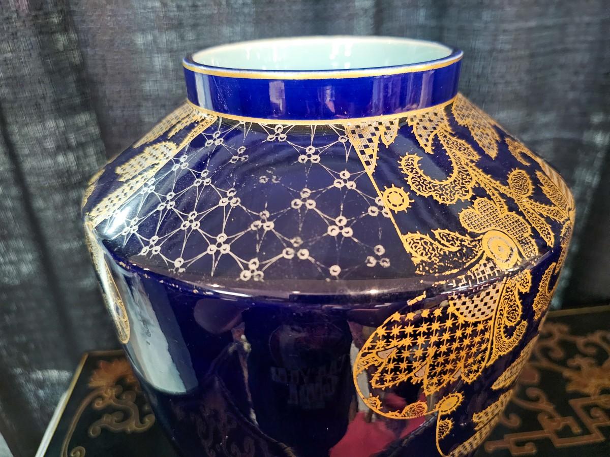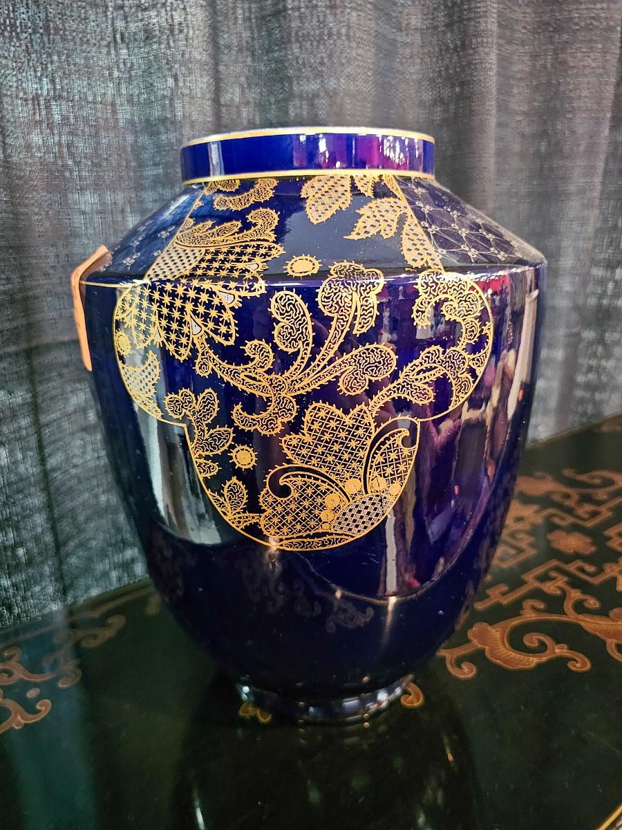 Cobalt & gilt vase by Sarreguemines. France, circa 1900, 5"W x 10"D x 12"H