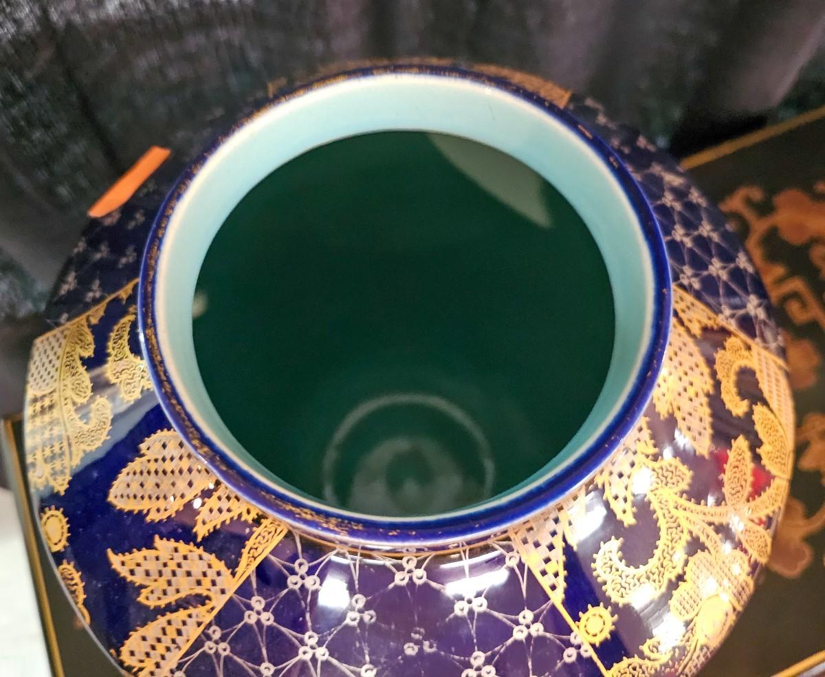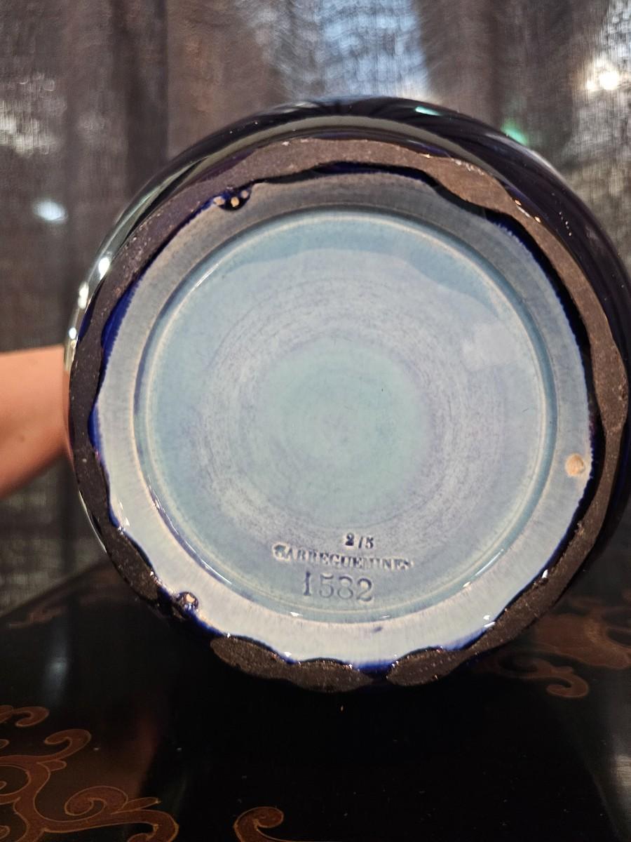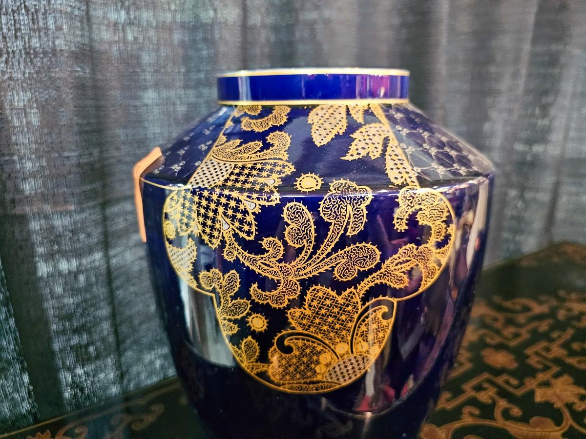 Cobalt & gilt vase by Sarreguemines. France, circa 1900, 5"W x 10"D x 12"H