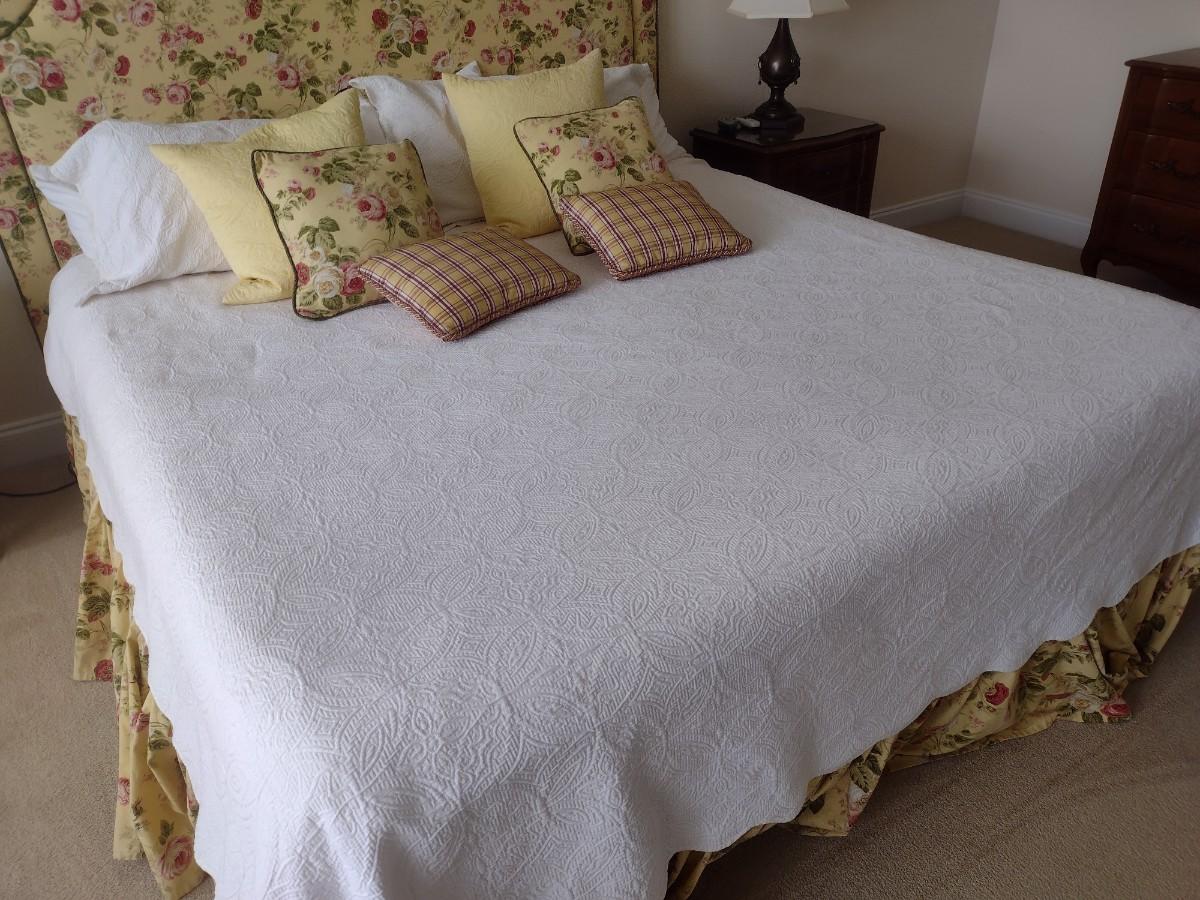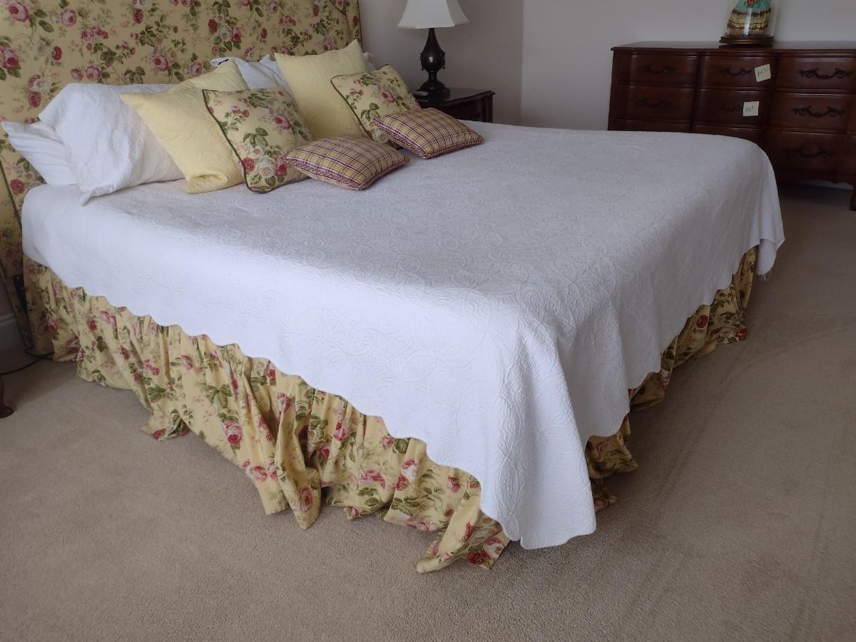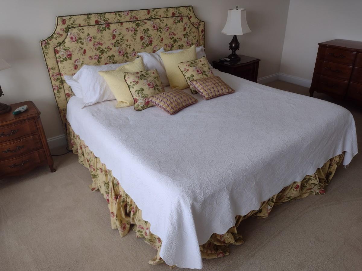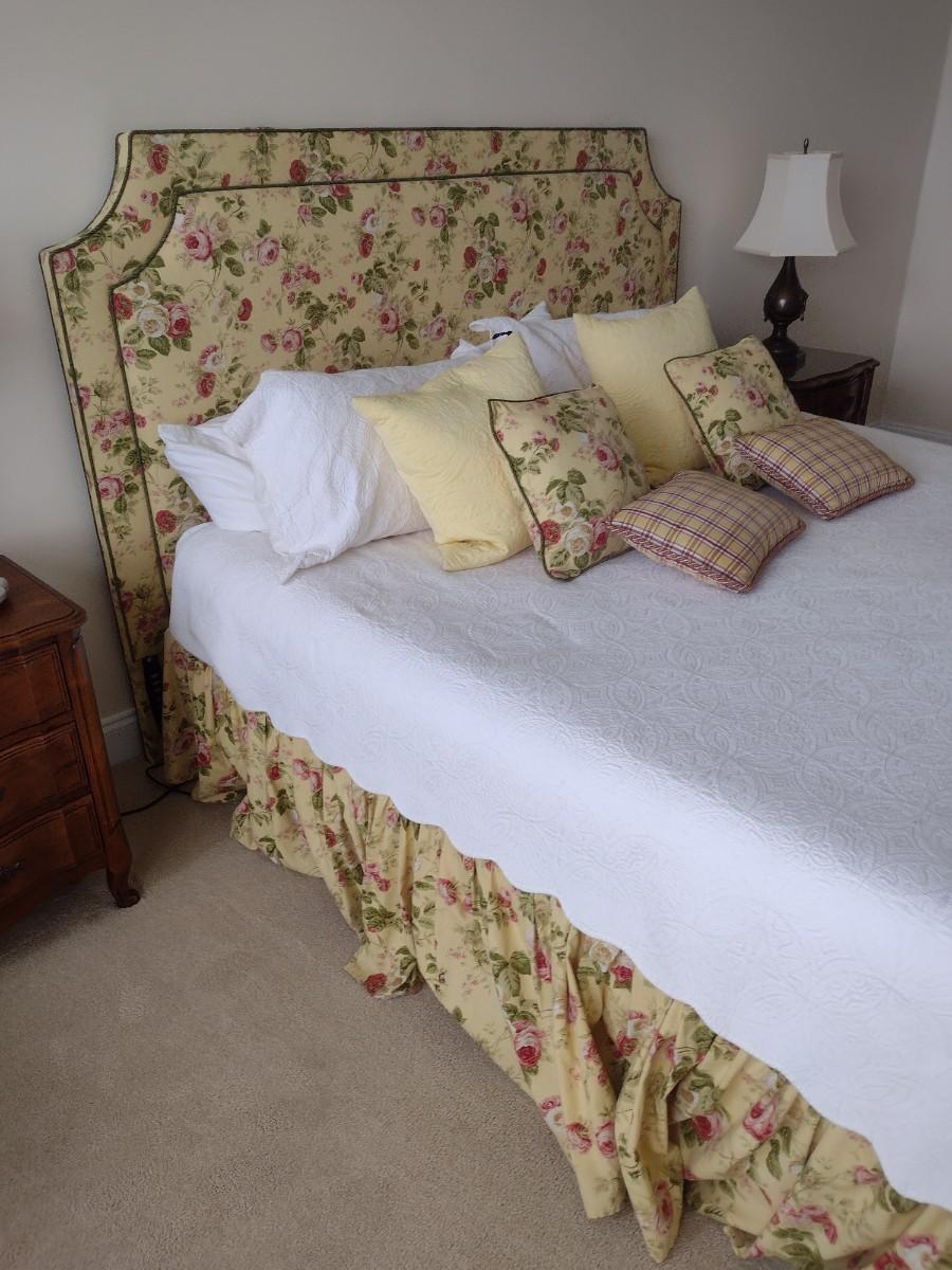 French Country Padded Headboard King Sized Bed and Mattress Set includes Bedding