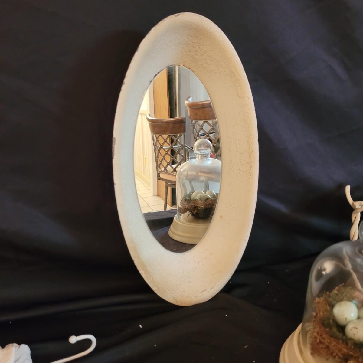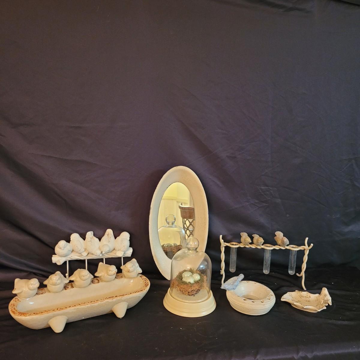 A sweet collection songbirds on coathooks, vases, bowls and dishes. The antique style oval mirror and bell jar bird’s nest rounds out this lot nicely. Mirror measures approximately 8” x 15”H. Shipping available.