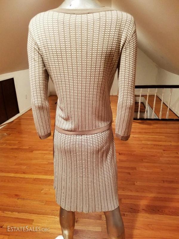 French designer Rodika Paris ensemble. Accordion pleats dress is very fluid and classic with the Chanel style jacket and gold plated designer buttons. on slash pockets. Classic for every occasion this one is magnificent.. worn only a few times.so it is like new.